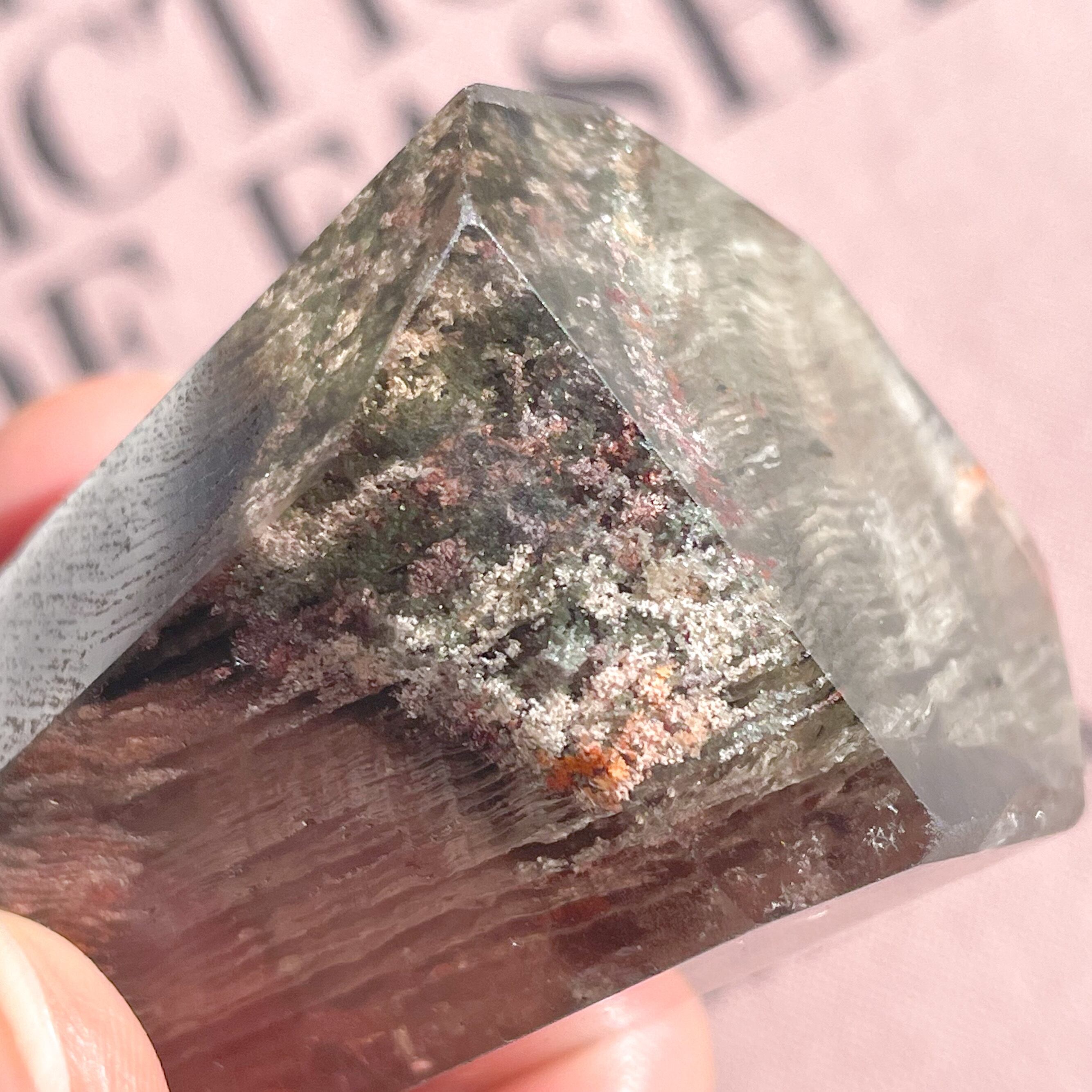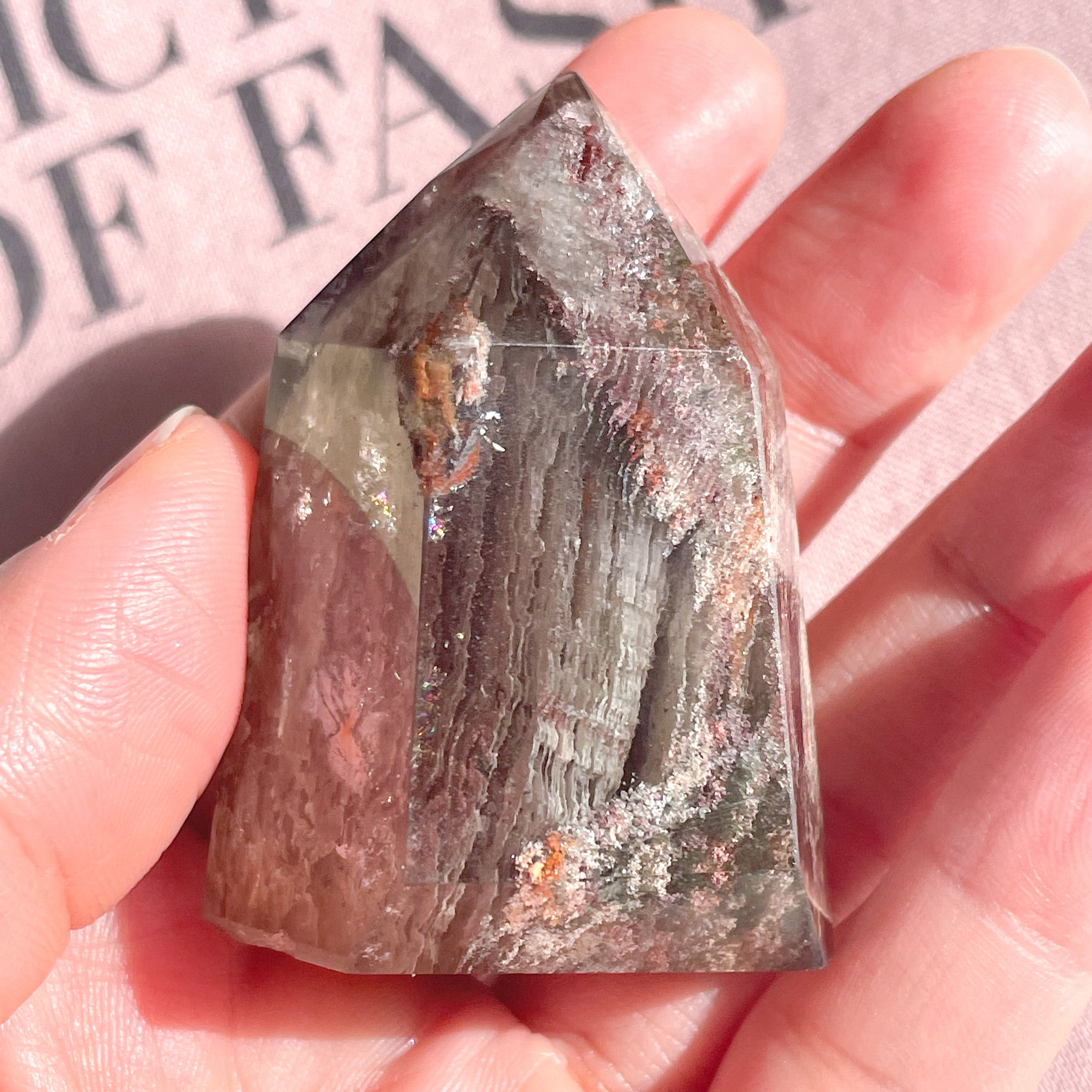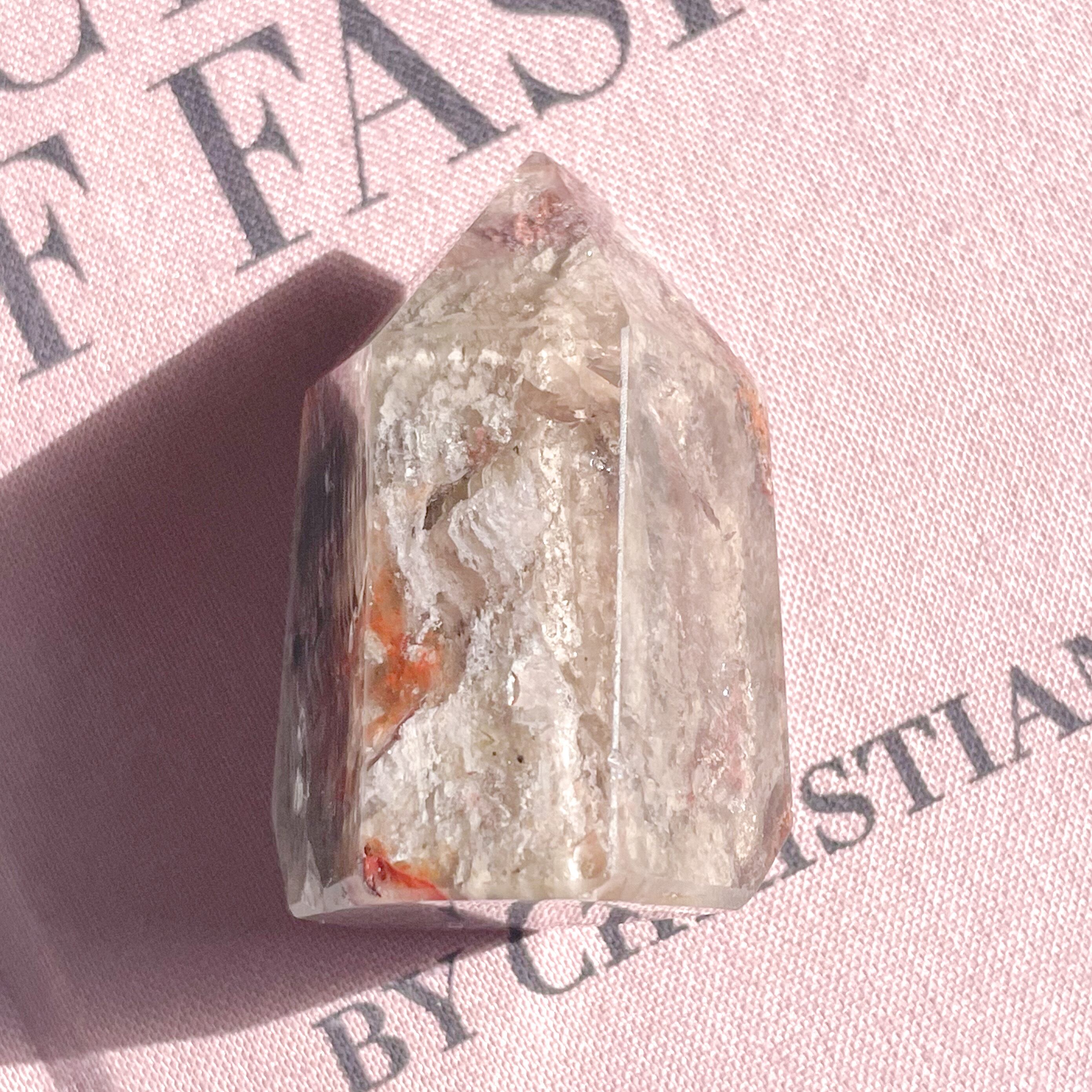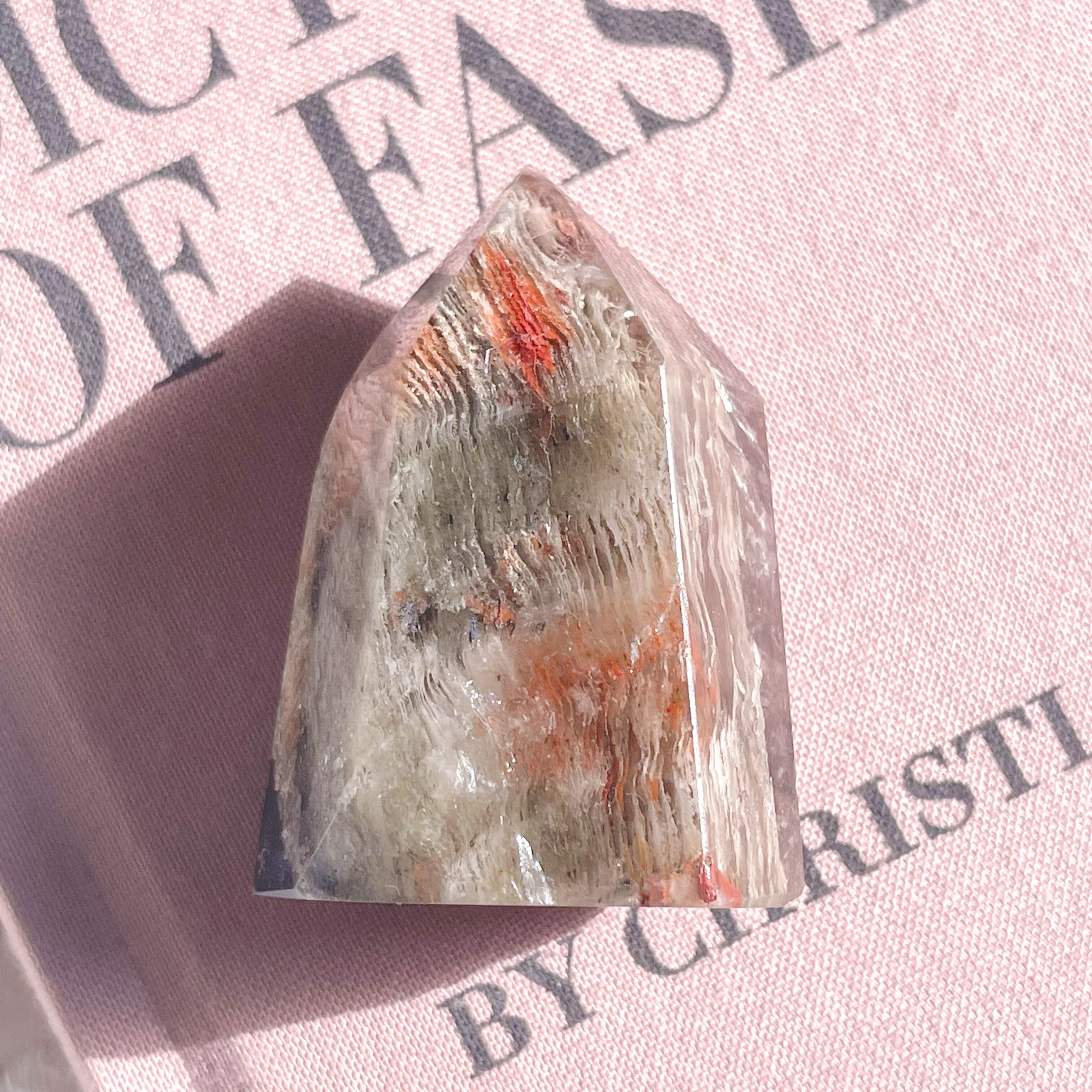 赤やオレンジのお花が咲いたような、美しい千層ガーデンクォーツ。日本名の「庭園水晶」という言葉がぴったりのポイント。
