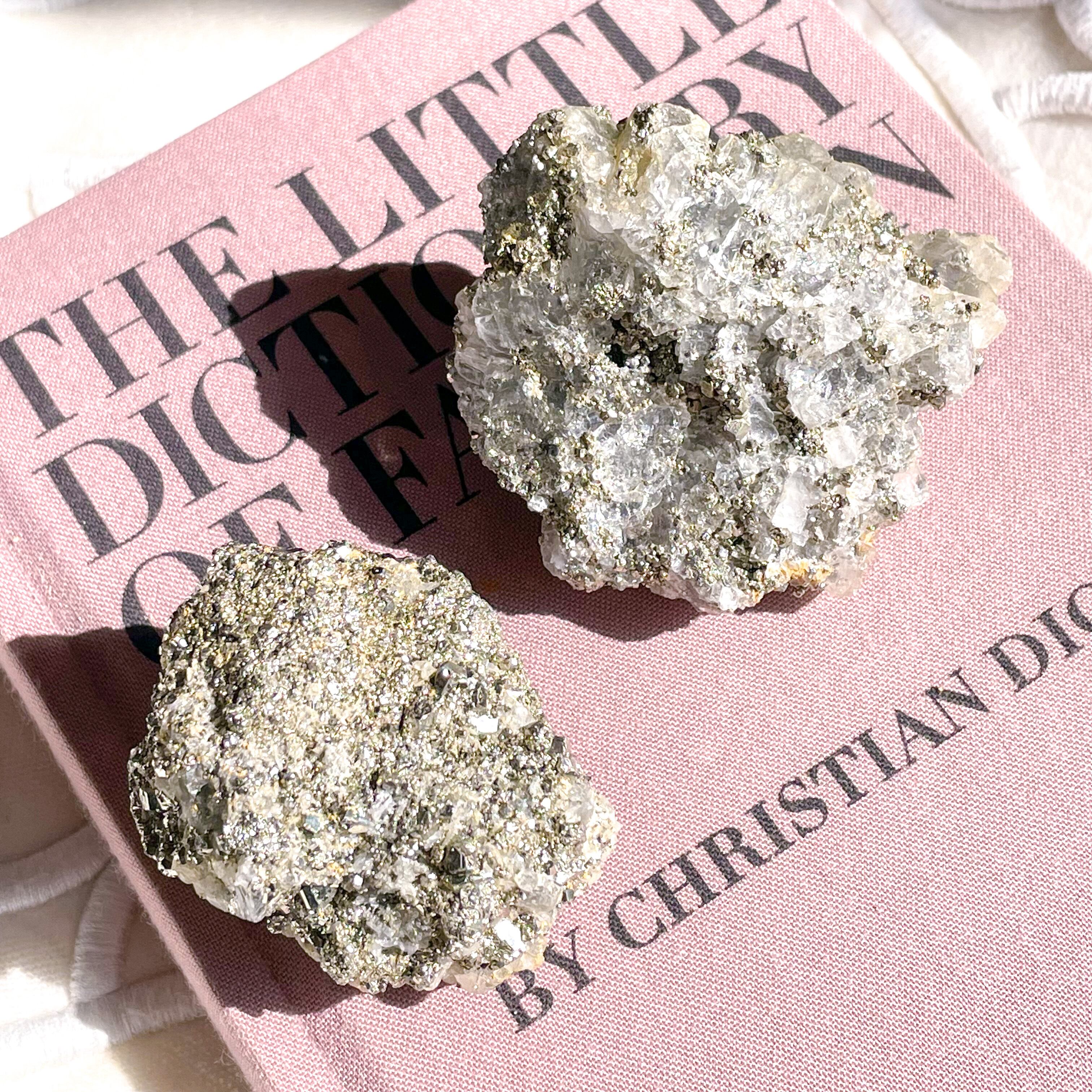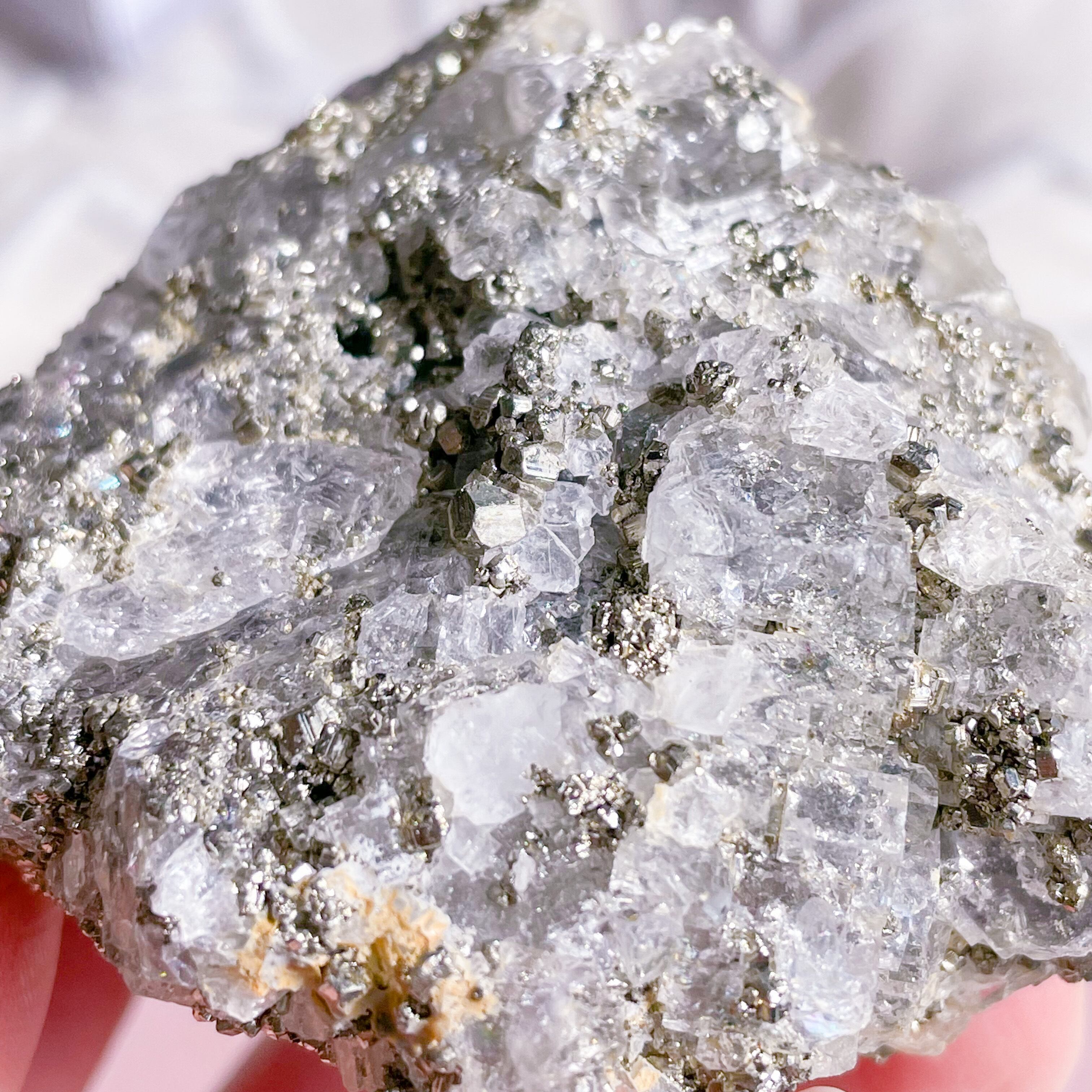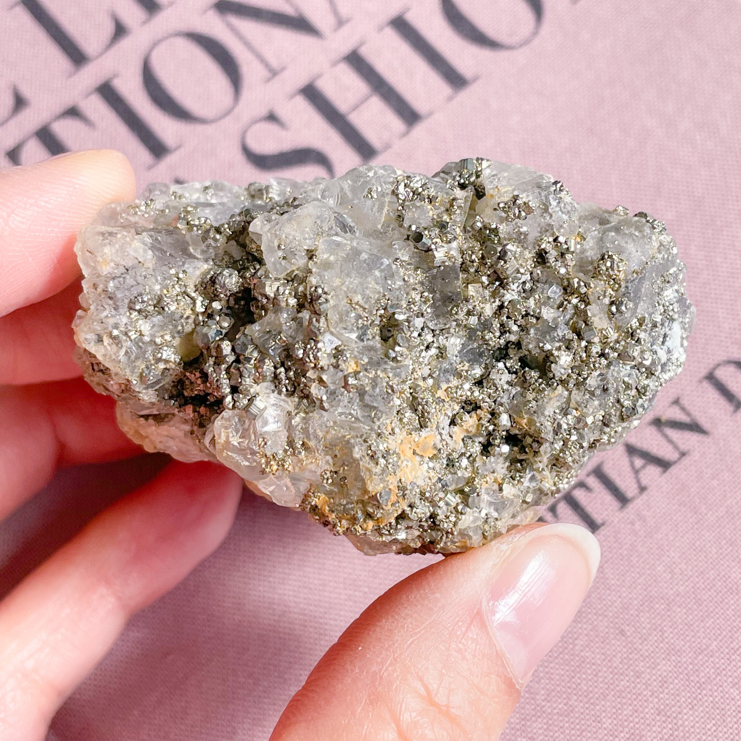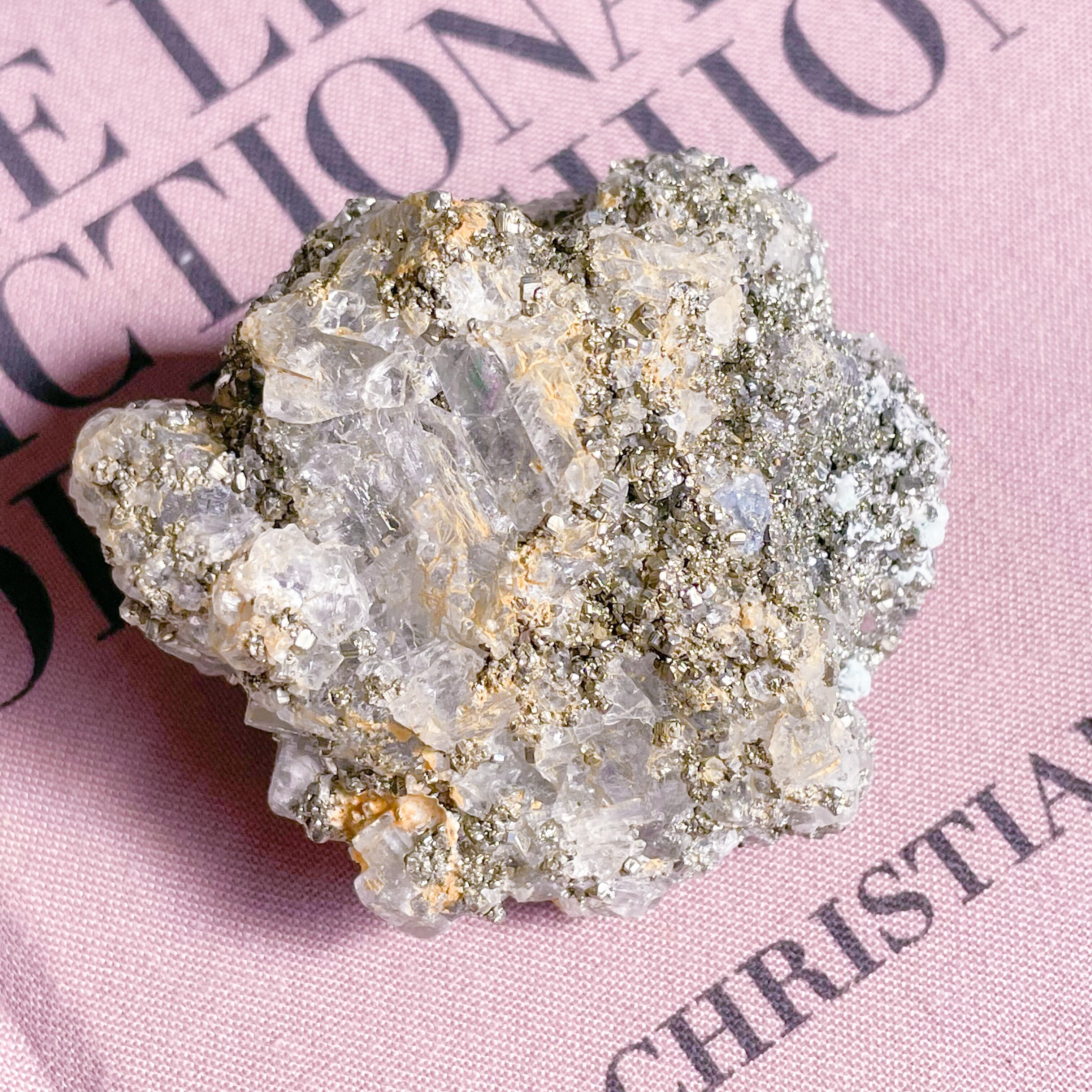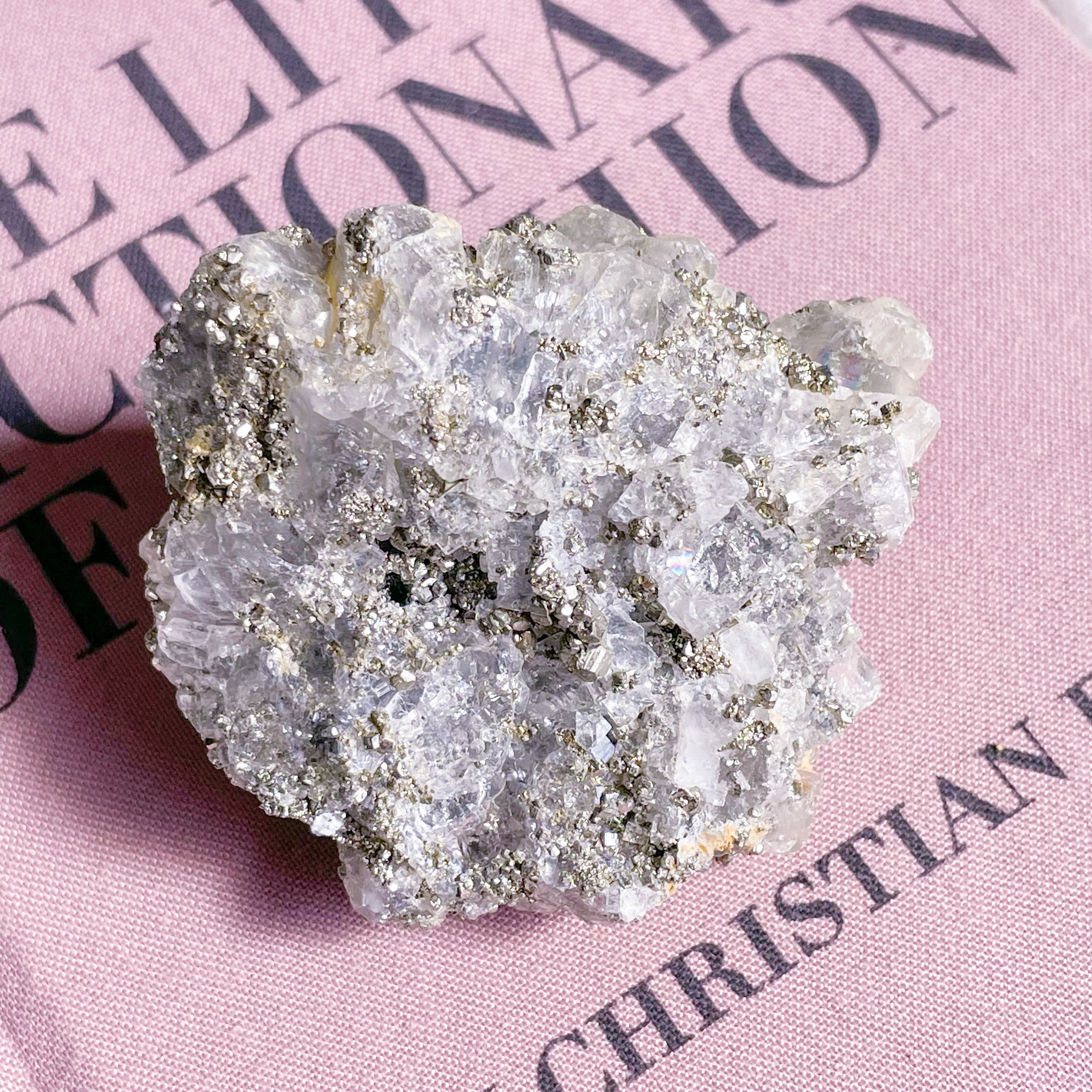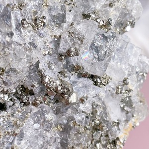 きらめくパイライトが、カラーレスフローライトの上に散りばめられた、めずらしい共生原石。