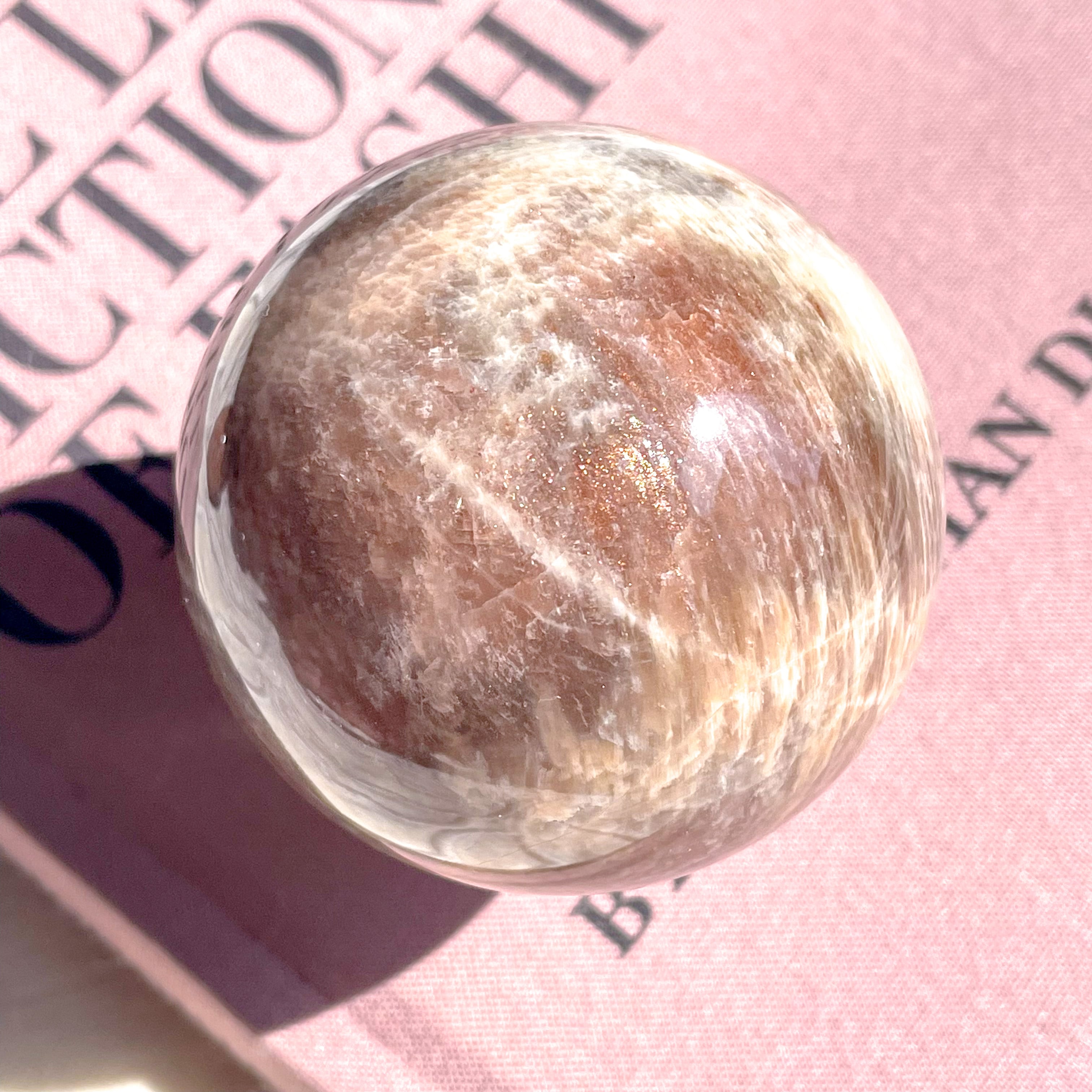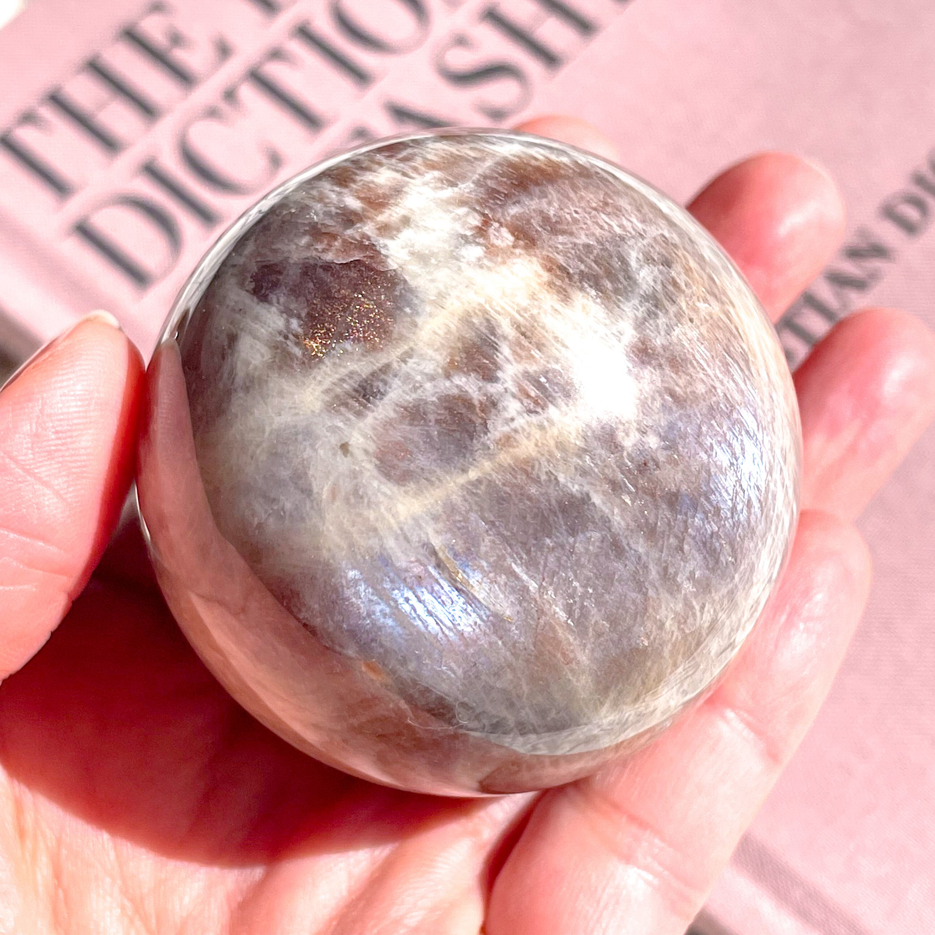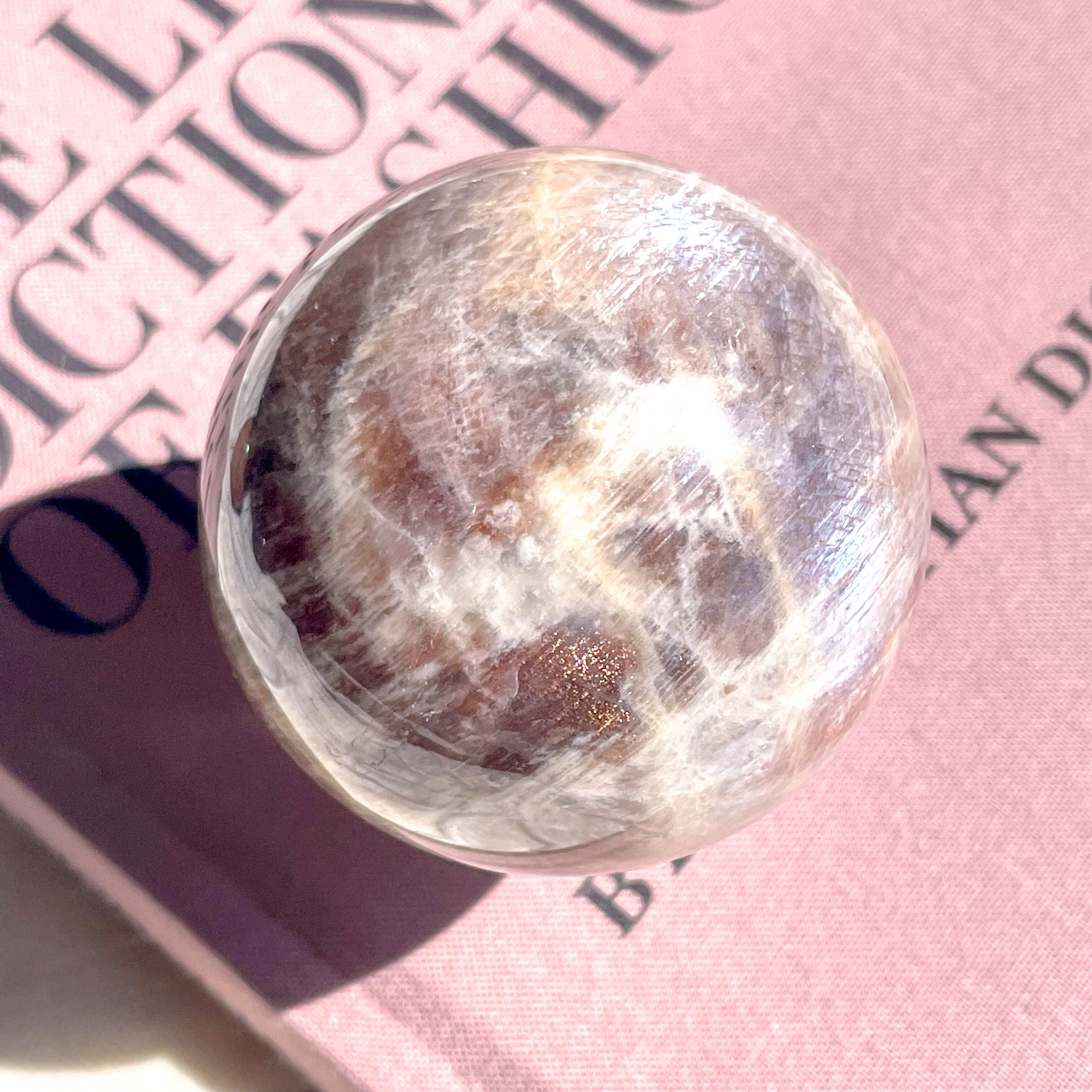 サンストーンの特徴である、シャンパンゴールド色に煌めくアベンチュレッセンス効果と、ムーンストーンに特徴的な、静かな光・青色のイリデッセンス効果、このふたつを併せ持つ、神秘的なストーンです♡