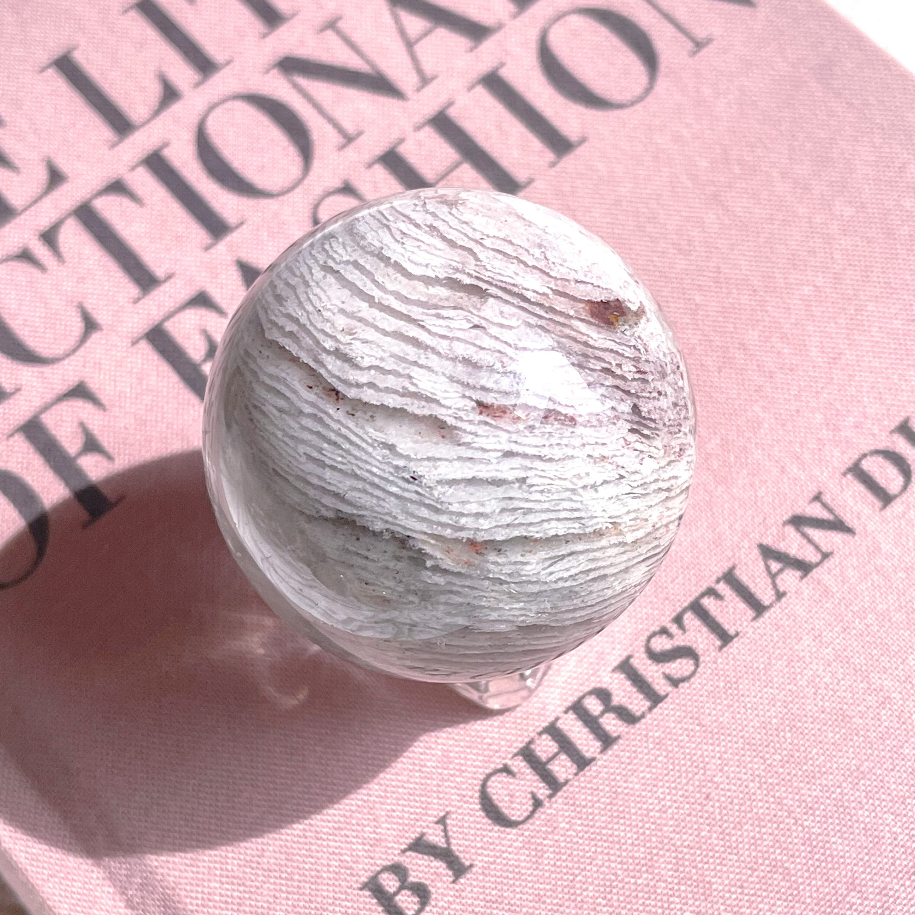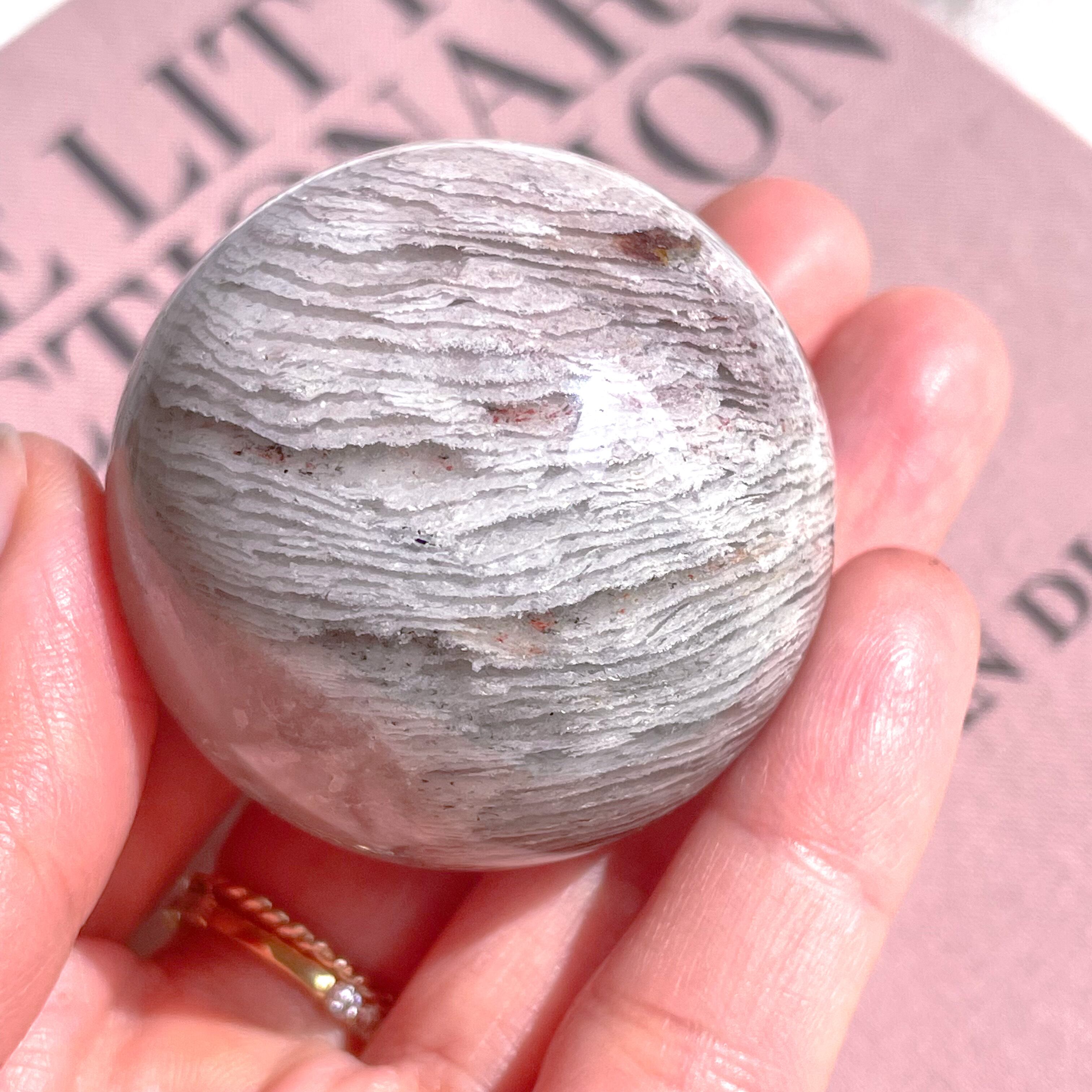 グレイッシュはホワイトから柔らかいホワイト、ピンク、ローズレッドへ美しいグラデーションをみせてくれます。クォーツの部分が春霞のような奥行きを持たせ、虹も入る、うっとりと見惚れていたいスフィアです。