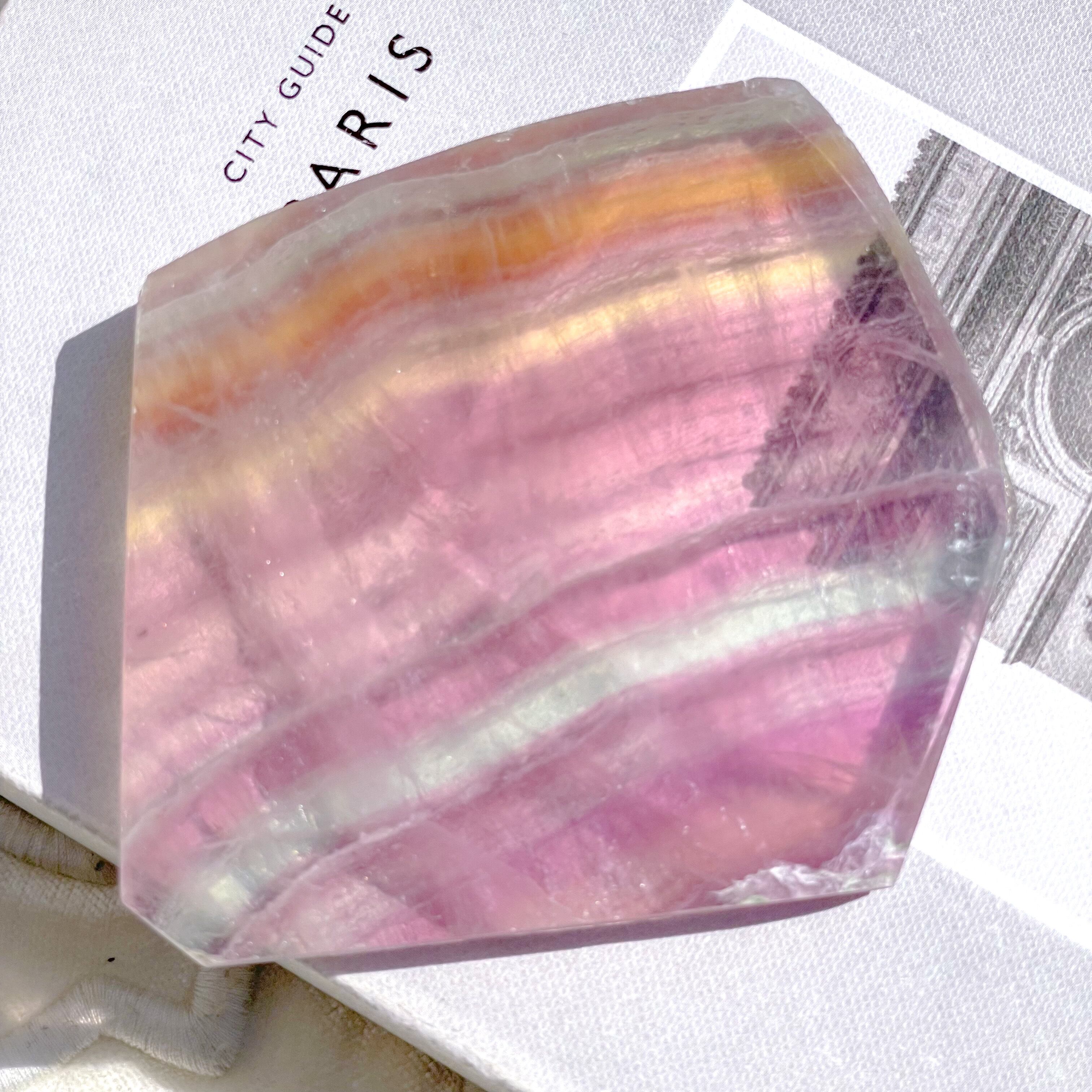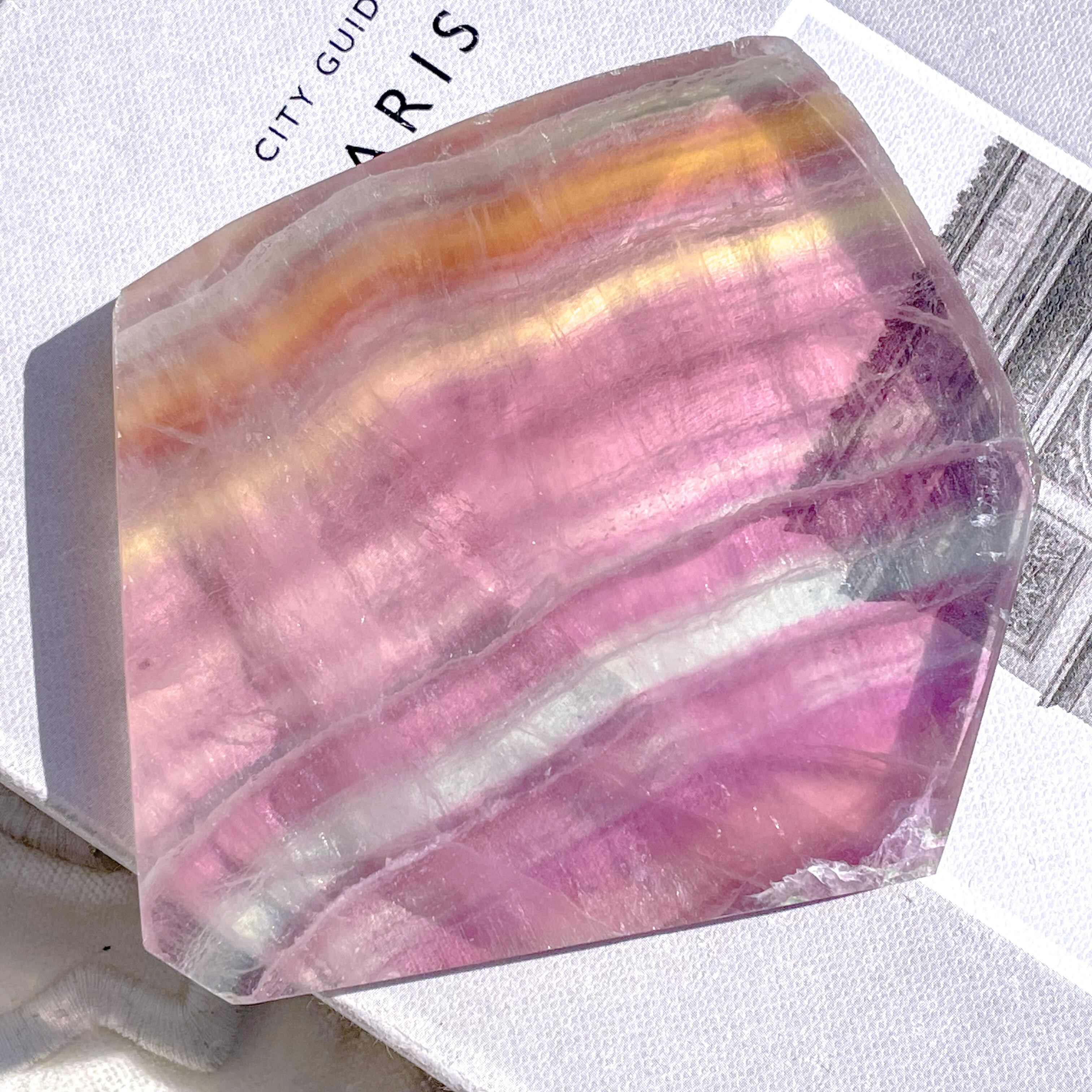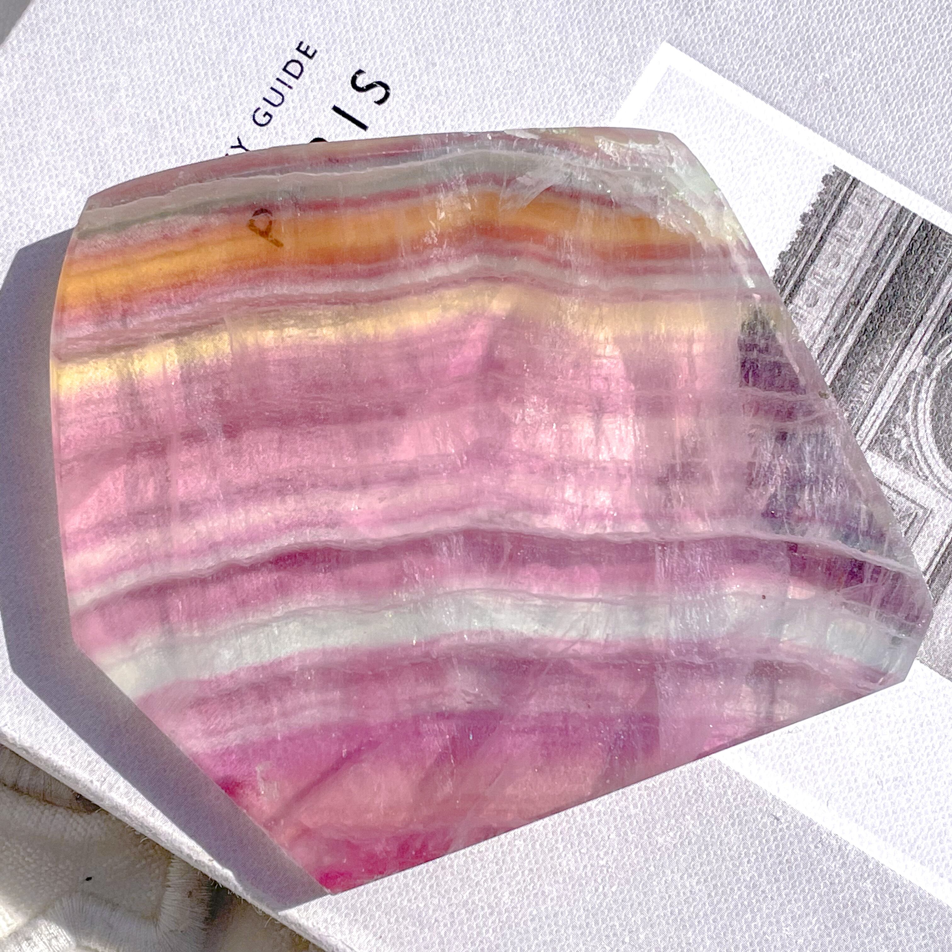 ピンクをメインにカラフルな色の層がハッピーな、ピンクフローライトのプレートです。