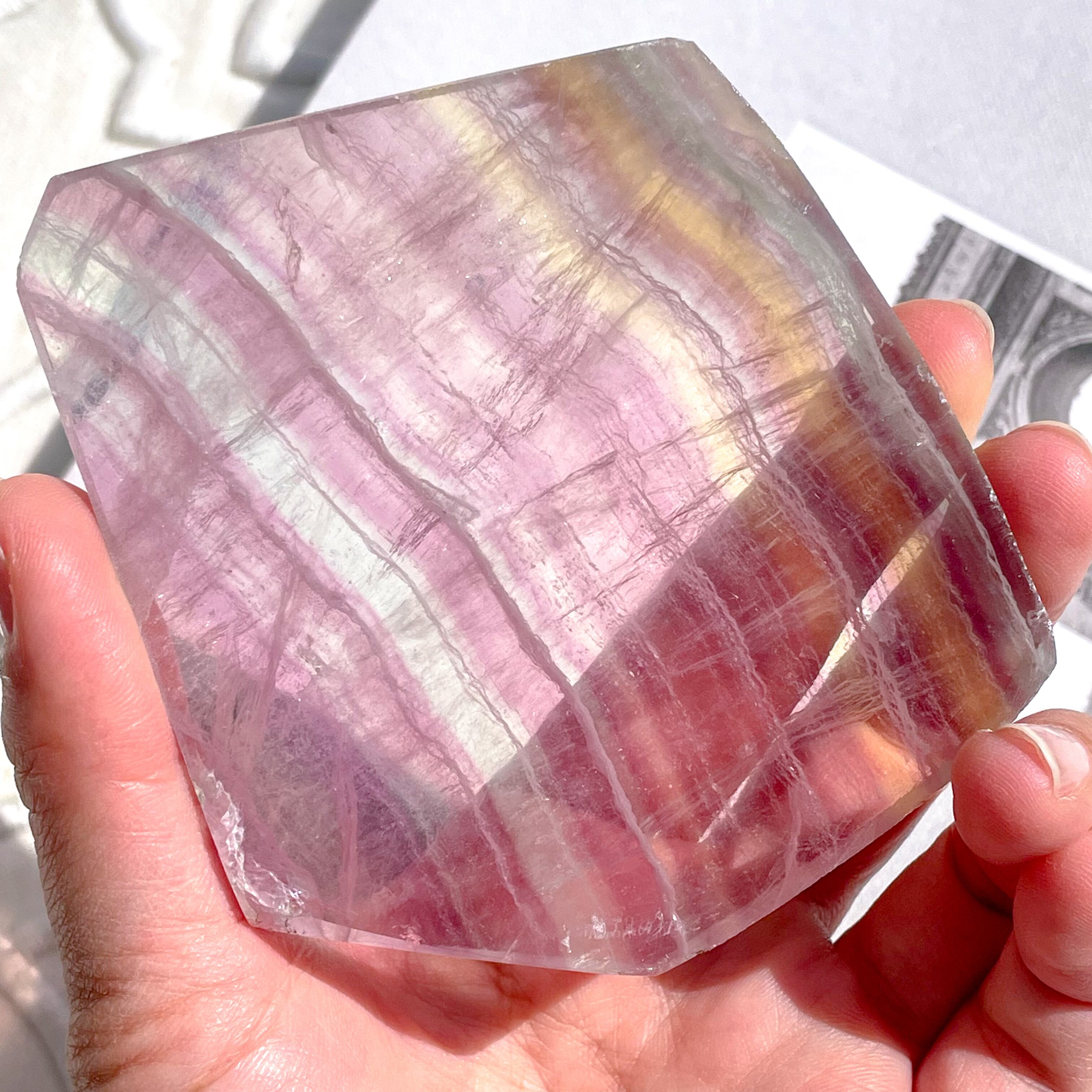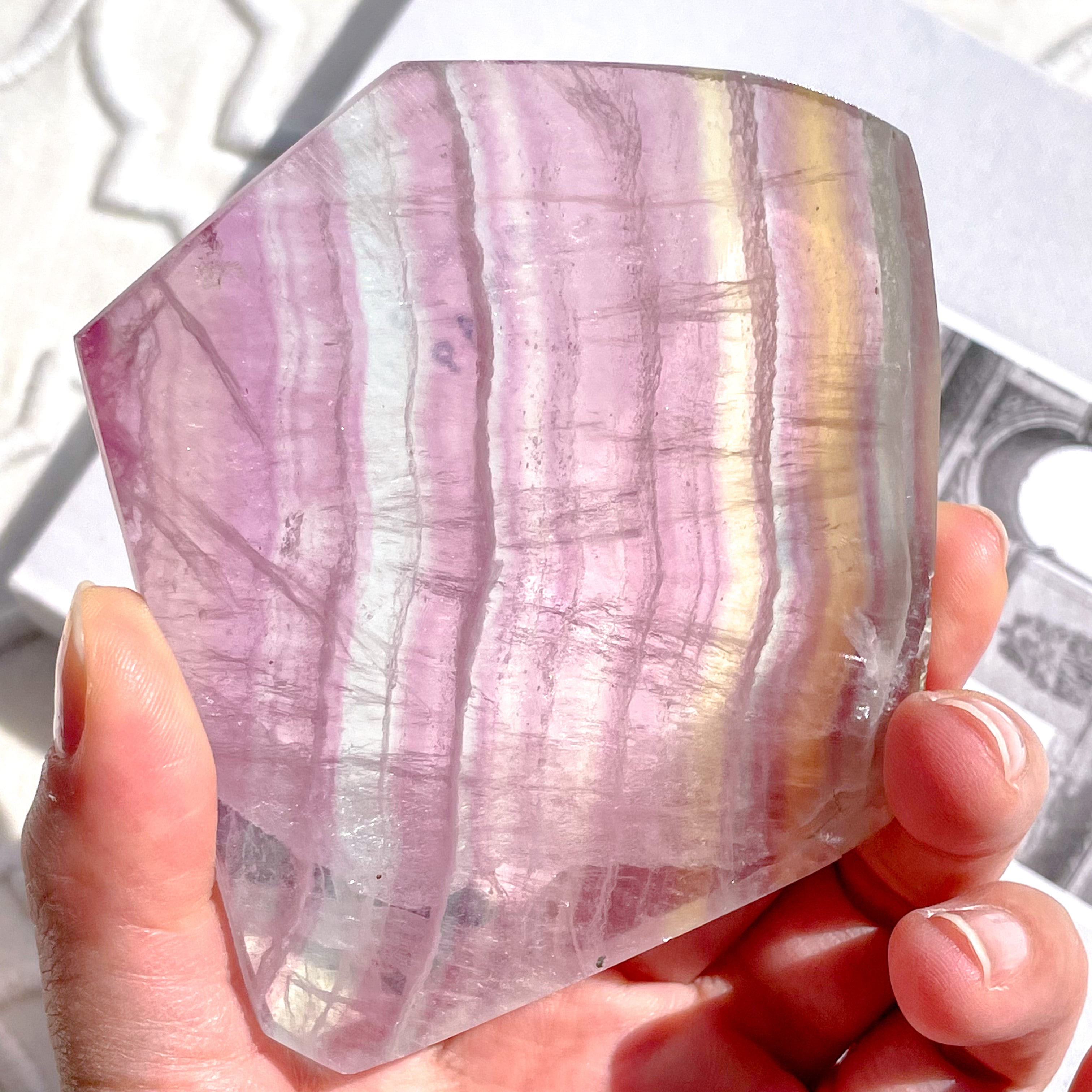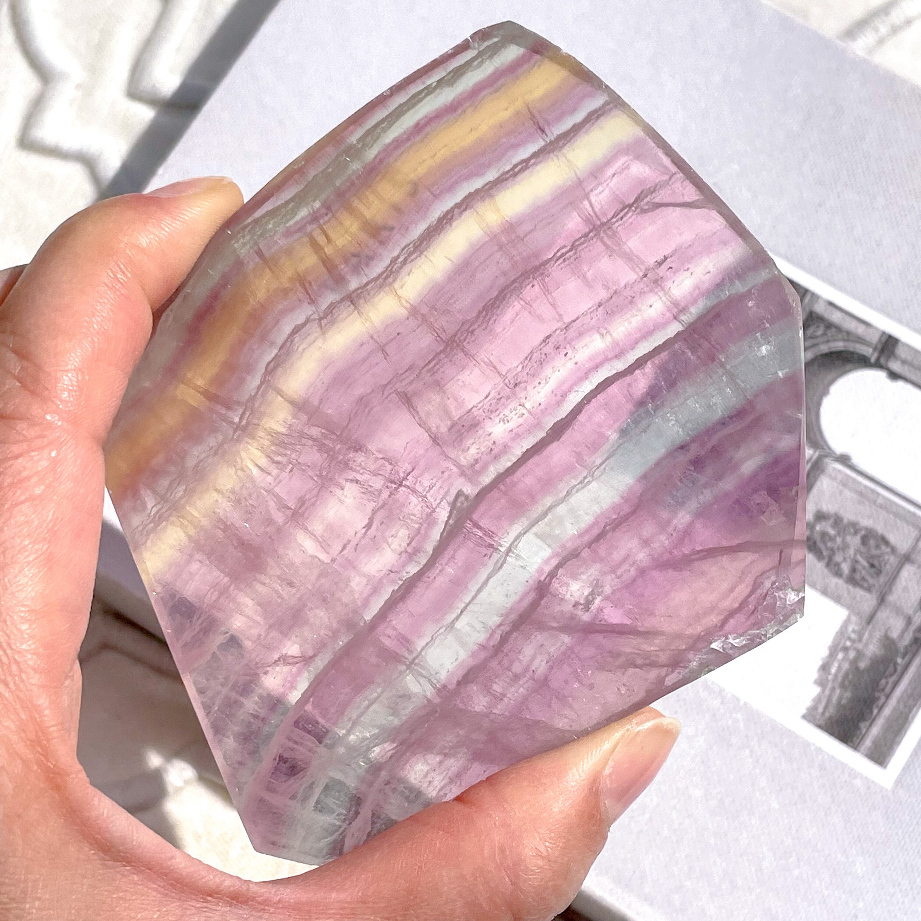 ピンクをメインにカラフルな色の層がハッピーな、ピンクフローライトのプレートです。