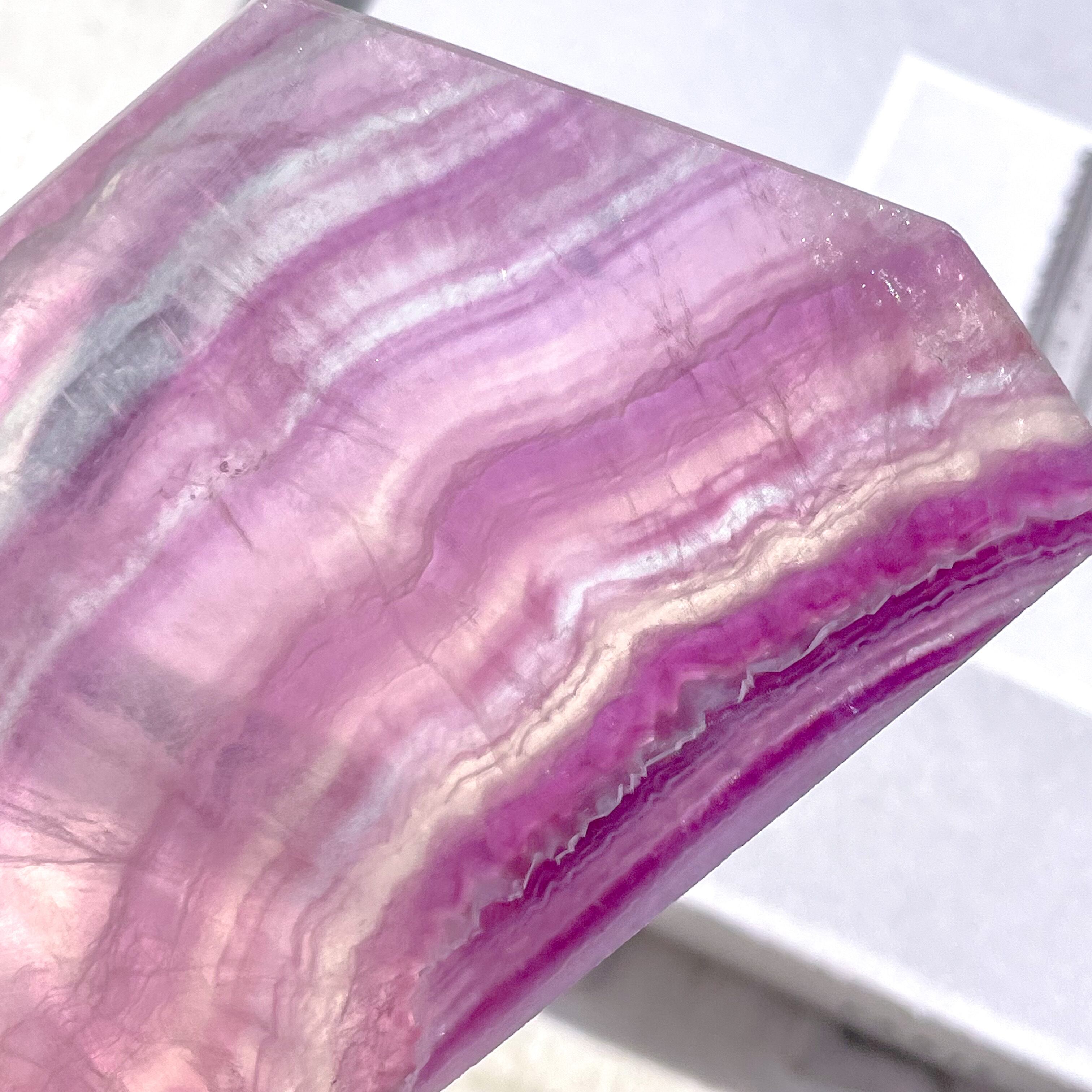 ピンクをメインにカラフルな色の層がハッピーな、ピンクフローライトのプレートです。
