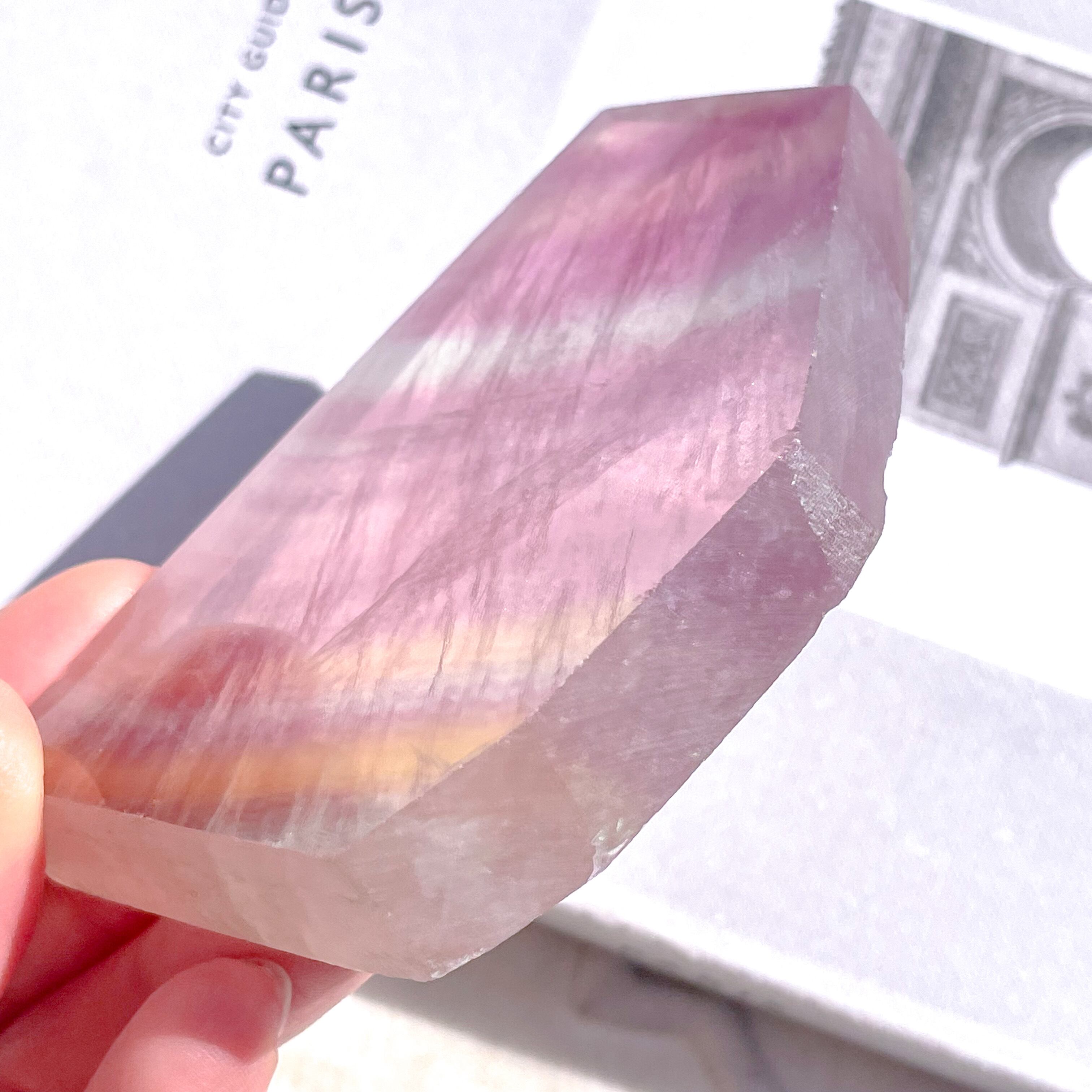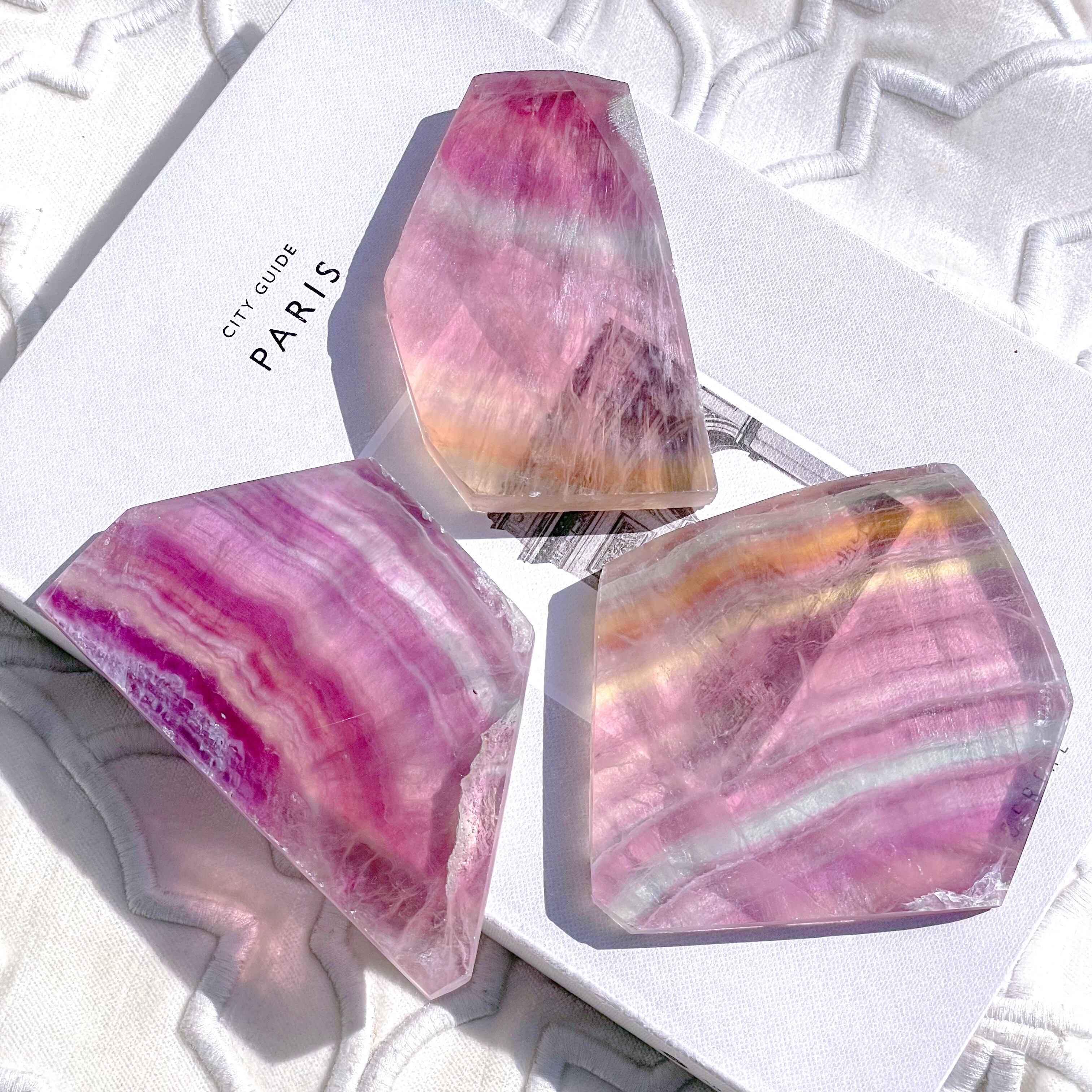 ピンクをメインにカラフルな色の層がハッピーな、ピンクフローライトのプレートです。