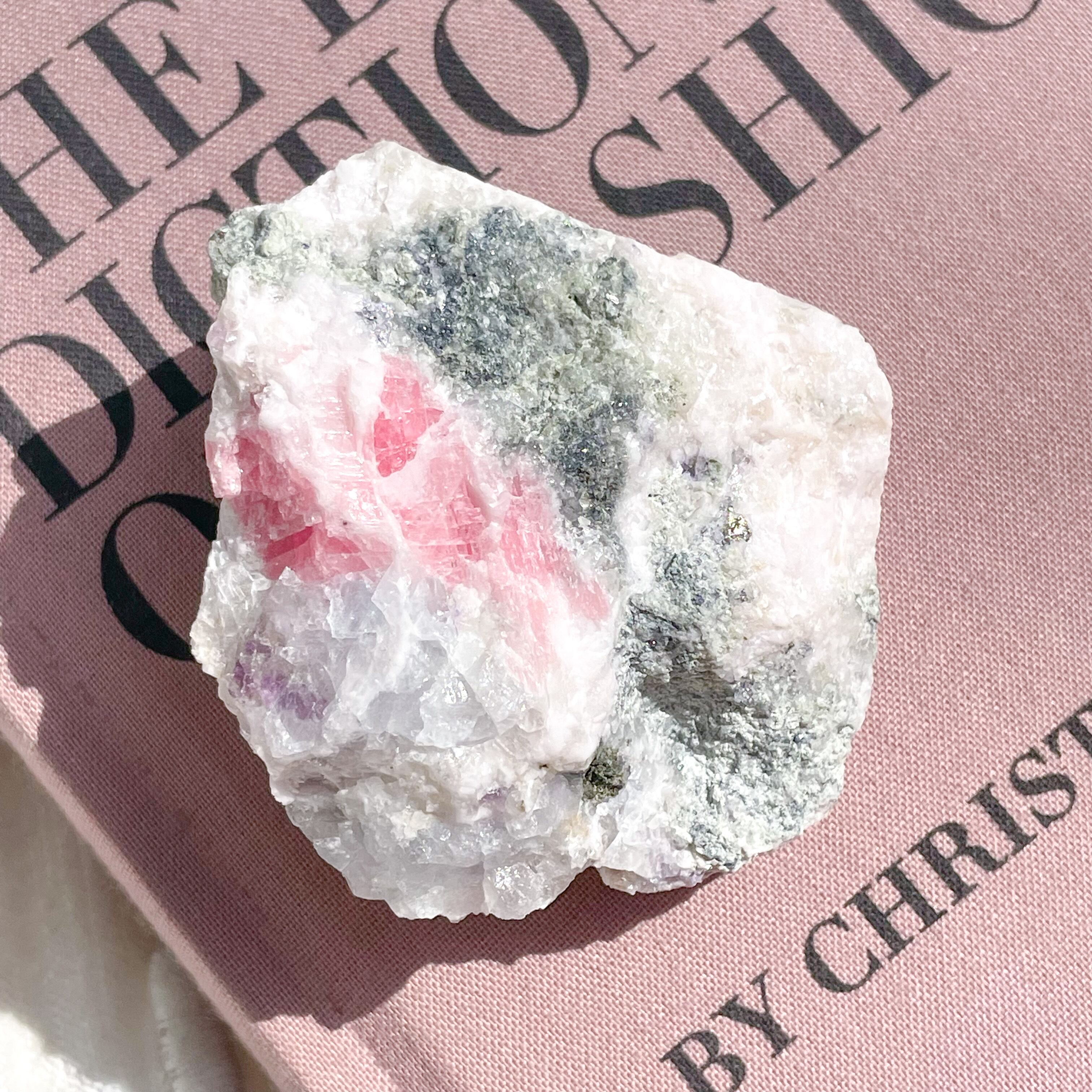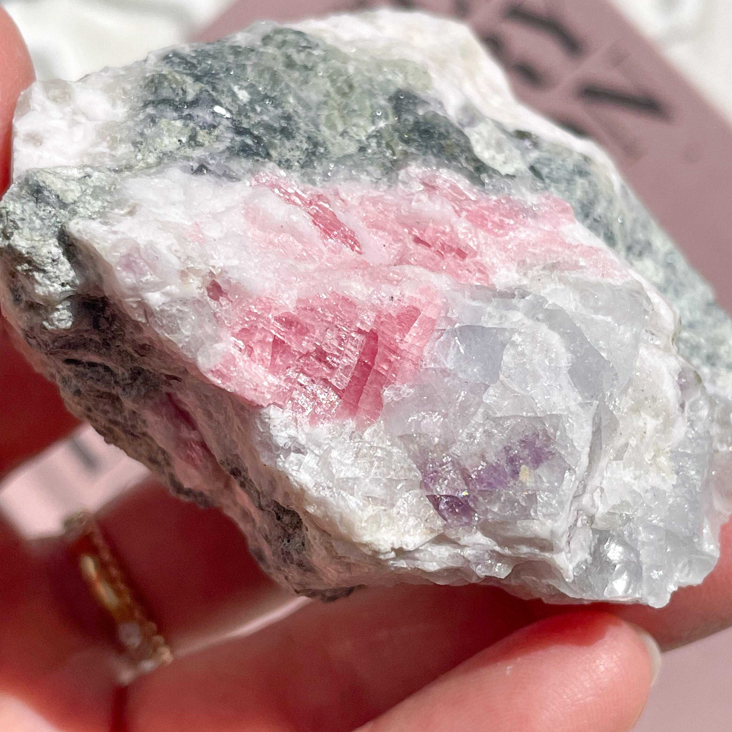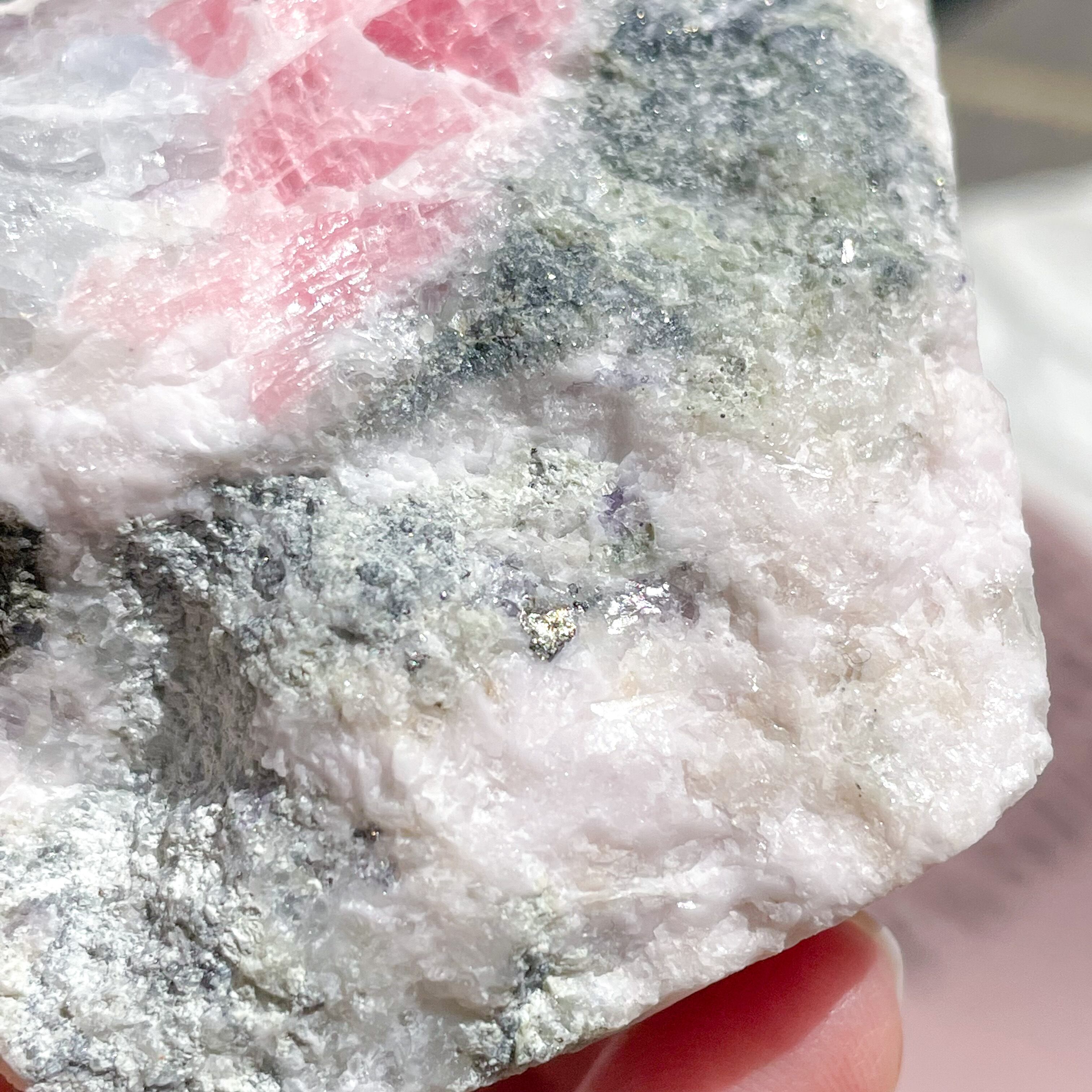 ロードクロサイト、フローライト、そしてキラキラとちりばめられたパイライトの3種が共生する、めずらしい原石。