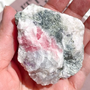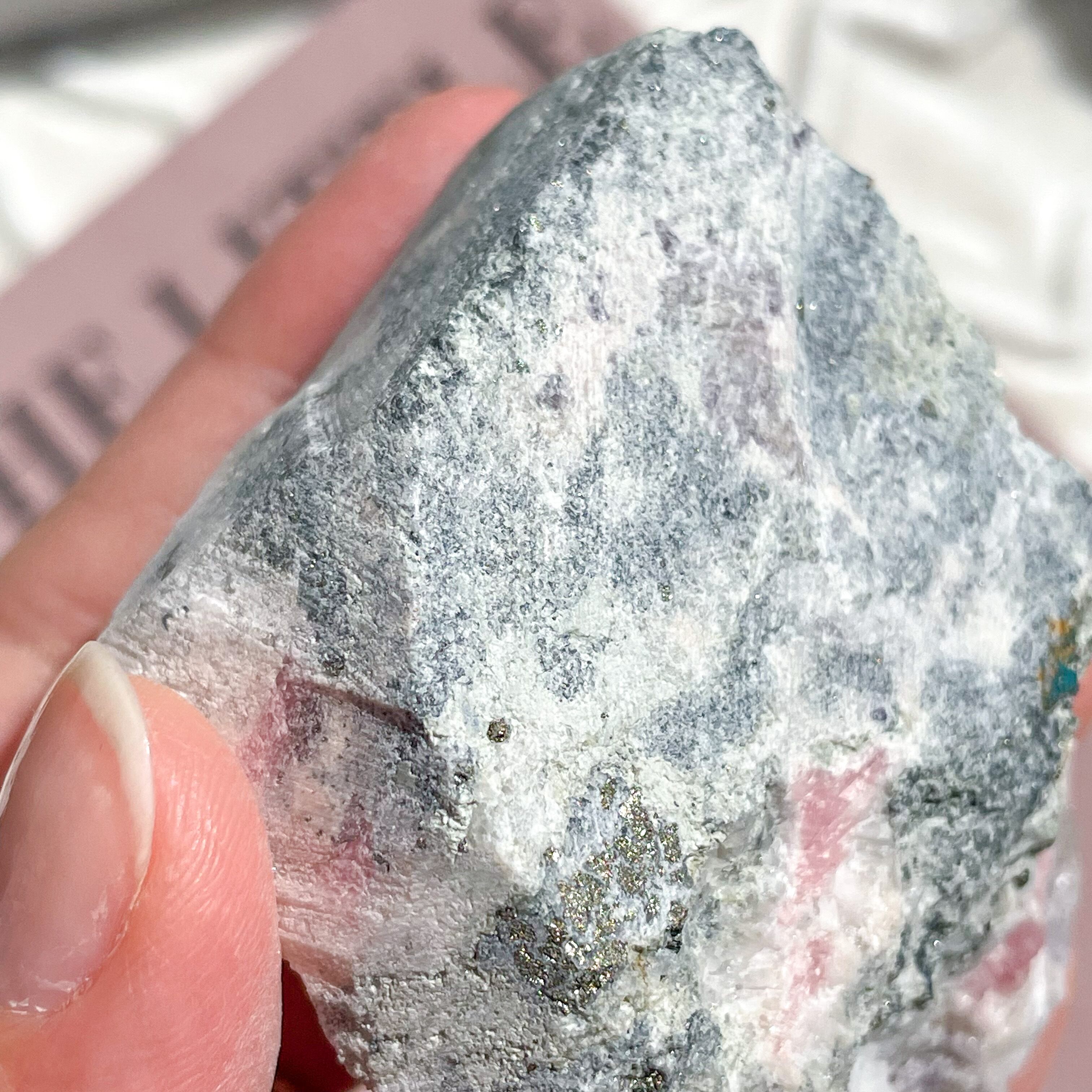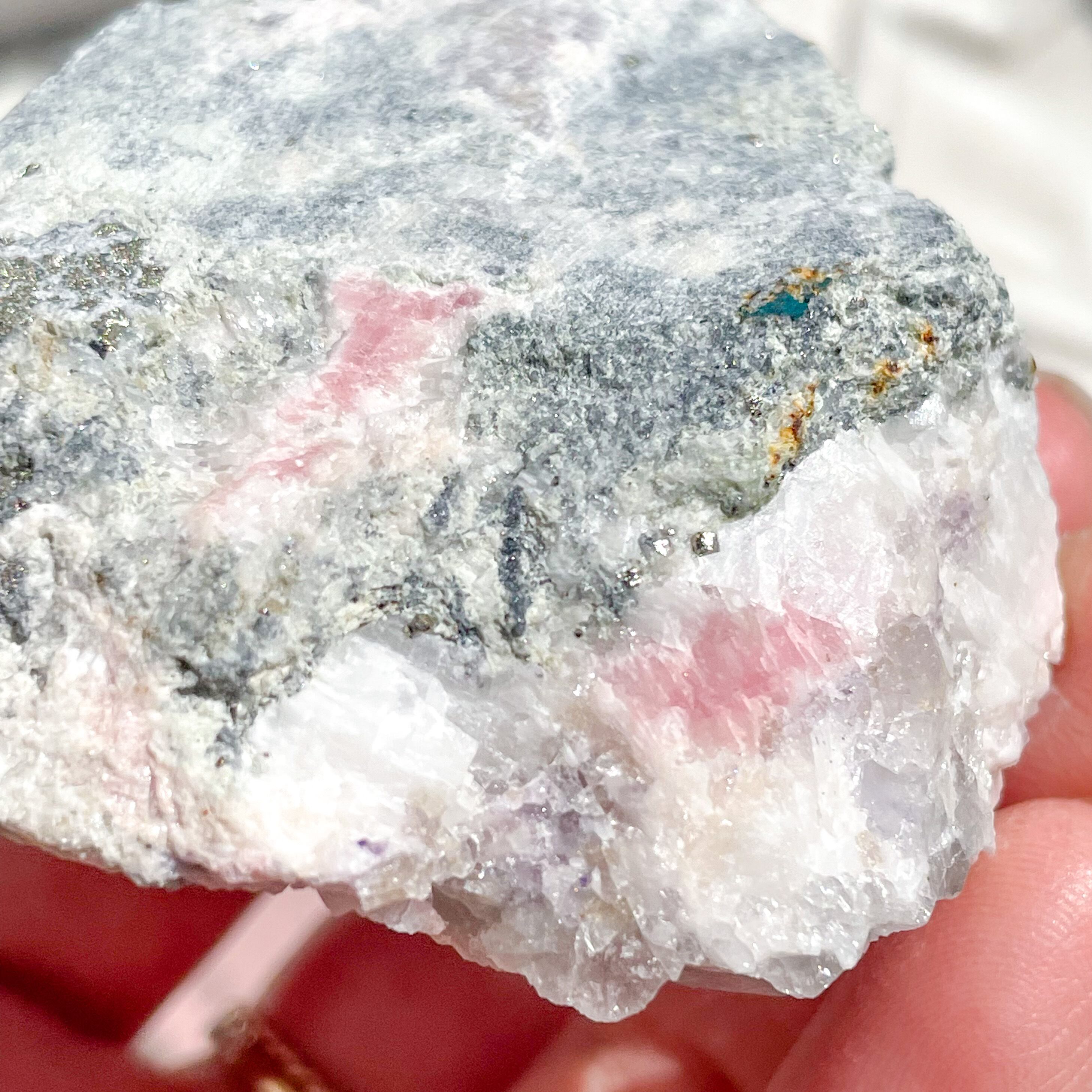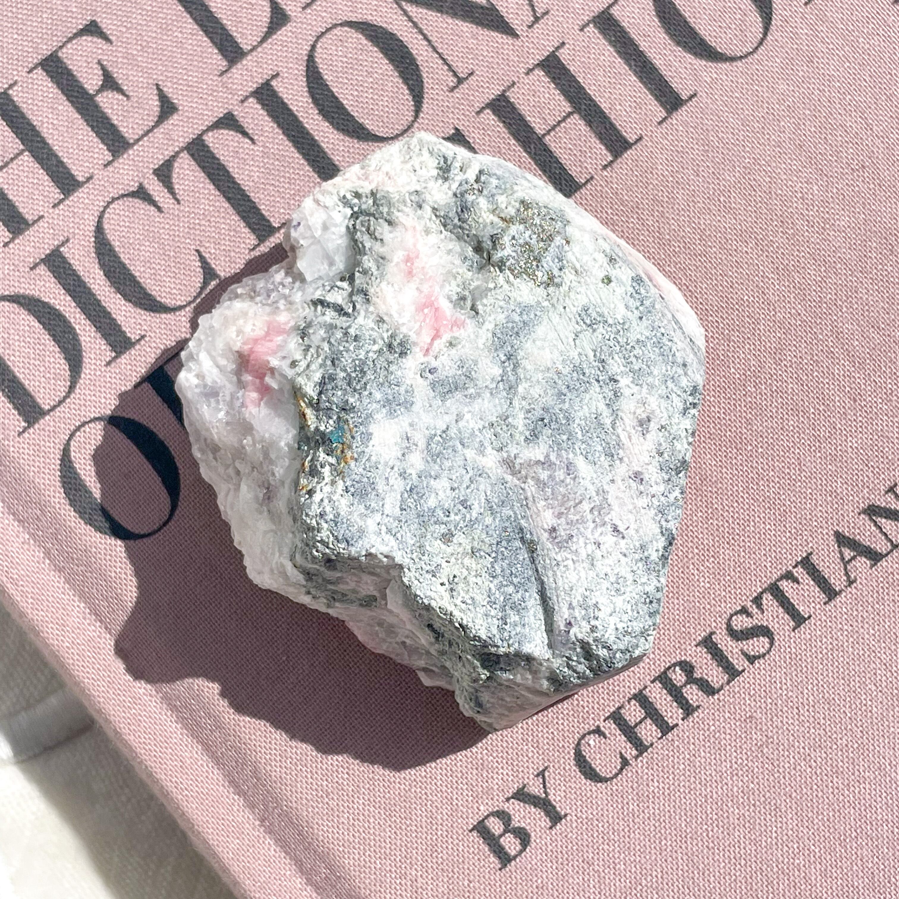 ロードクロサイト、フローライト、そしてキラキラとちりばめられたパイライトの3種が共生する、めずらしい原石。