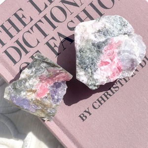 ホワイトの母岩に柔らかなローズレッドカラーが美しく、カラーレスフローライト、淡いパープルのフローライトのグラデーションに魅入ってしまいます。