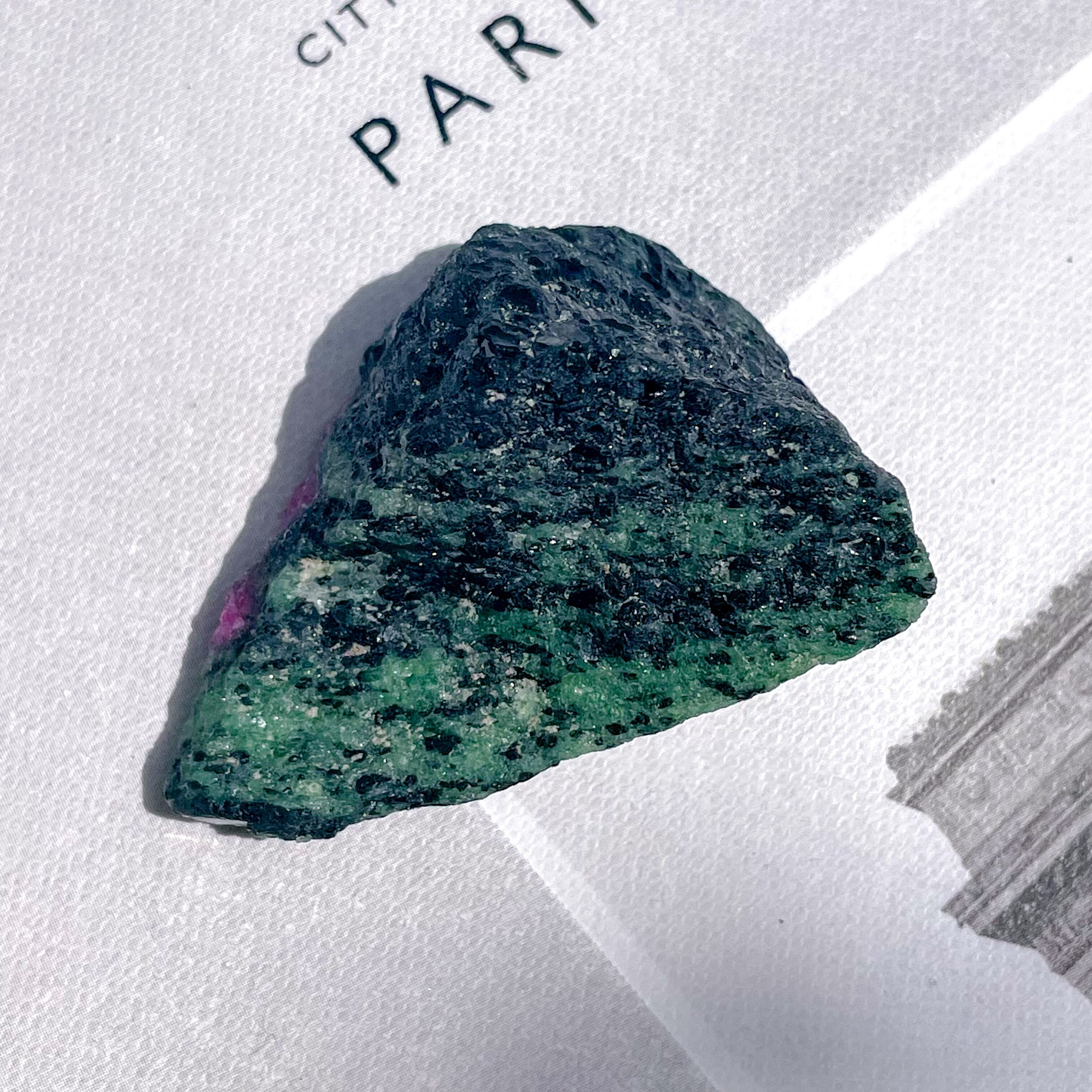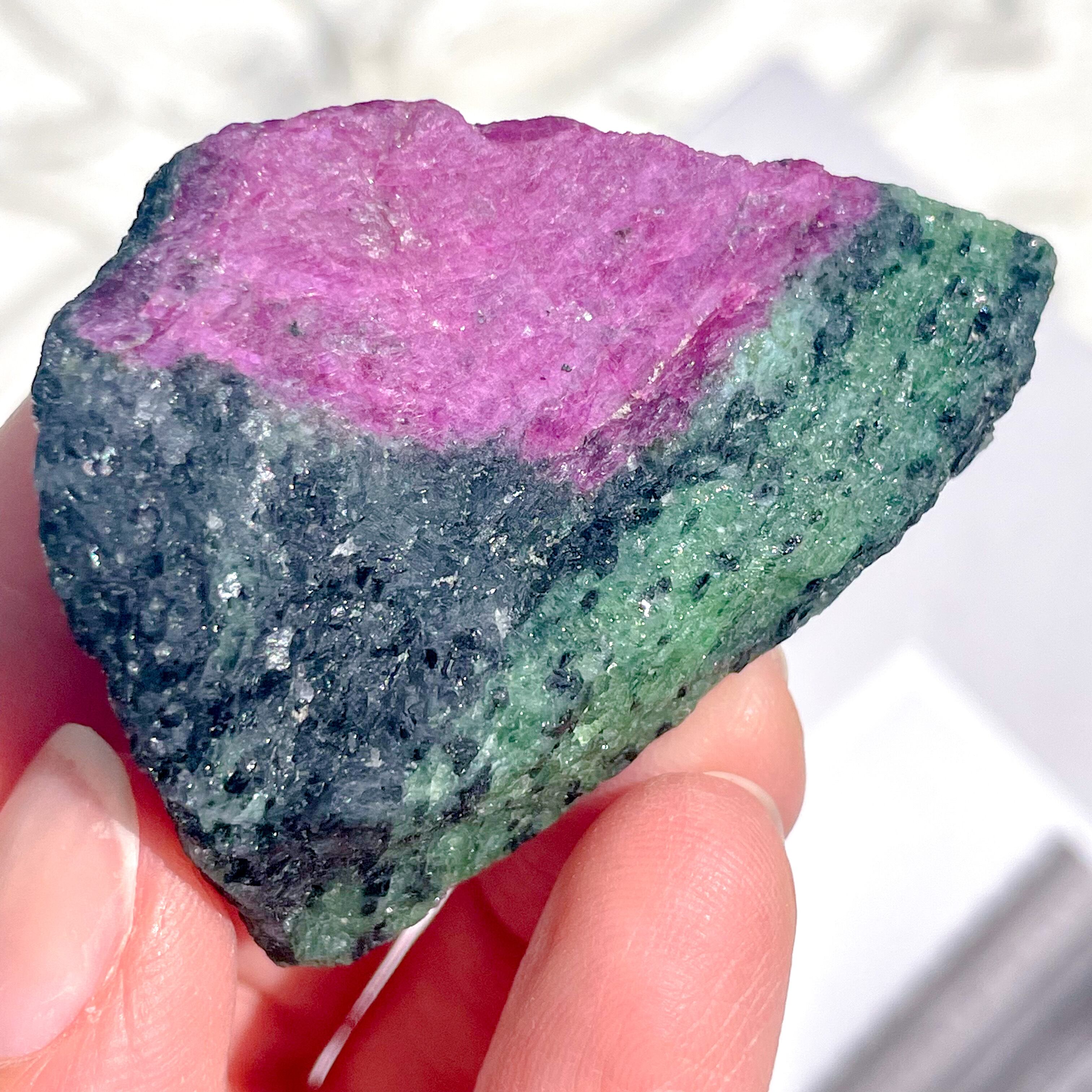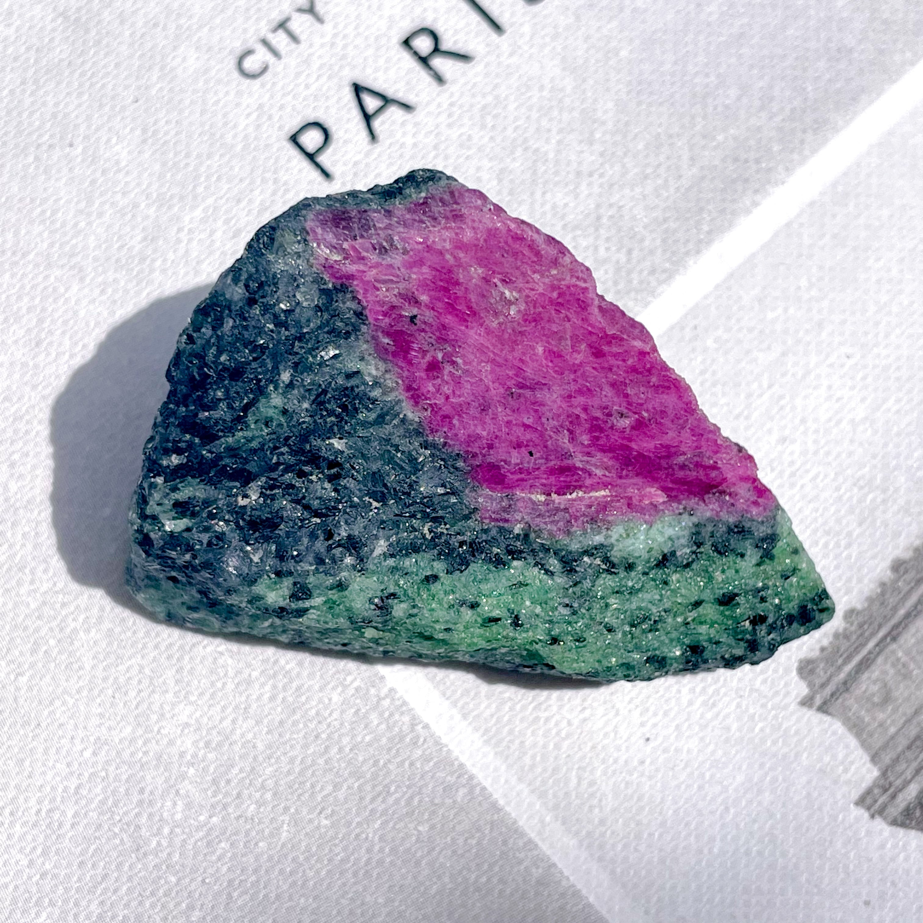 ビビッドなピンクレッドのルビーとグリーンのゾイサイト。ルビーインゾイサイトの原石です。