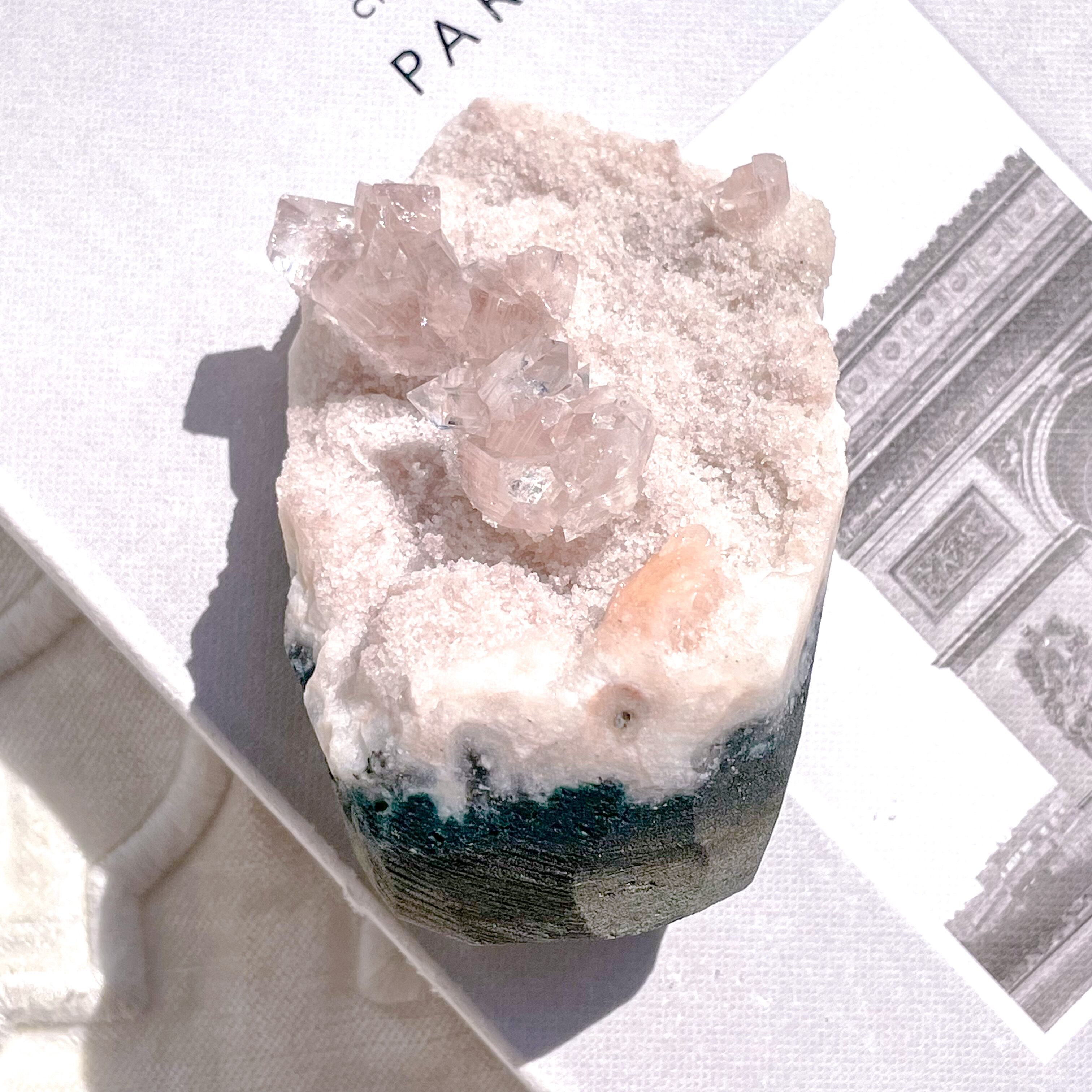 アポフィライトの中でも、ピンクカラーのものは中々市場に出てこない、希少なストーンです。今回はその中でもトップクオリティといえる、美しいクラスターに出会うことができました。