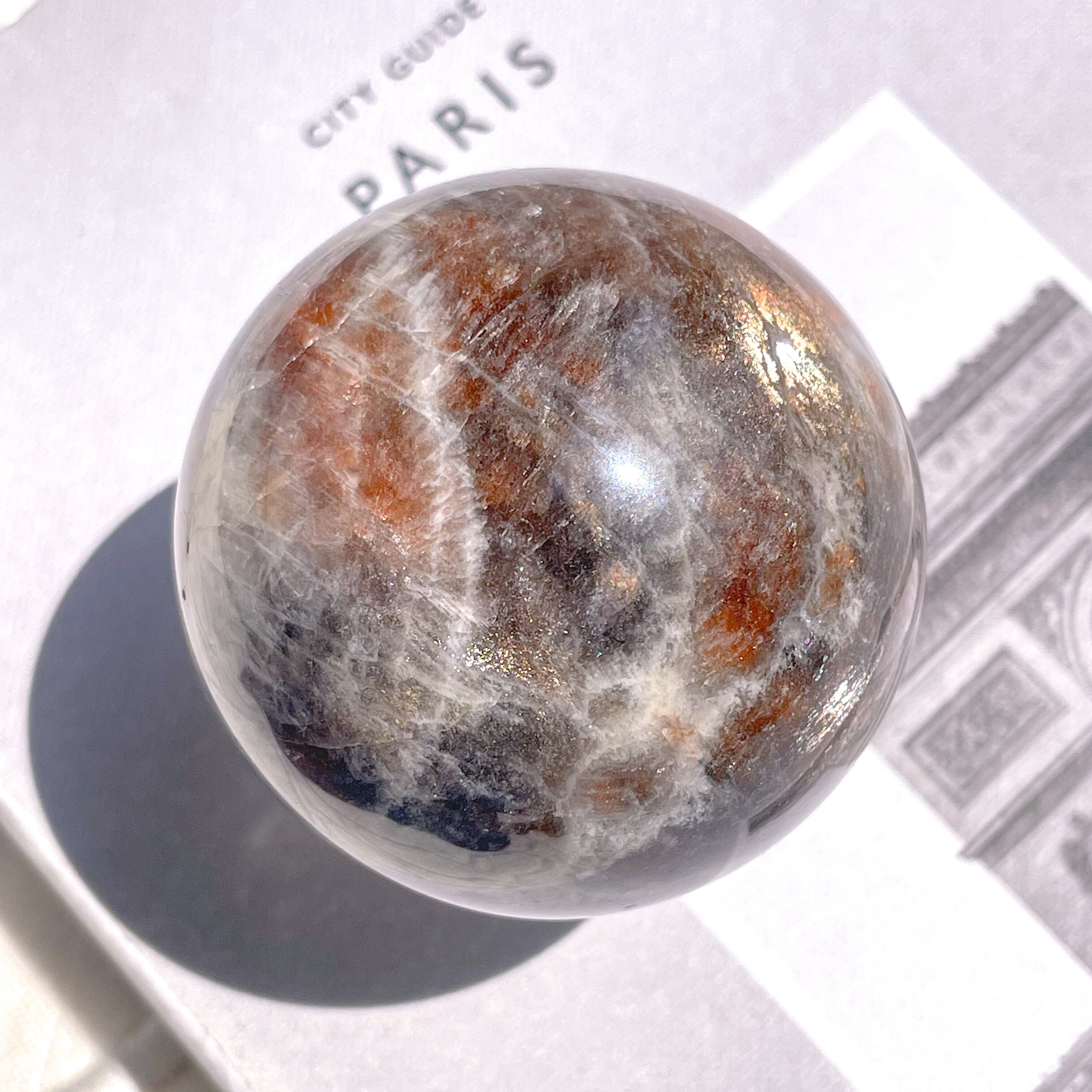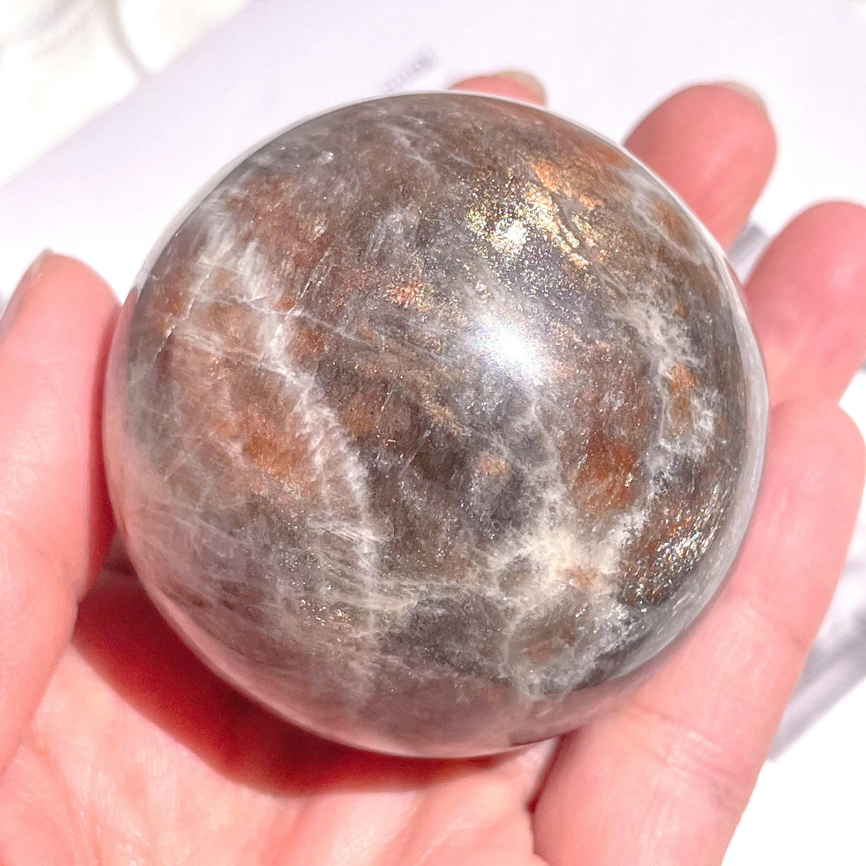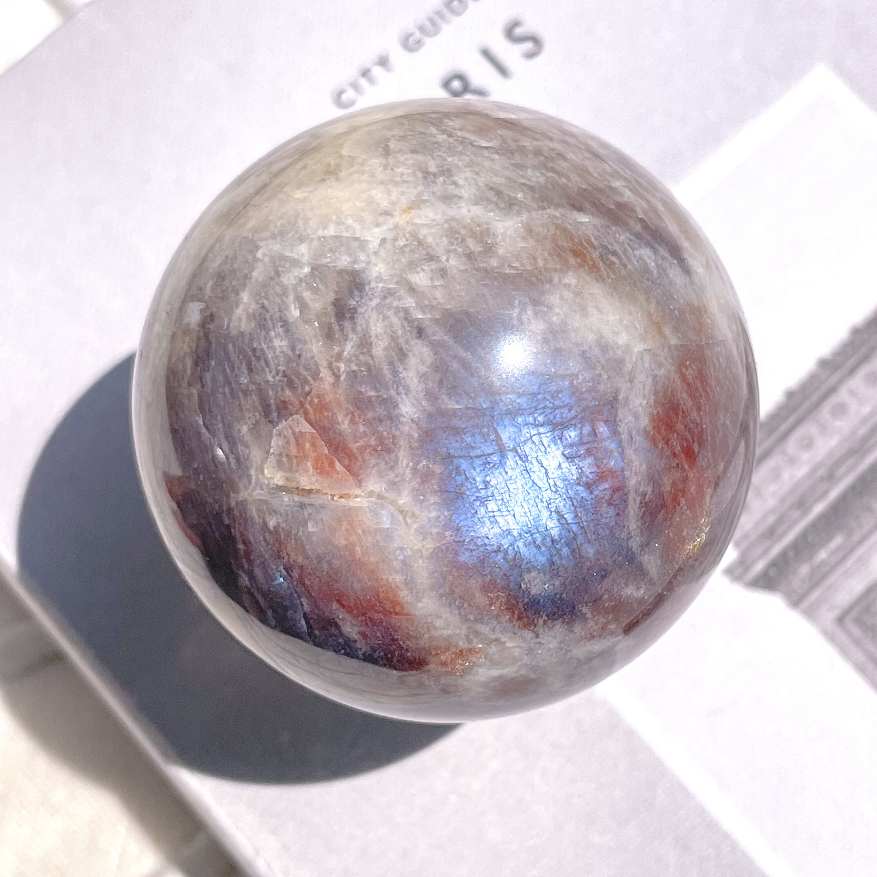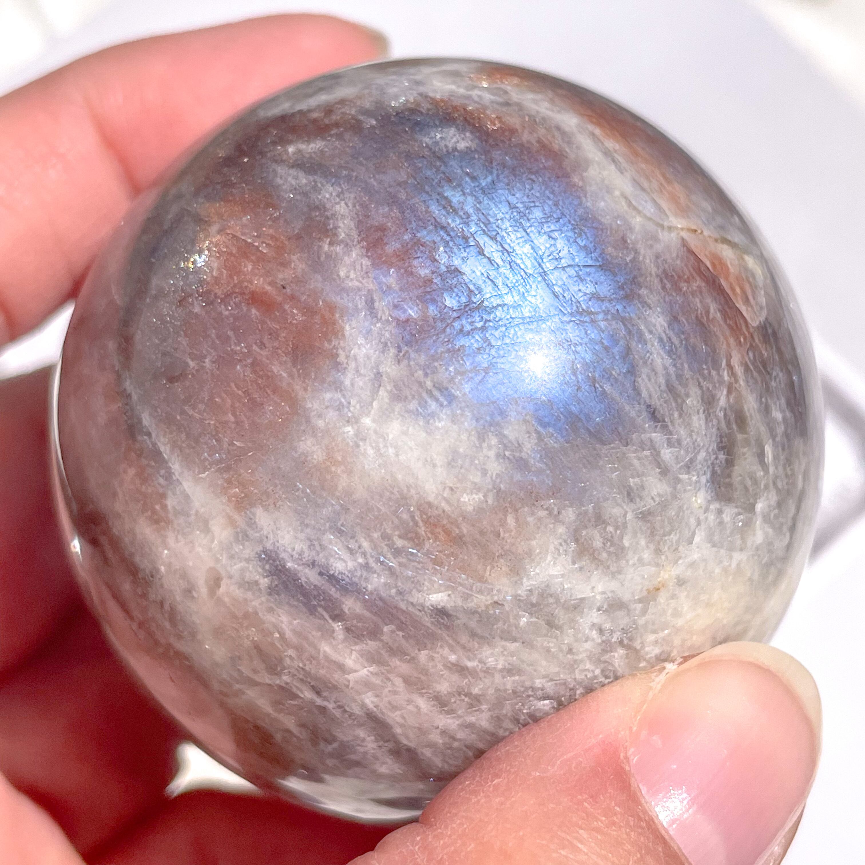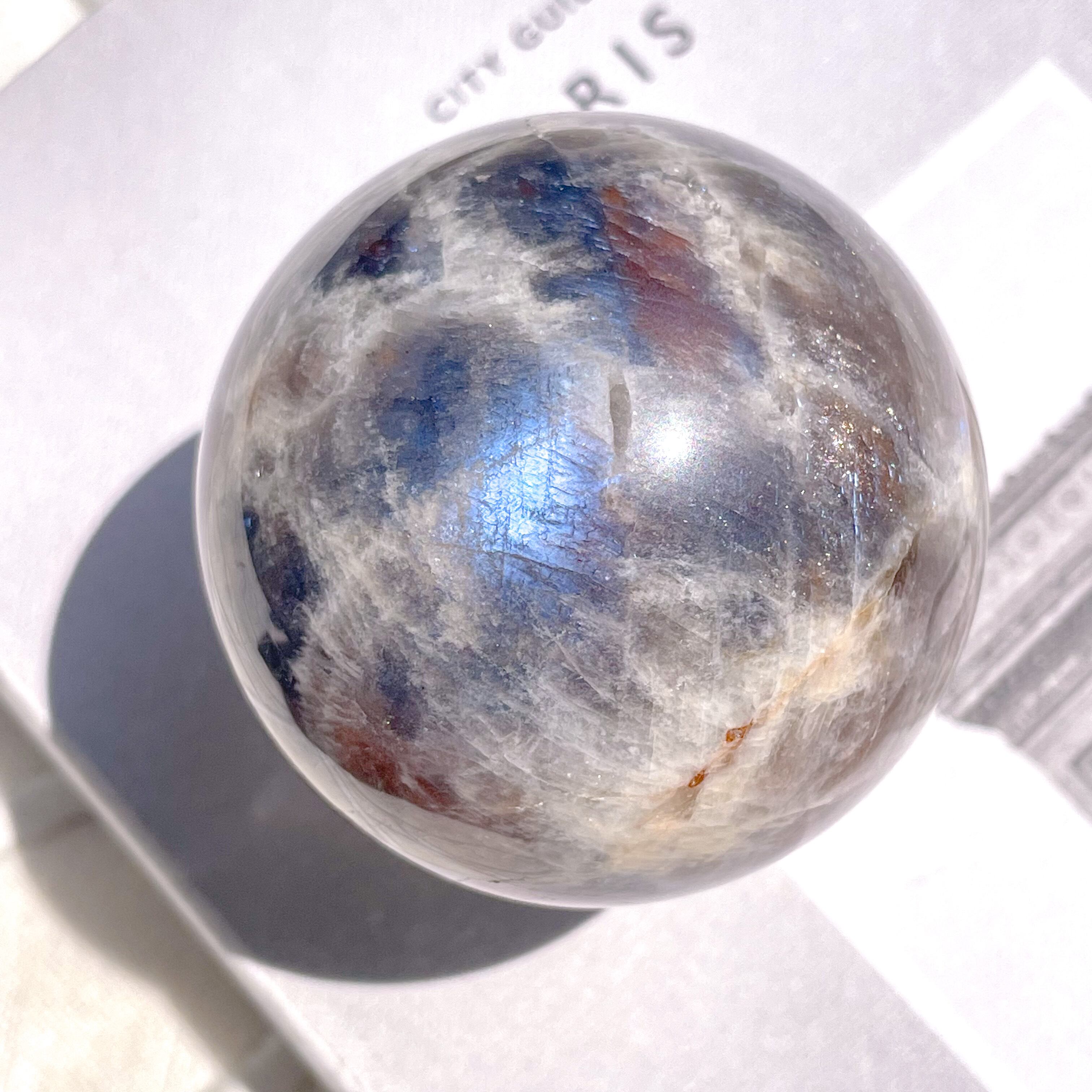 サンストーンの特徴である、シャンパンゴールド色に煌めくアベンチュレッセンス効果と、ムーンストーンに特徴的な、静かな光・青色のイリデッセンス効果、このふたつを併せ持つ、神秘的なストーンです♡