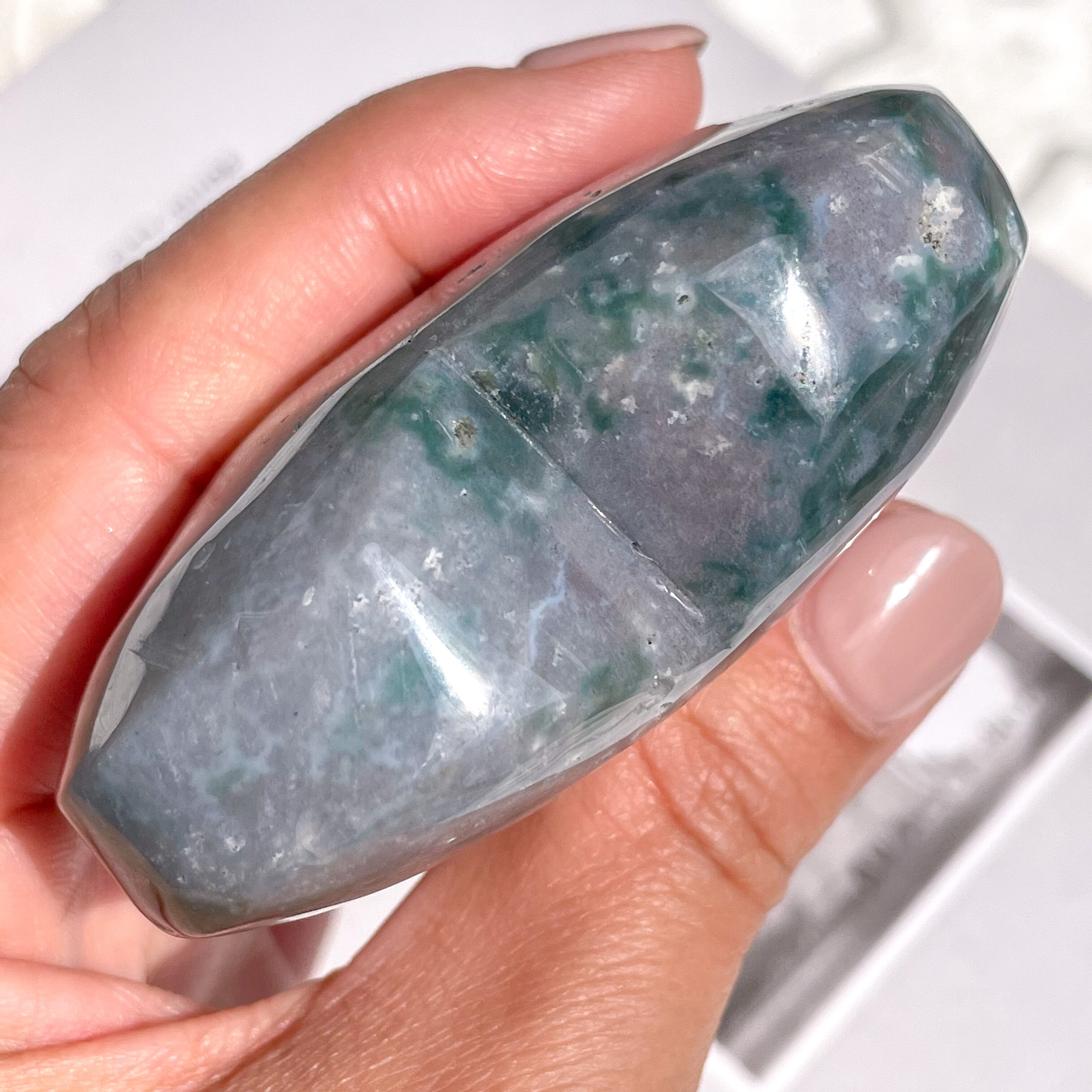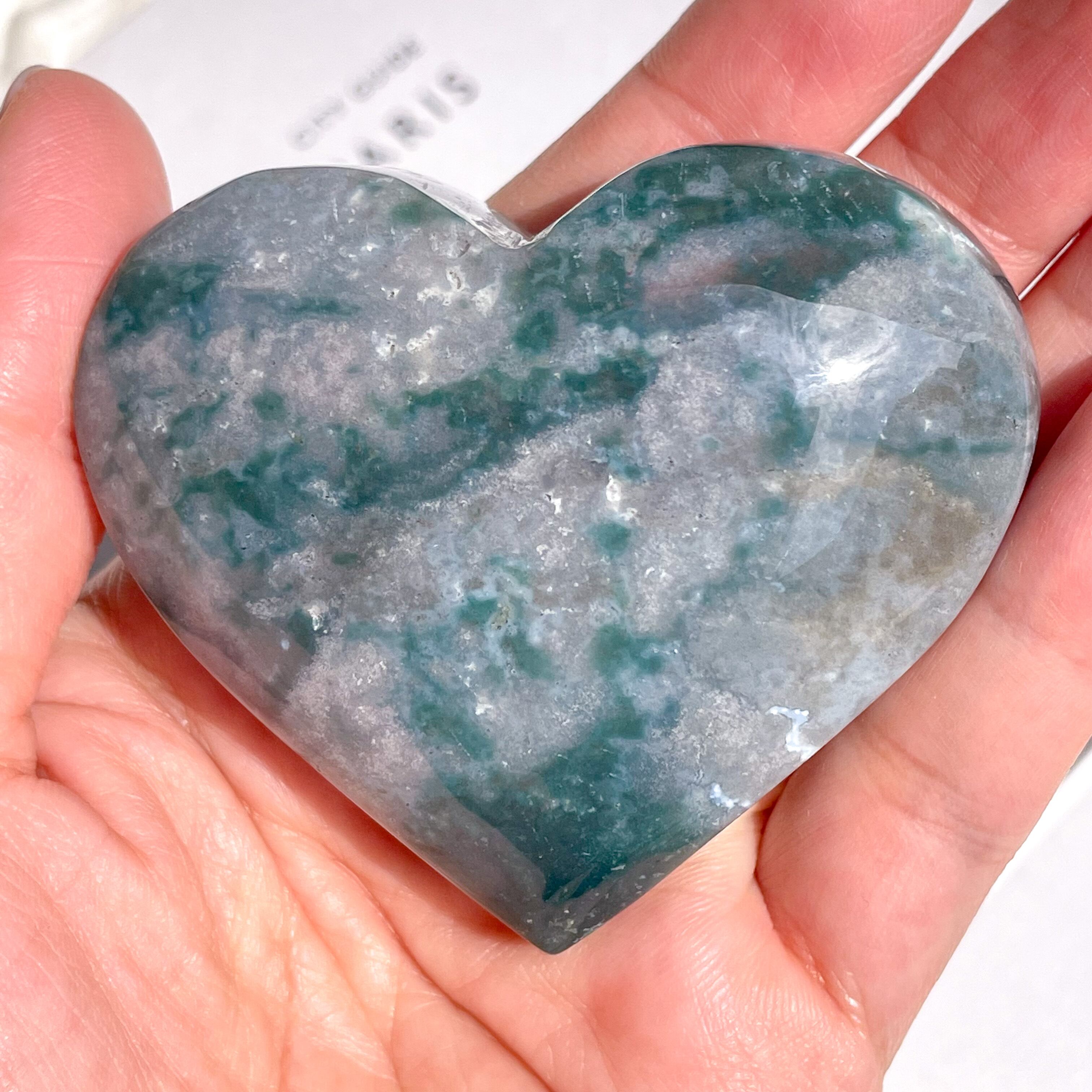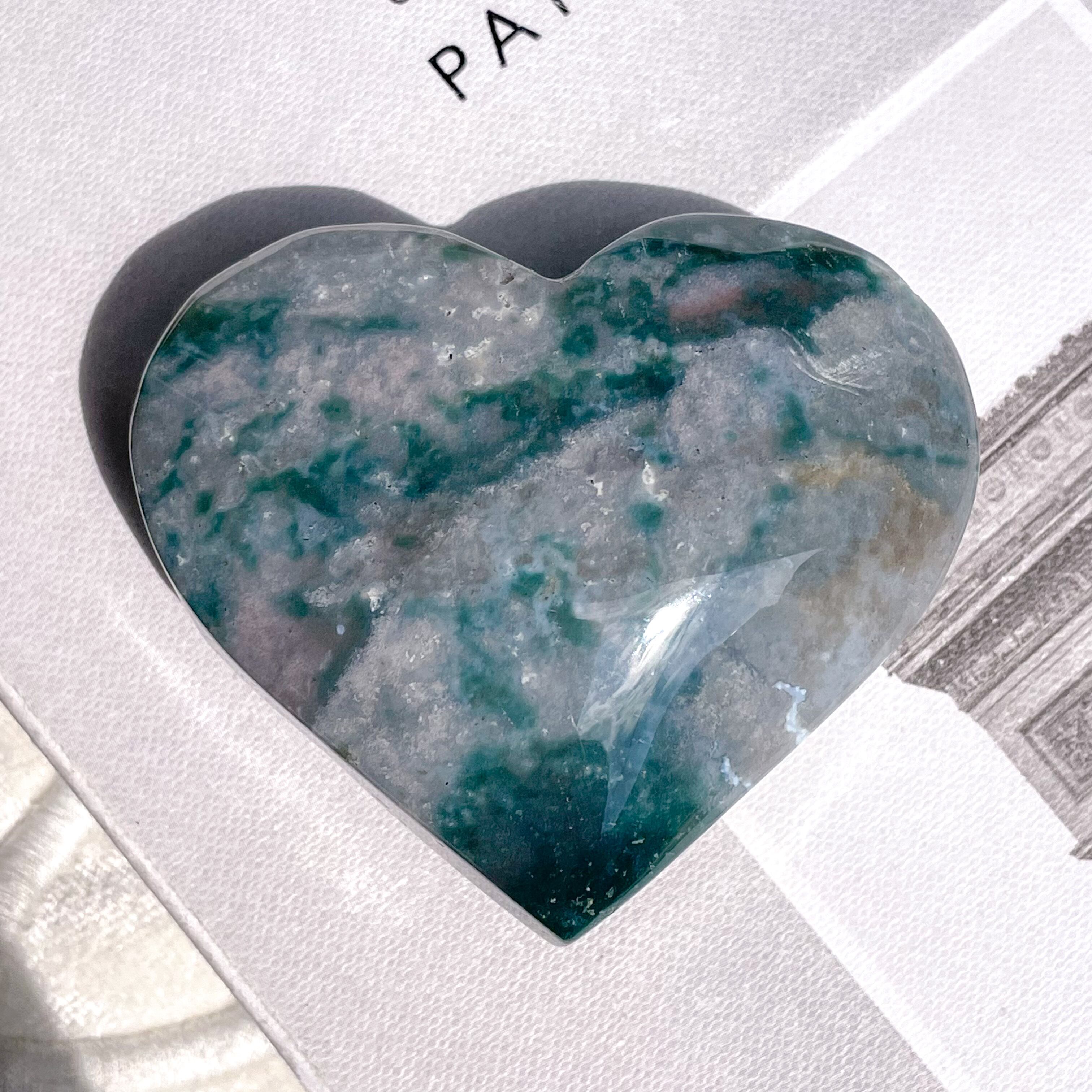 淡く幻想的なパープル〜ピンクグレイカラーのオーシャンジャスパーに、深いグリーンのモスアゲートが混ざりあう共生ストーン。奥行きのある美しいハートです♡