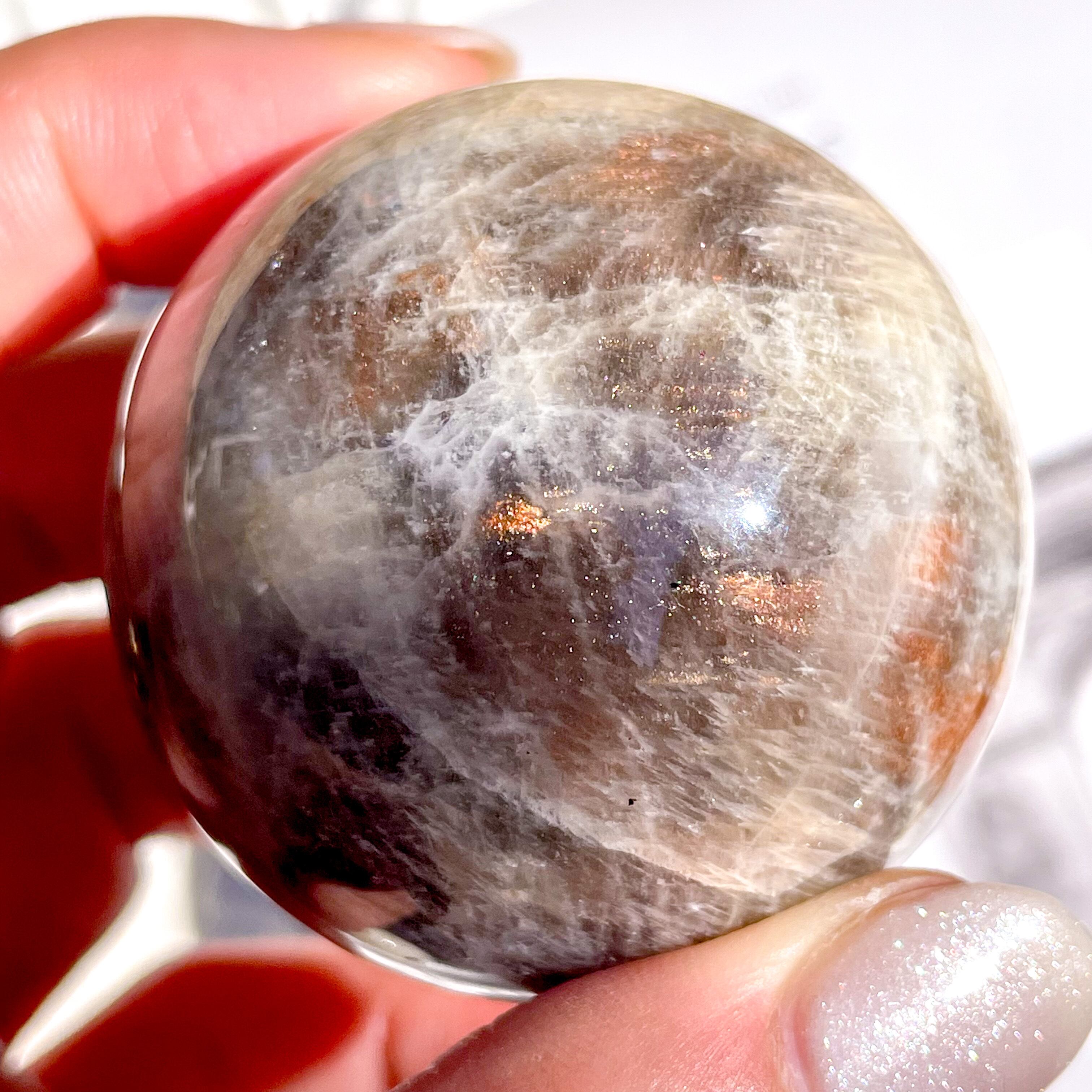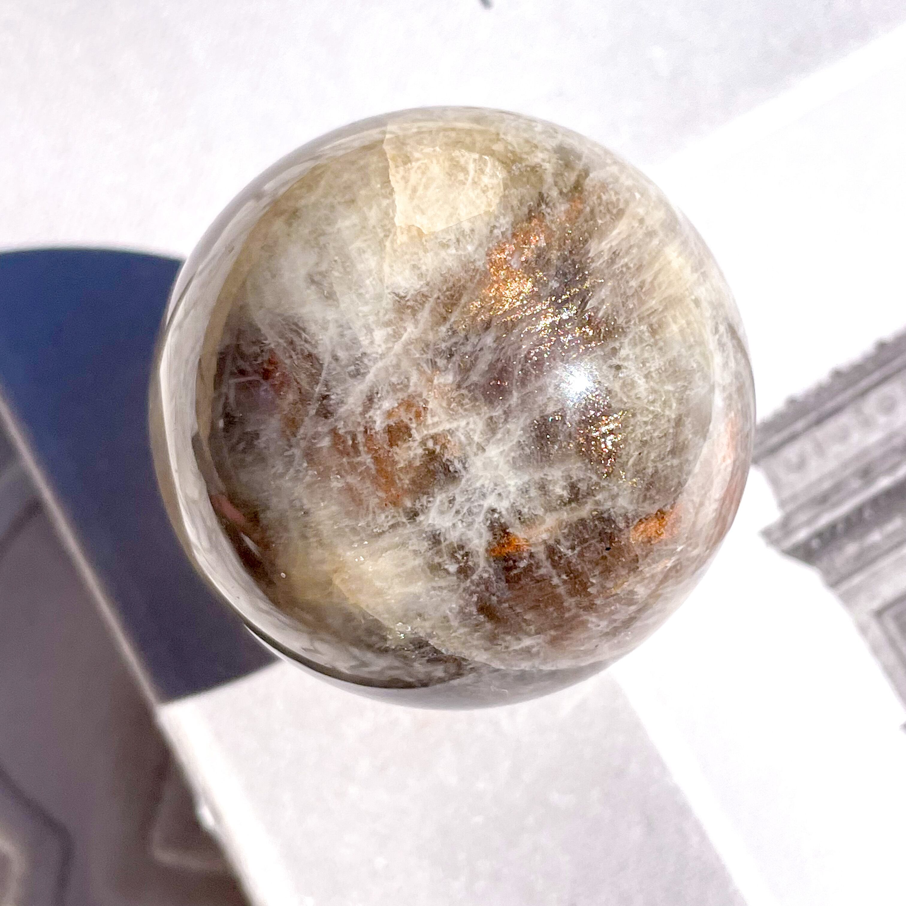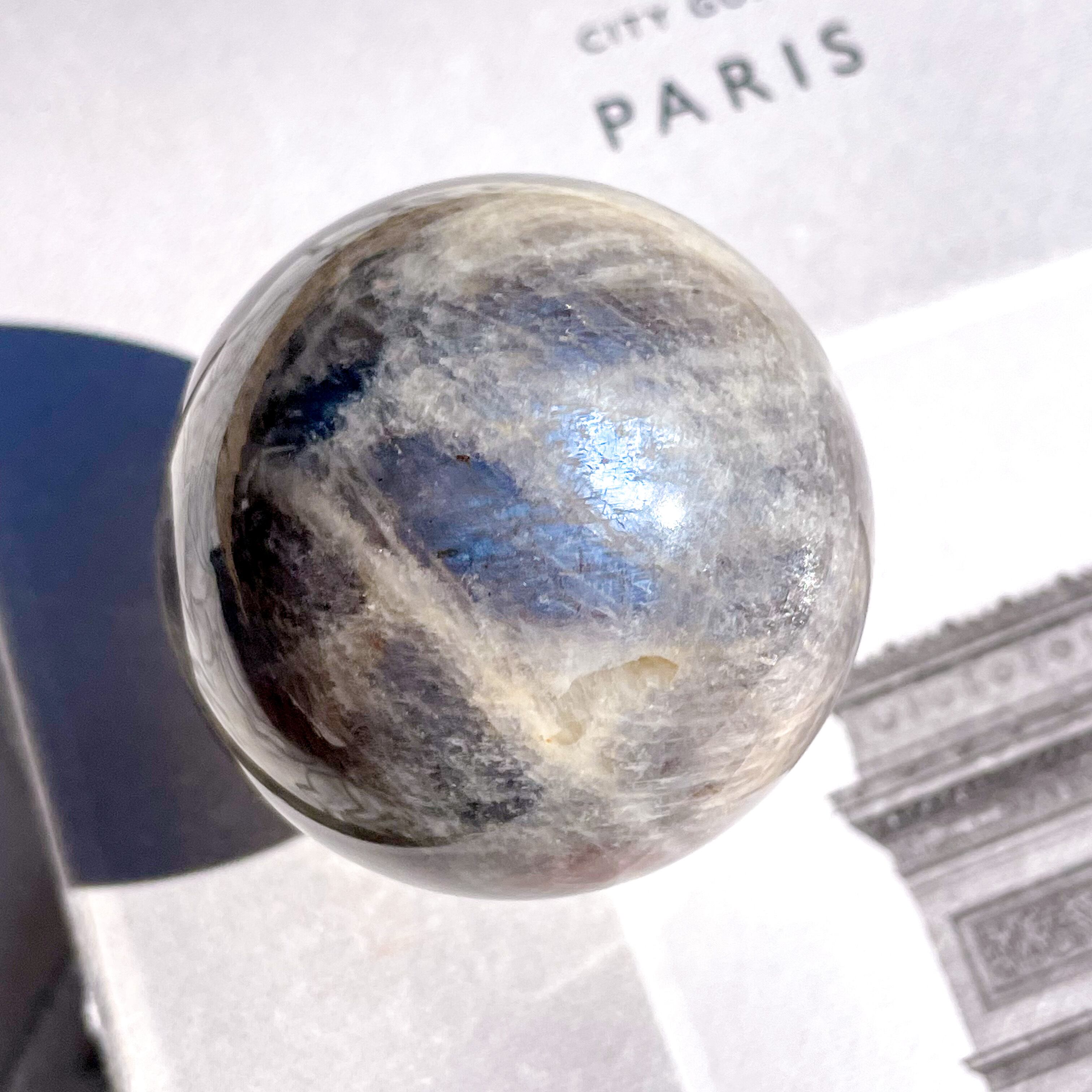 サンストーンの特徴である、シャンパンゴールド色に煌めくアベンチュレッセンス効果と、ムーンストーンに特徴的な、静かな光・青色のイリデッセンス効果、このふたつを併せ持つ、神秘的なストーンです♡