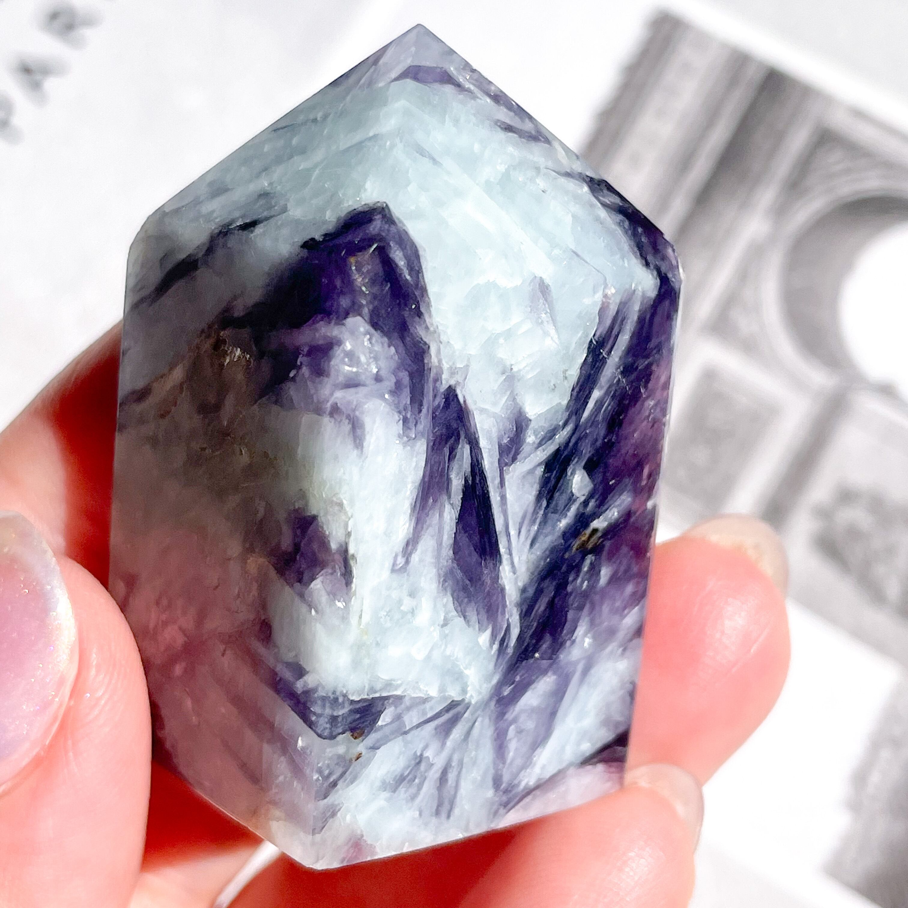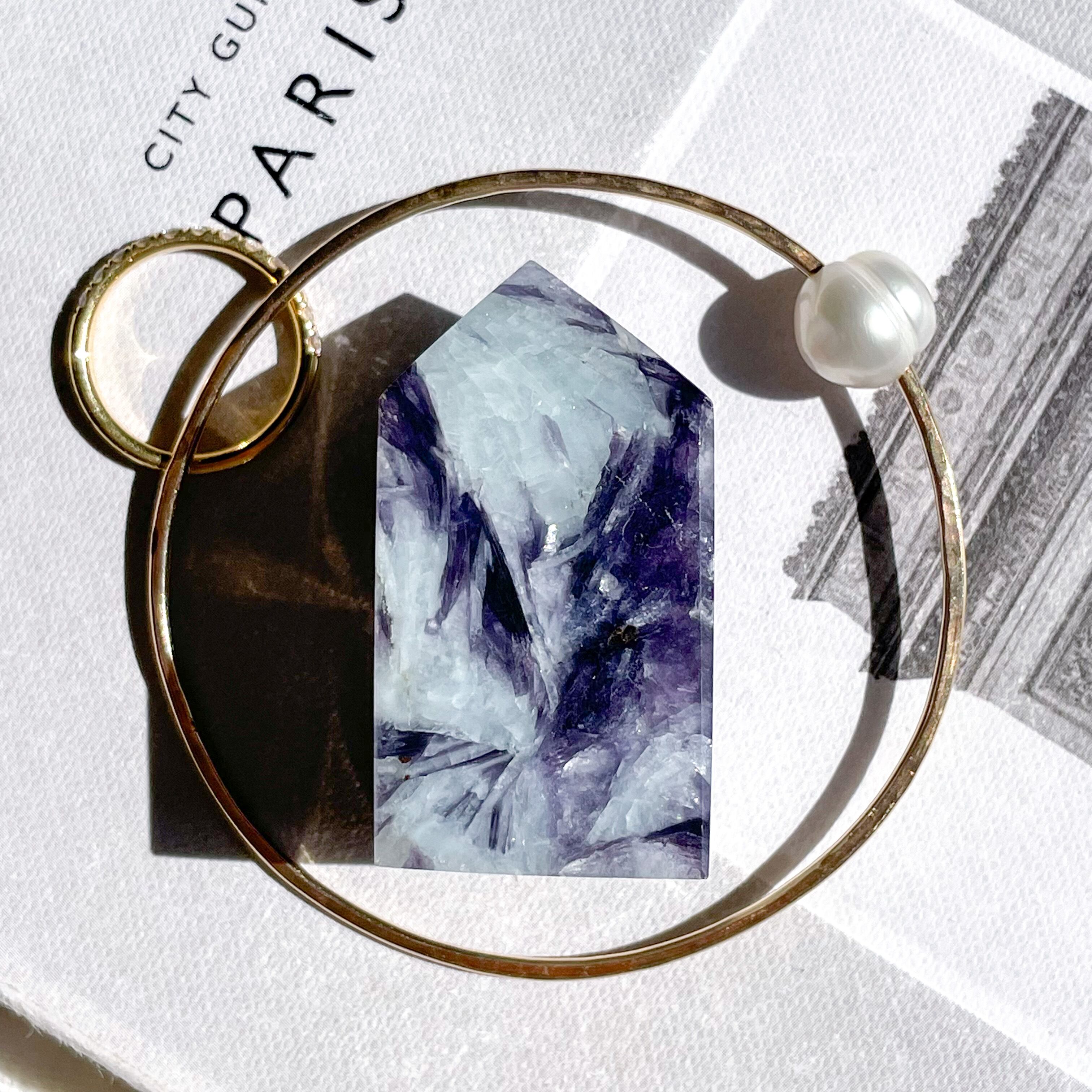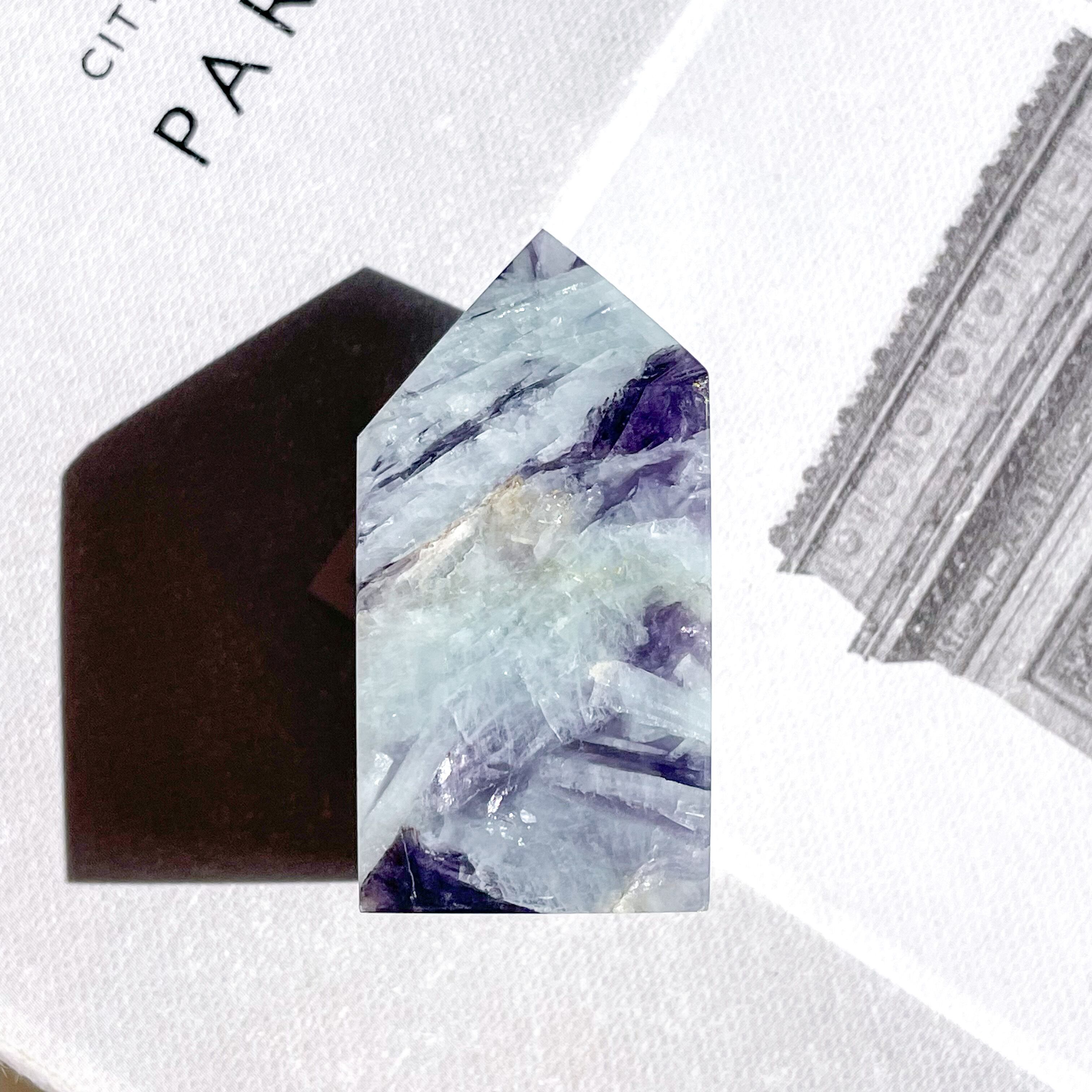 深いパープル、レピドライト特有の雲母がキラキラときらめきます。淡いペールブルーのアクアマリンと共生して美しい模様を描き、吸い込まれてしまいそうな美しいピース。