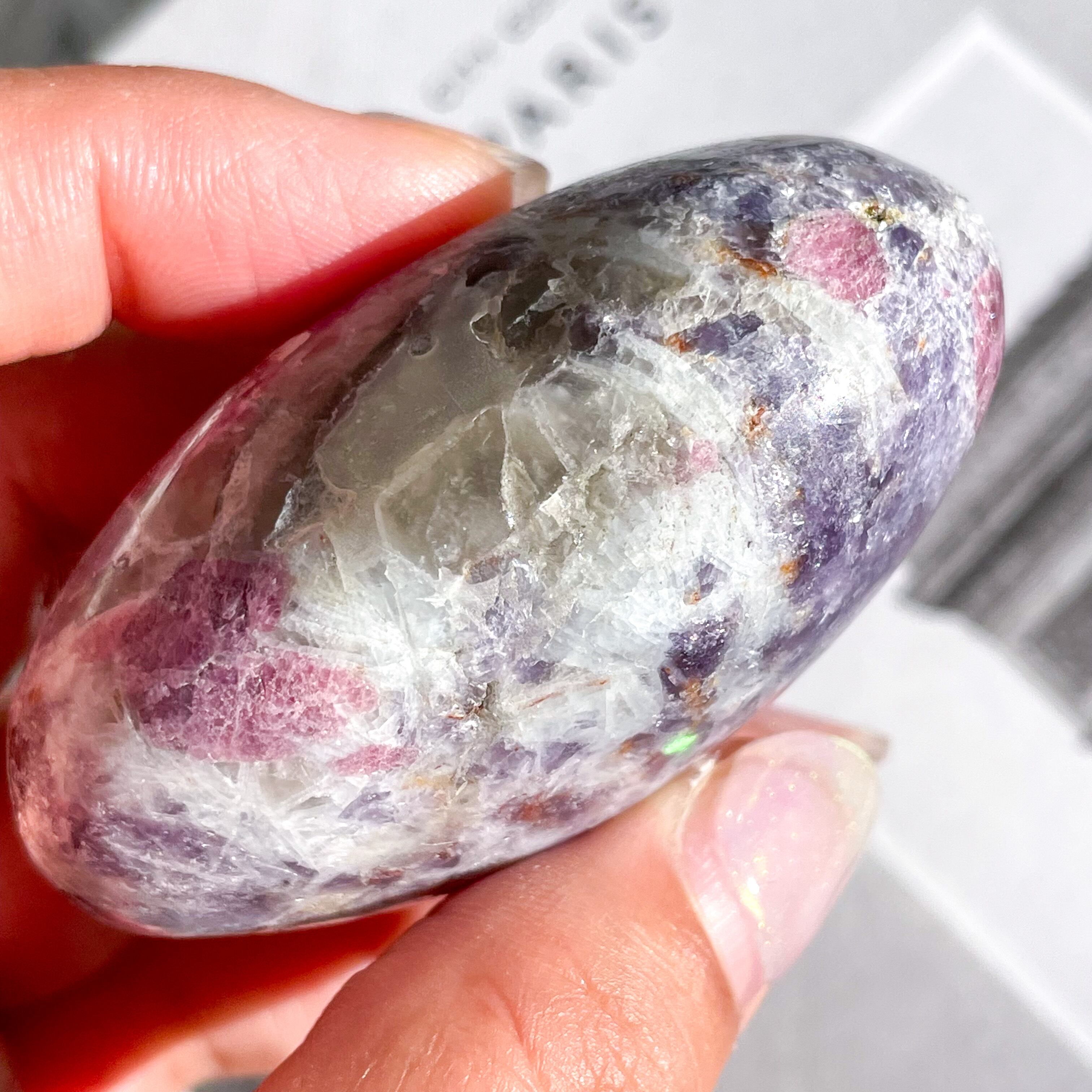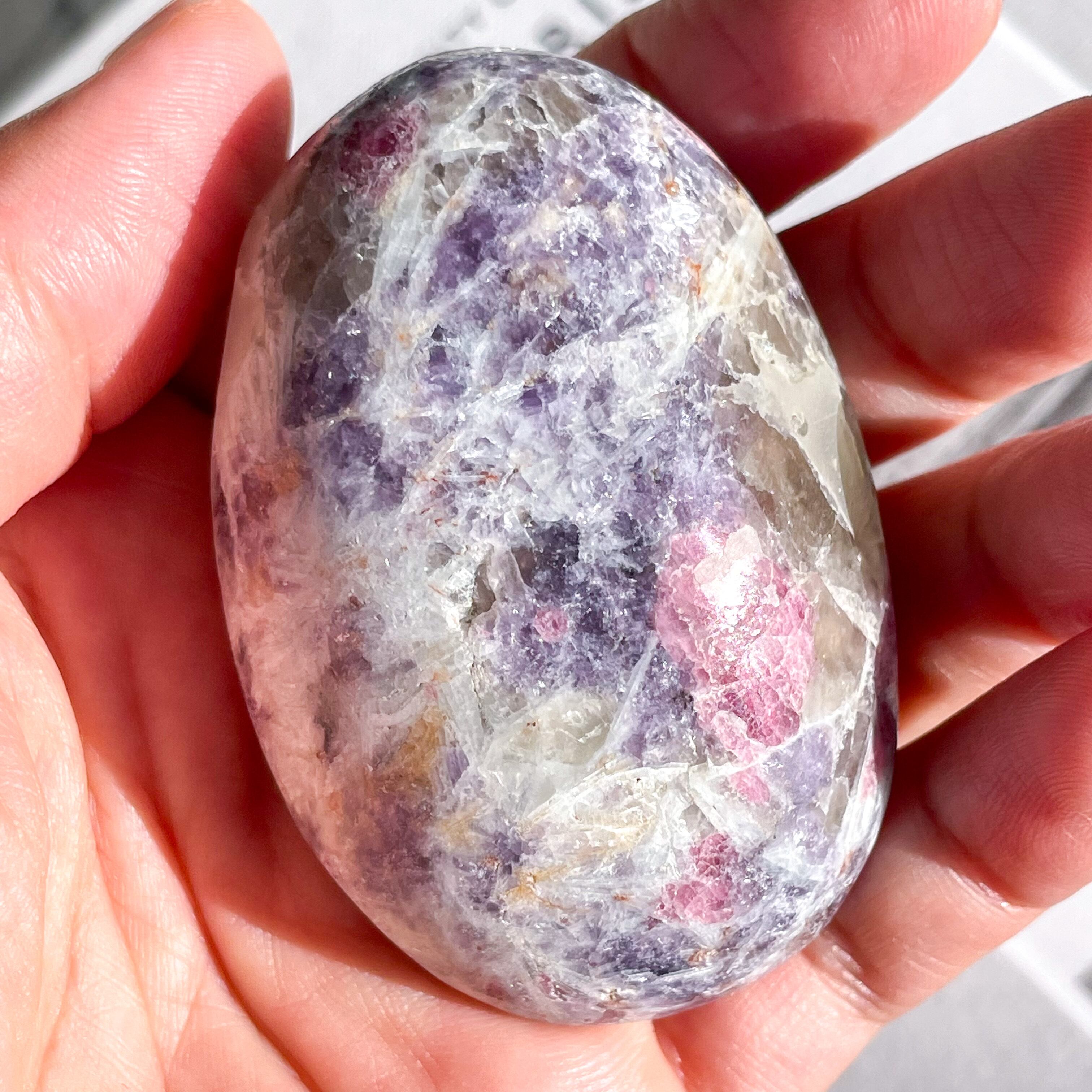 ピンクトルマリン、スモーキークォーツ、クリアクォーツが混ざり合う、ユニコーンストーンのパームストーン。