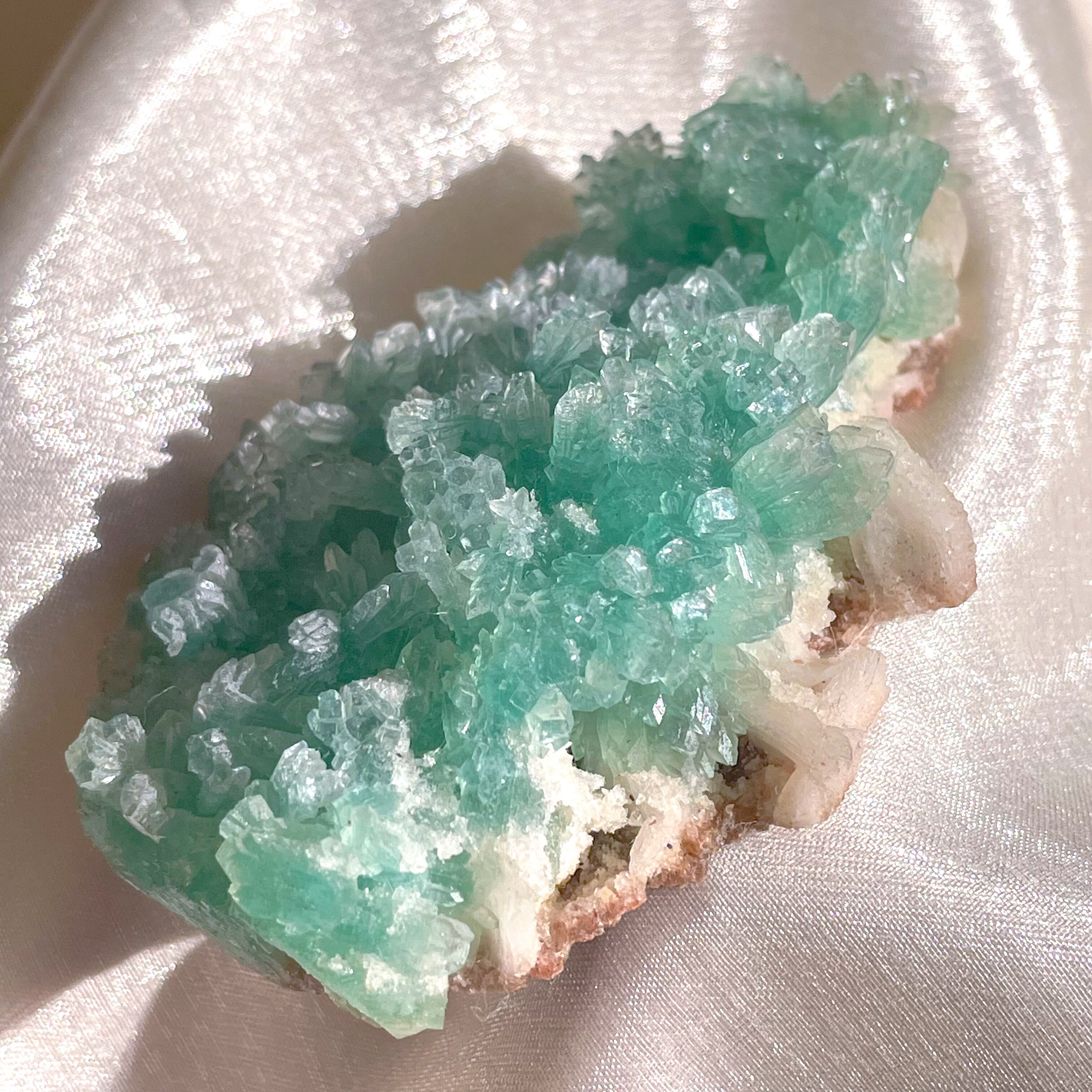 グリーンアポフィライト自体が流通量の少ない天然石ですが、今回のシリーズは、花のように結晶が形成されている、大変希少で美しいピースです。