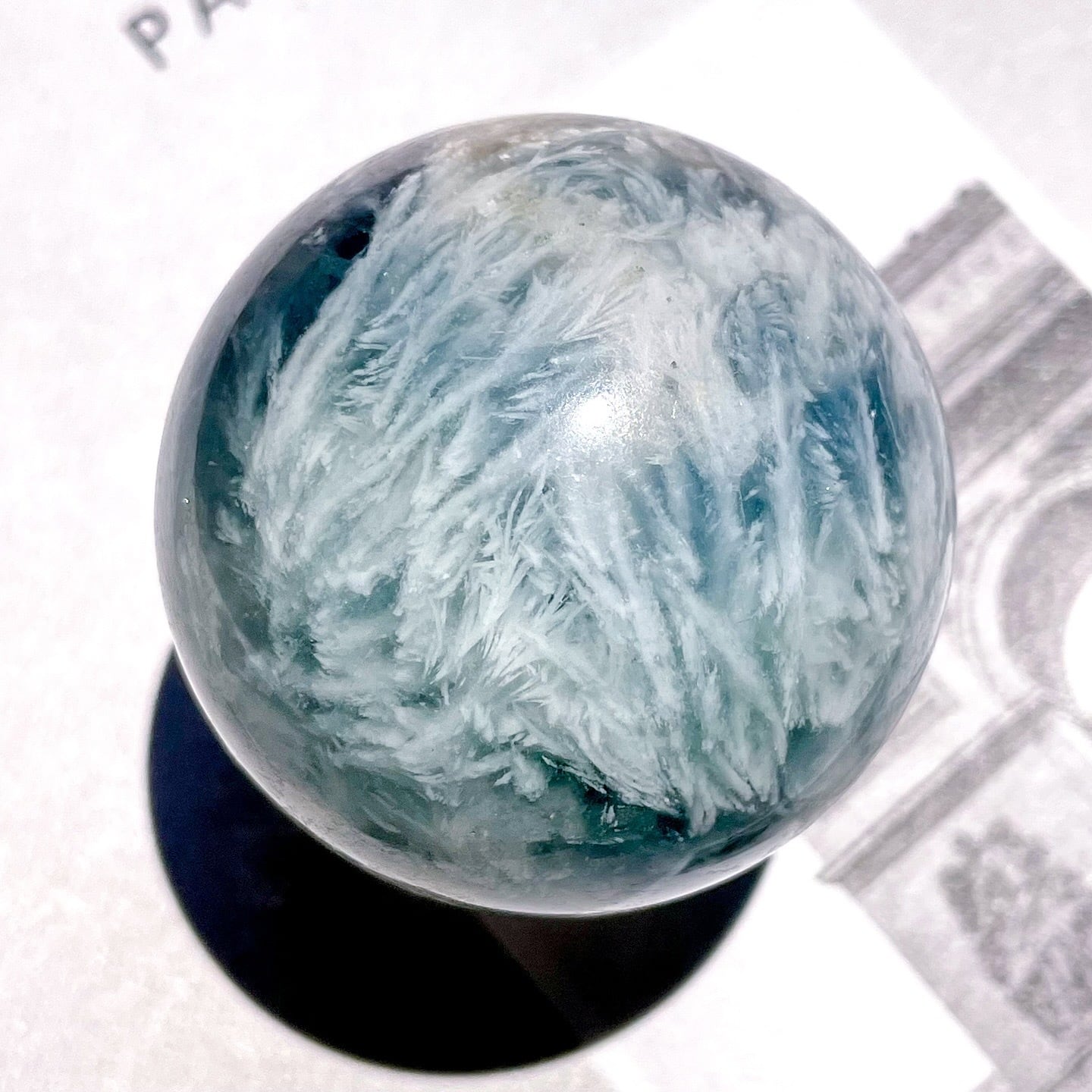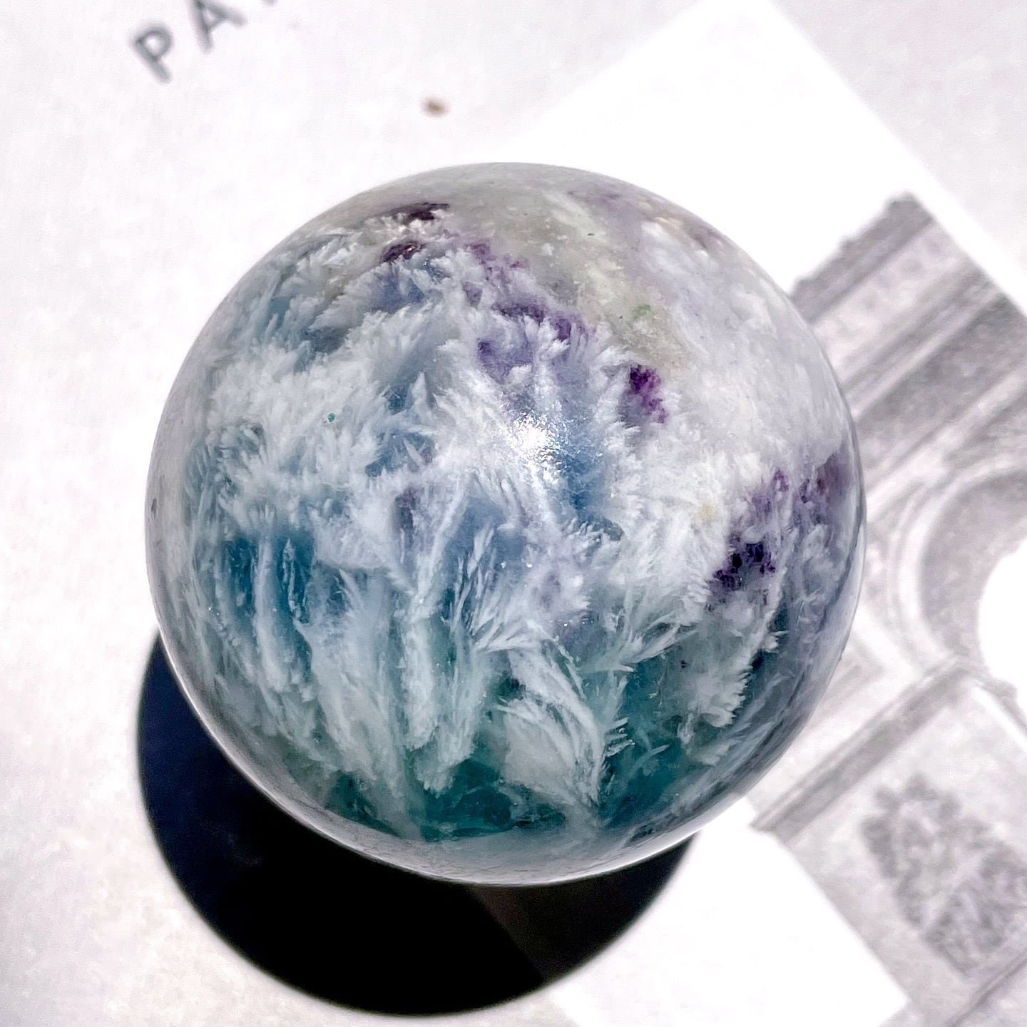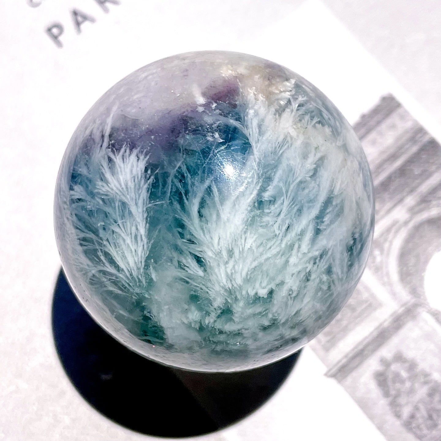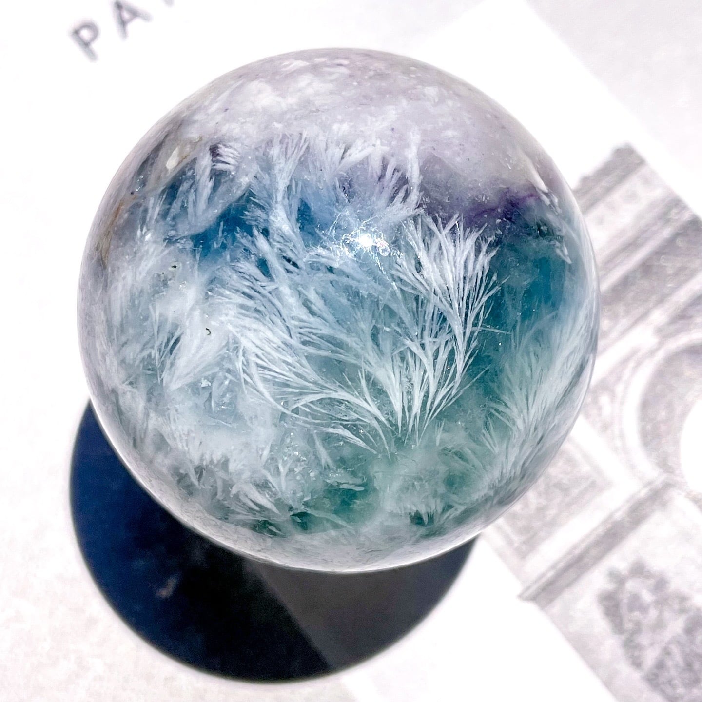 繊細なフェザーの模様に見惚れる、フェザーブルーフローライトのスフィア。