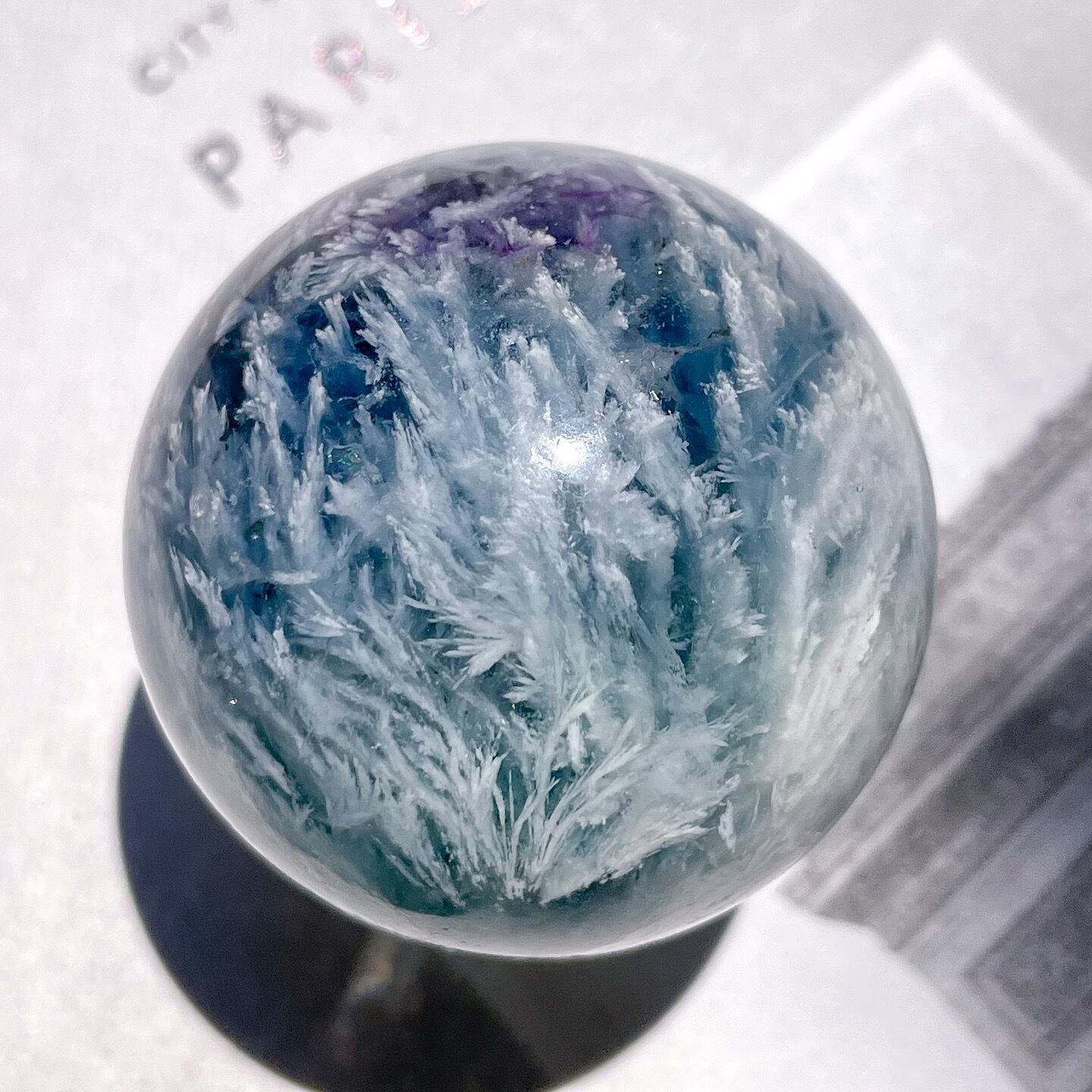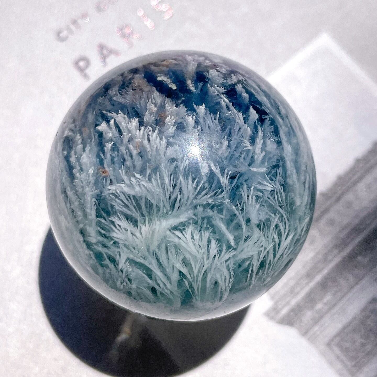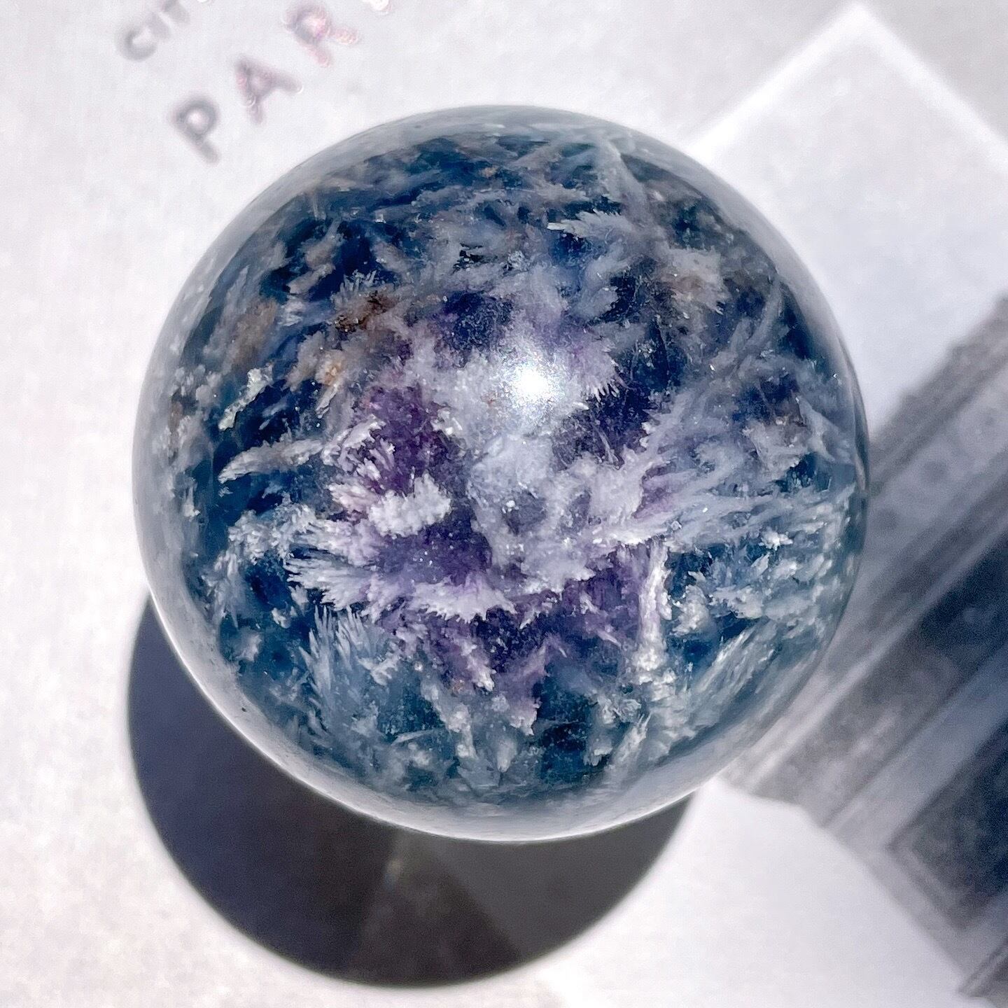 繊細なフェザーの模様に見惚れる、フェザーブルーフローライトのスフィア。