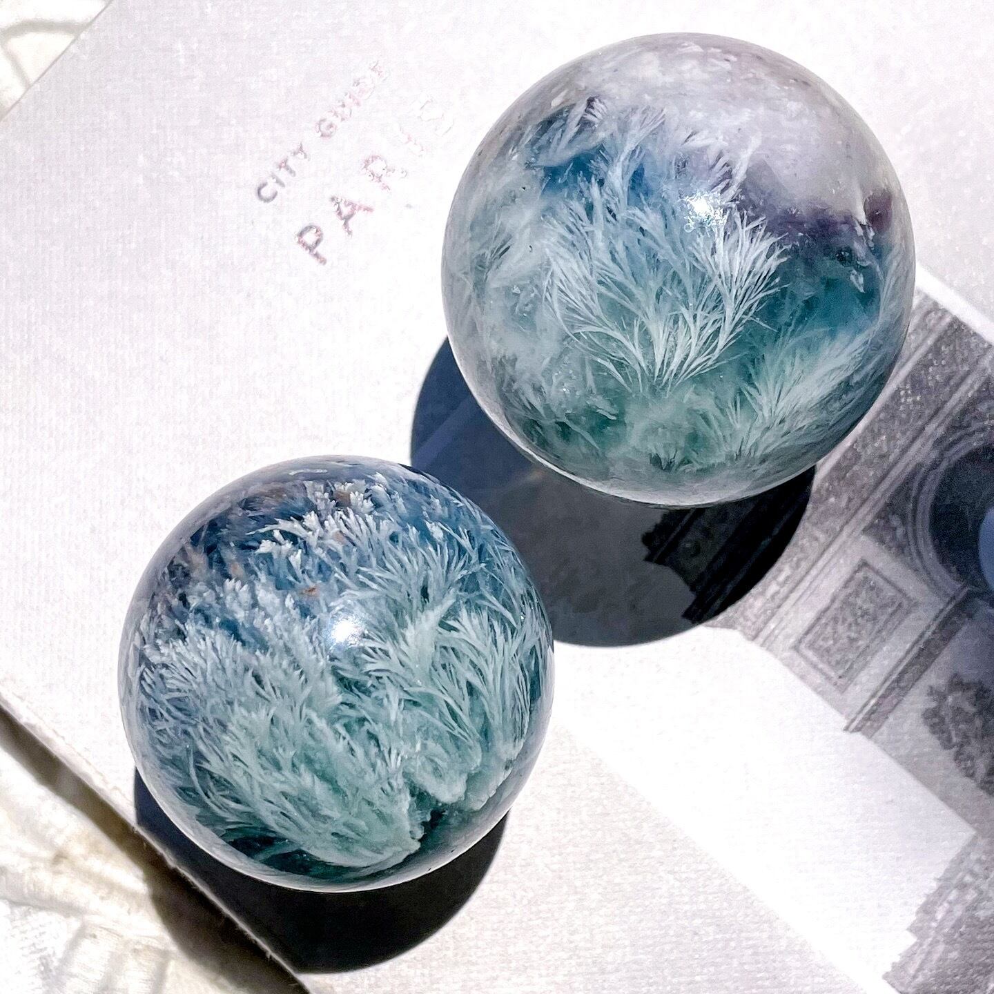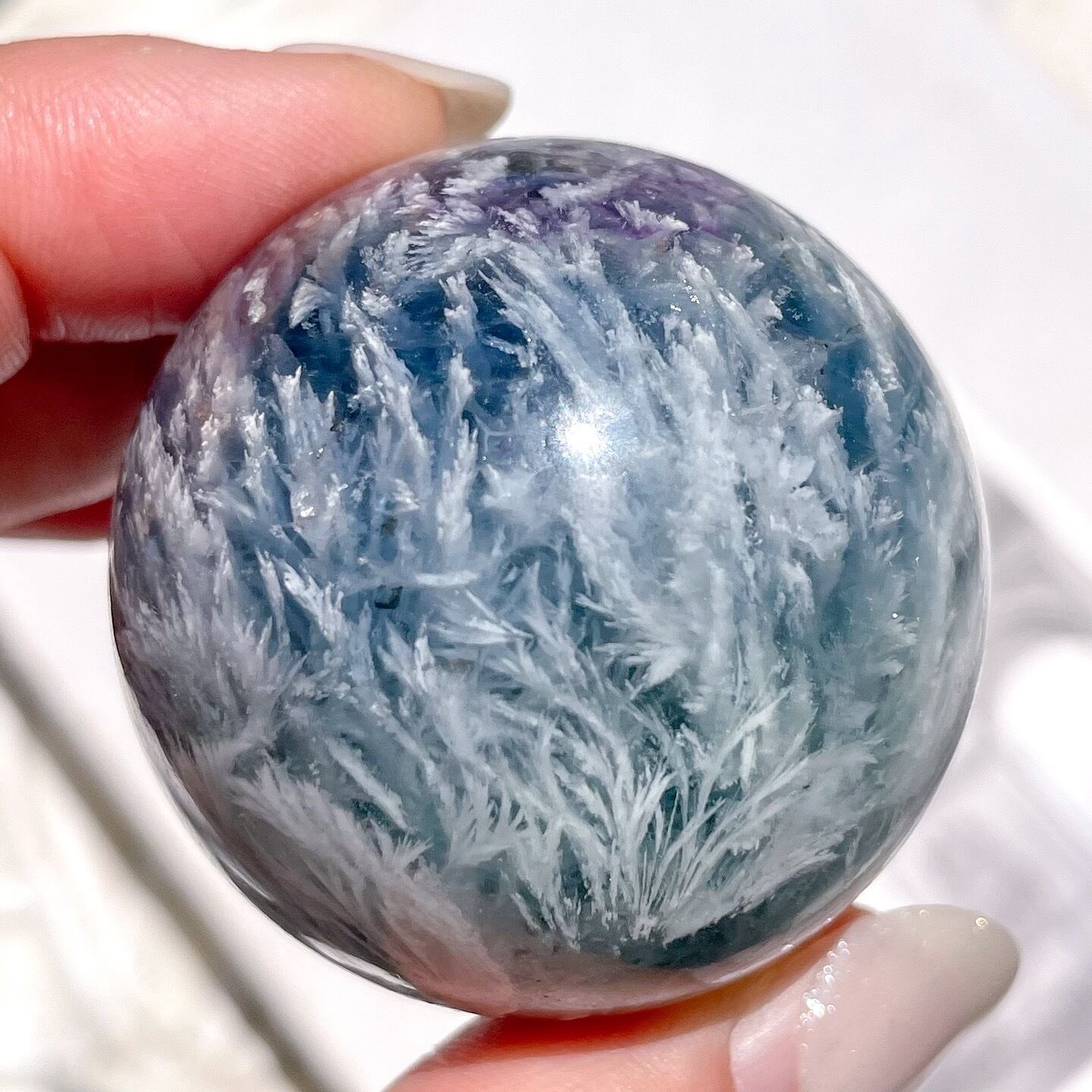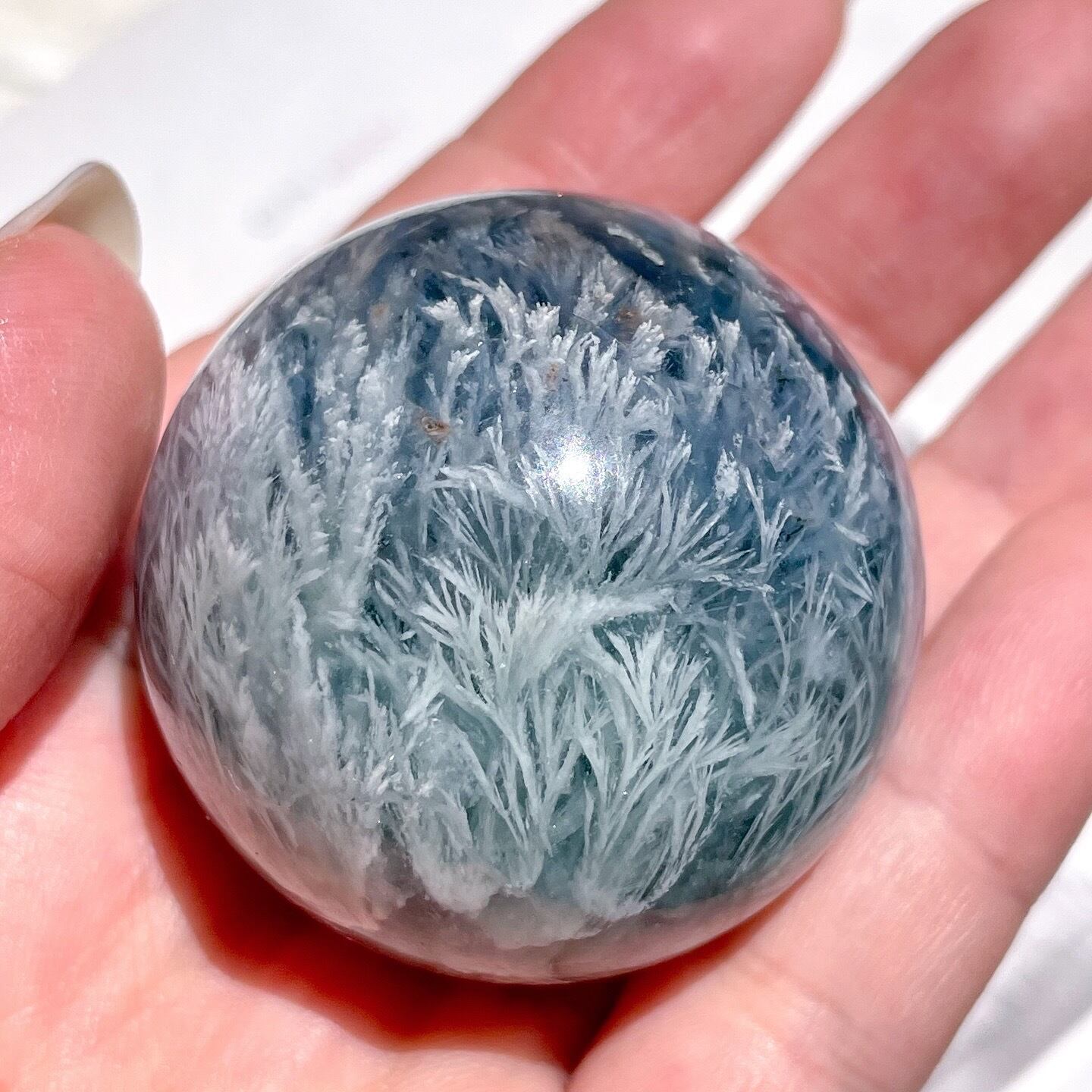 繊細なフェザーの模様に見惚れる、フェザーブルーフローライトのスフィア。