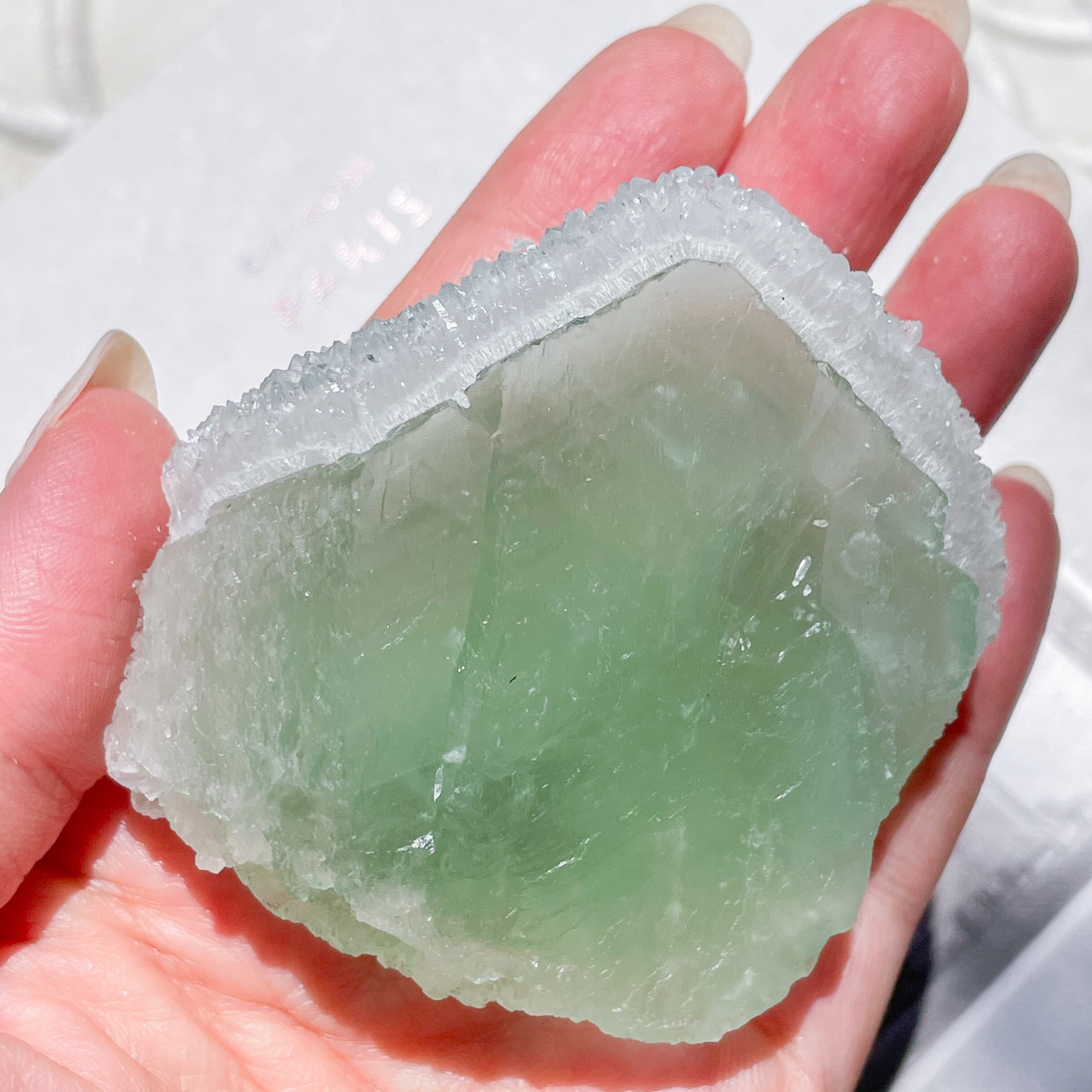 瑞々しいグリーンと、キラキラホワイトカラーのドゥルージーが印象的な、グリーンフローライト原石です。