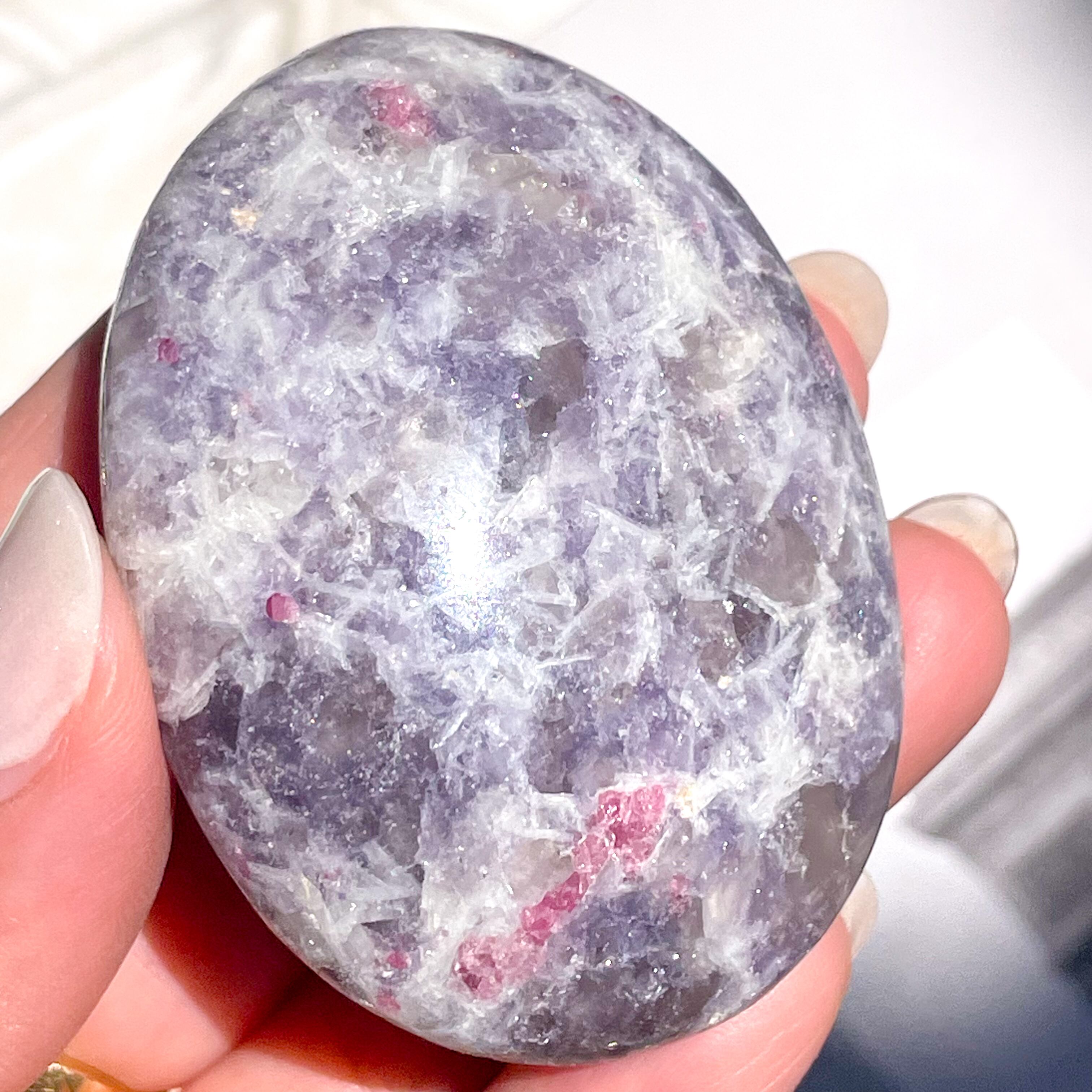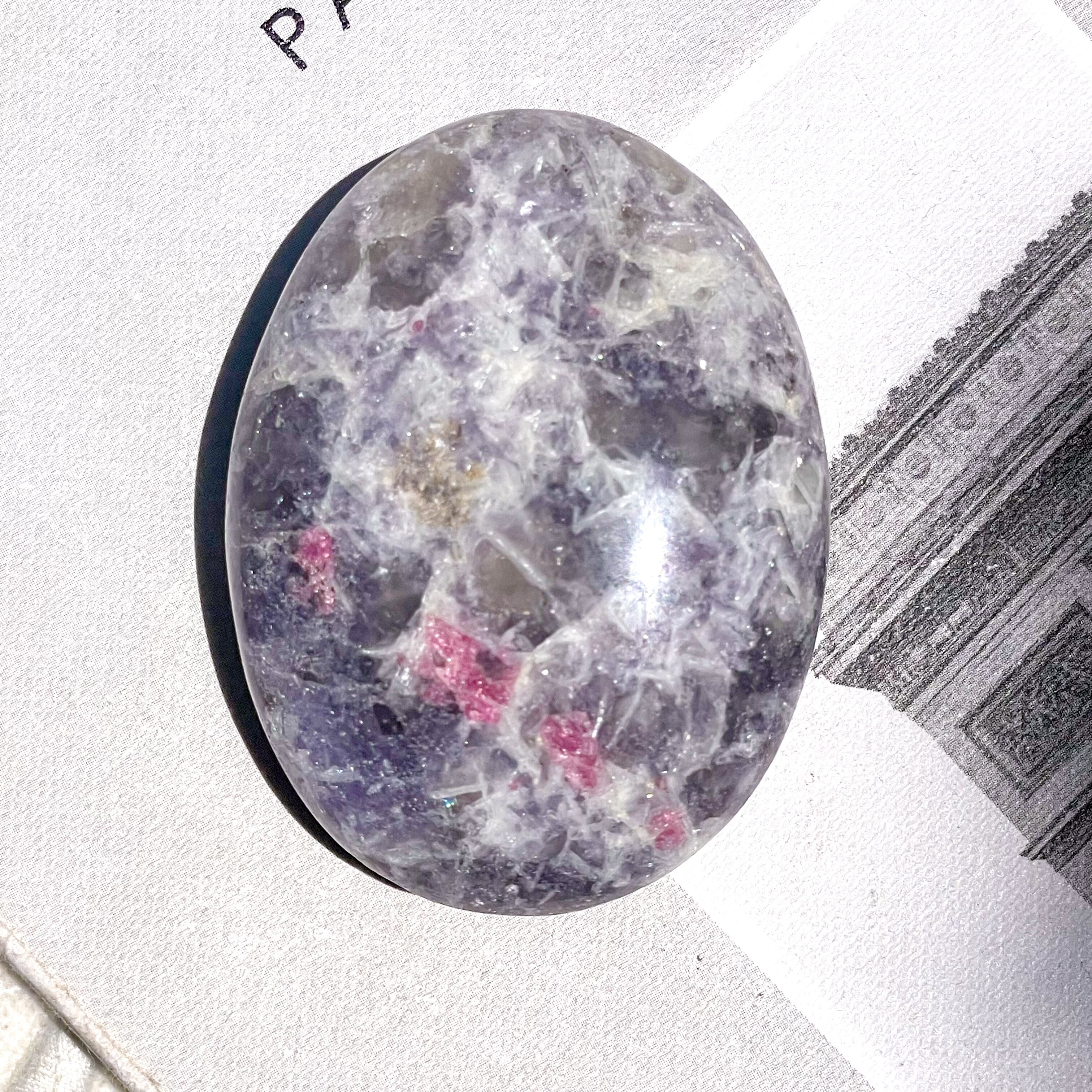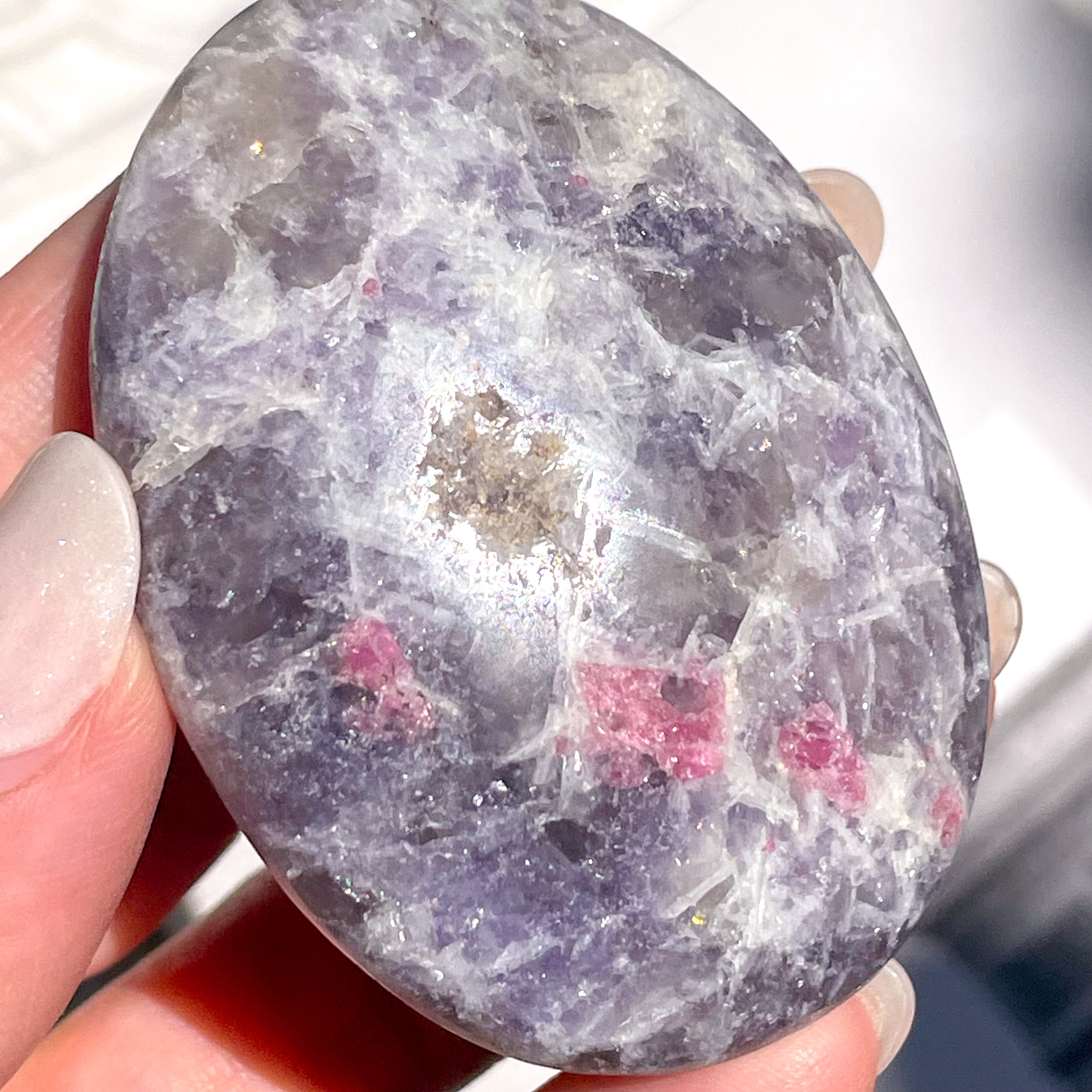 レピドライト、ピンクトルマリン、スモーキークォーツ、クリアクォーツが混ざり合う、ユニコーンストーンのパームストーン。