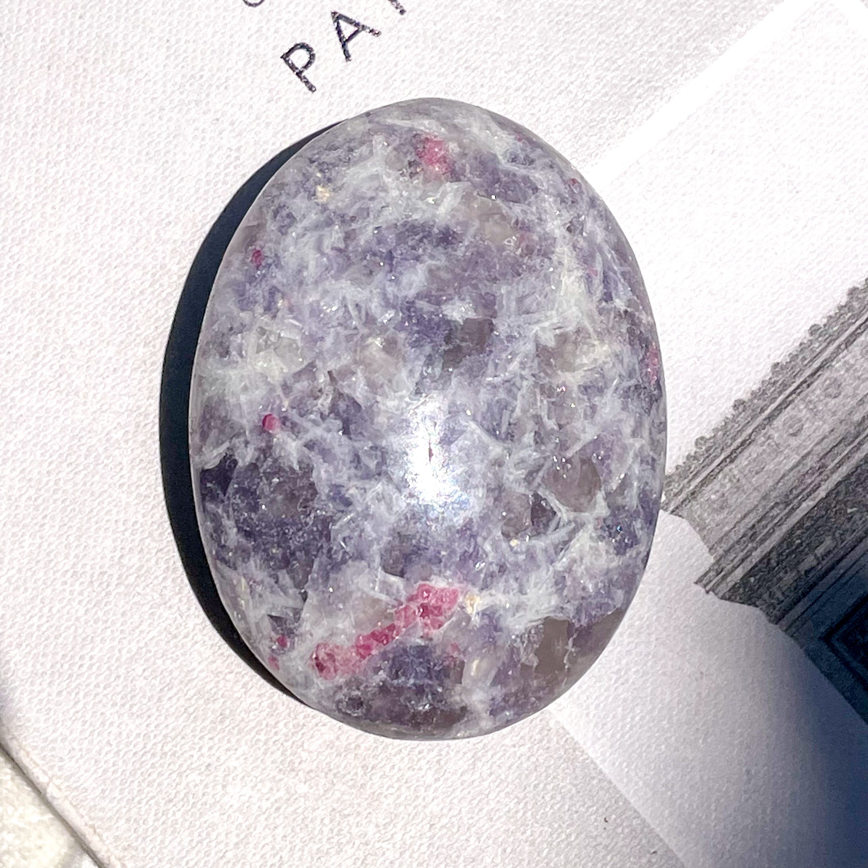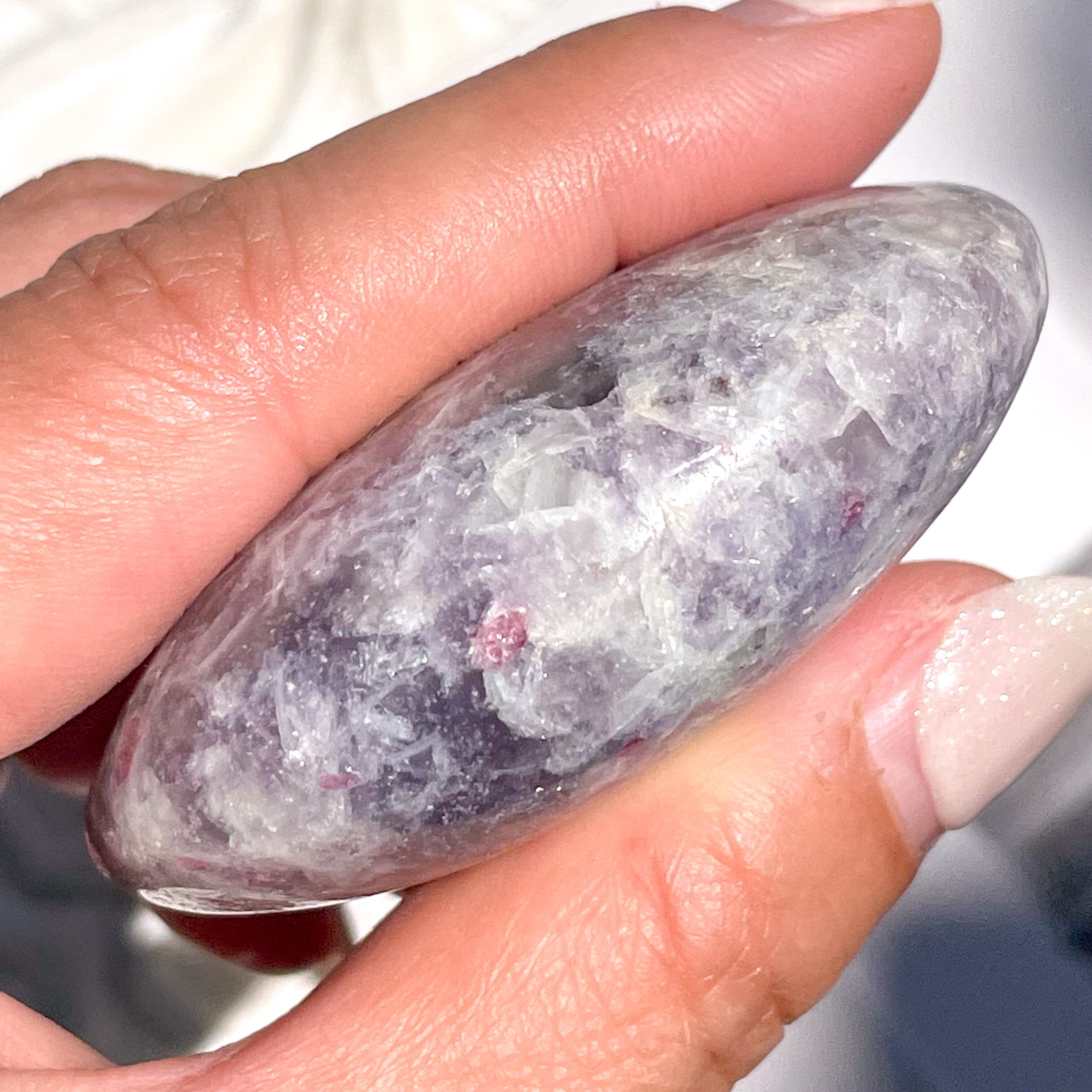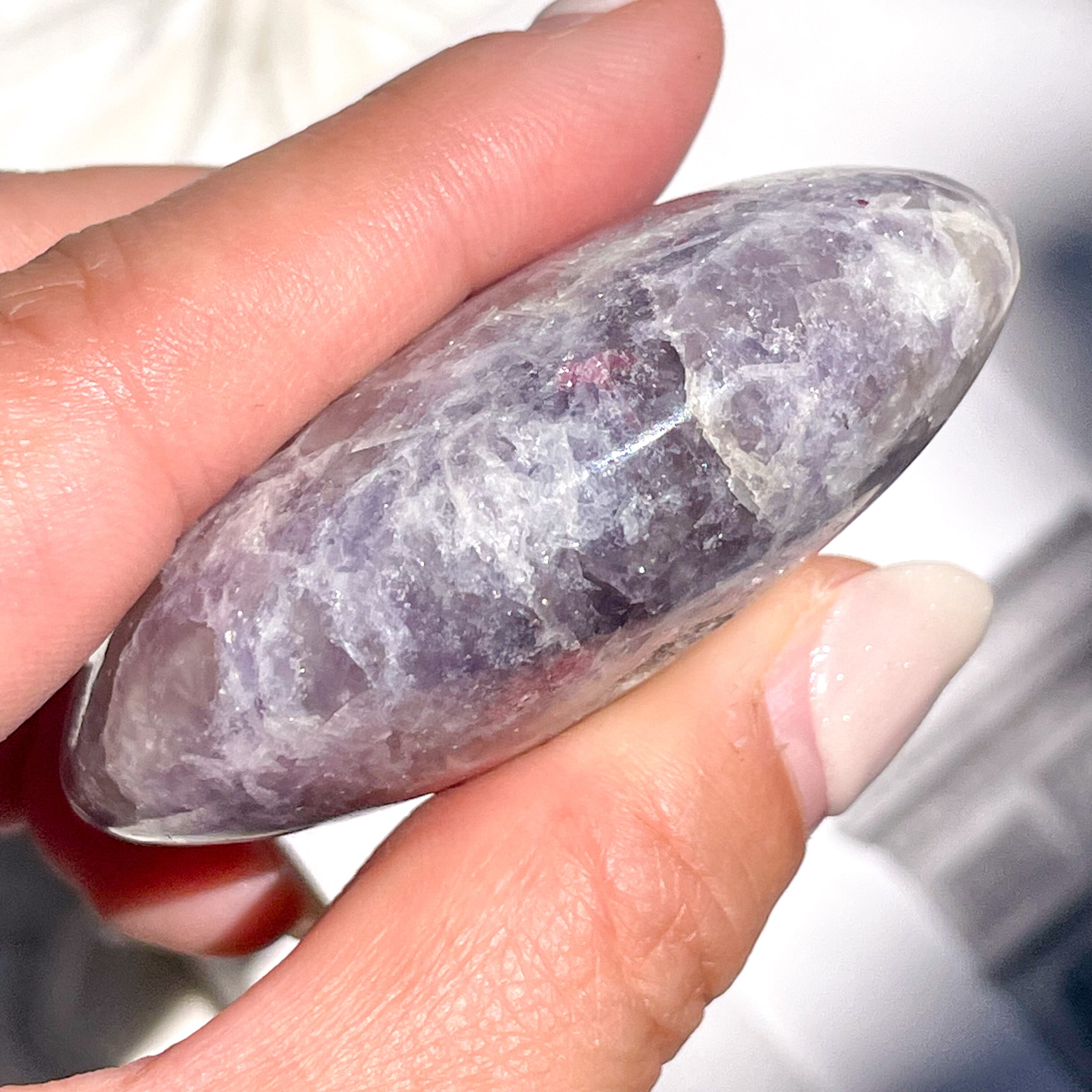 レピドライト、ピンクトルマリン、スモーキークォーツ、クリアクォーツが混ざり合う、ユニコーンストーンのパームストーン。