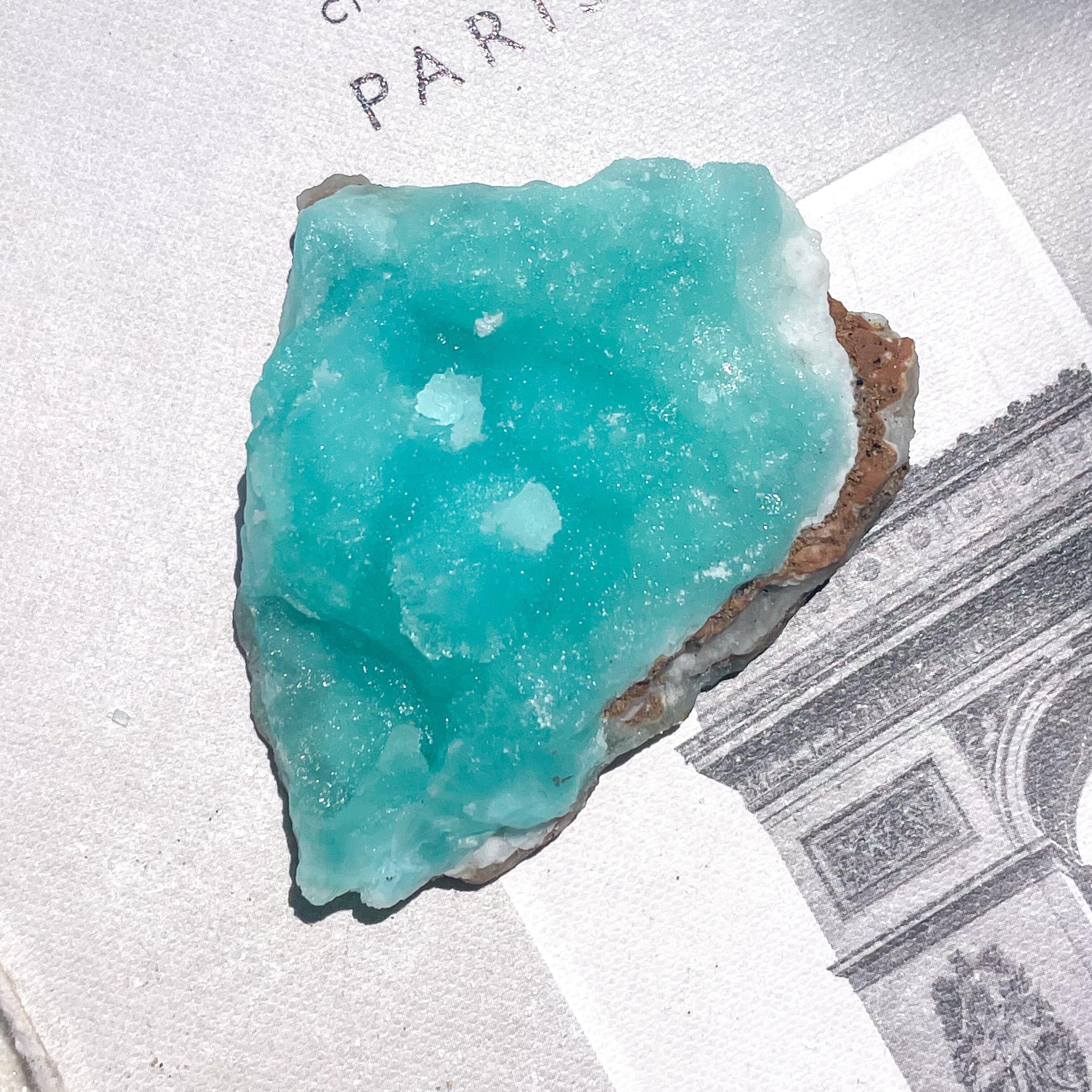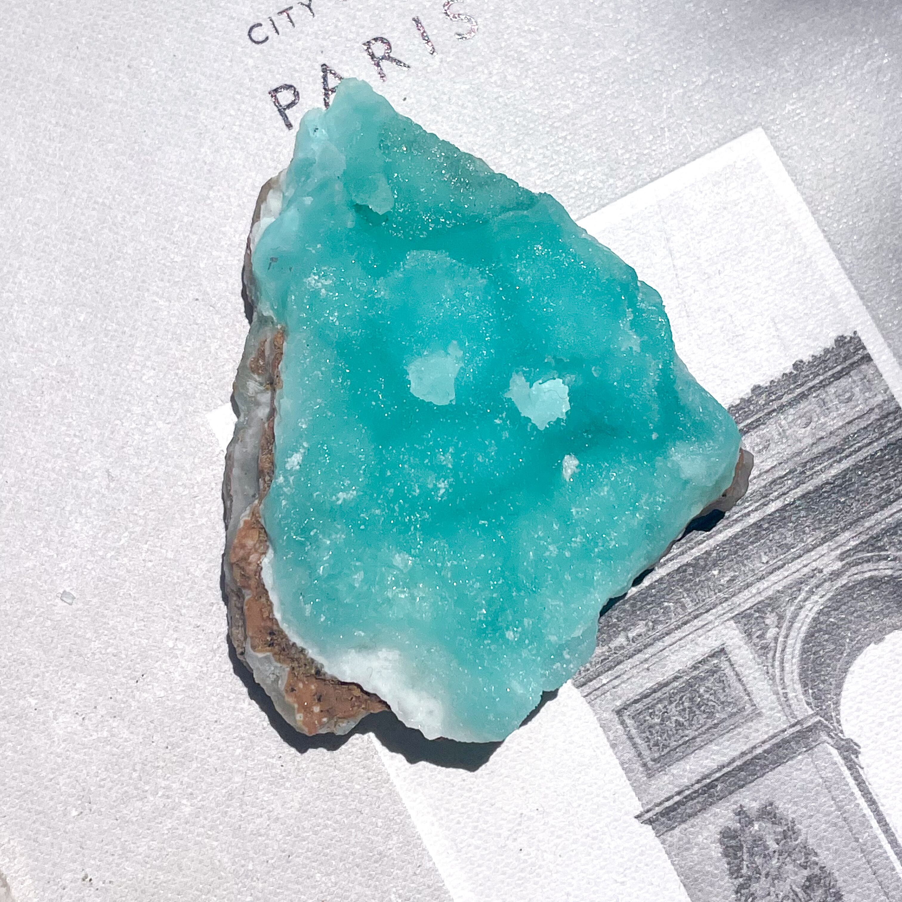 目の覚めるような鮮やかなライトブルーが心を弾ませる、パキスタン産のブルーアラゴナイト。