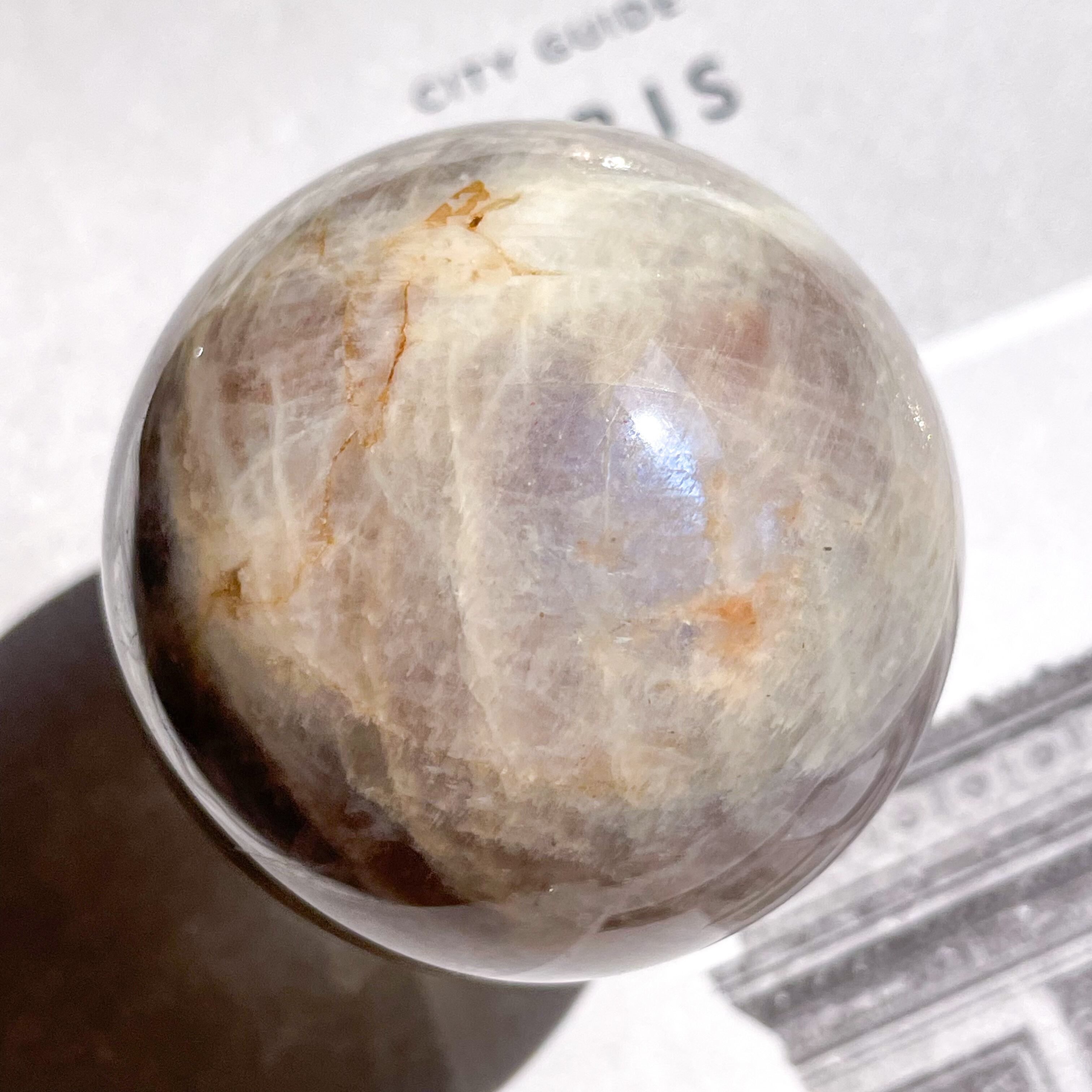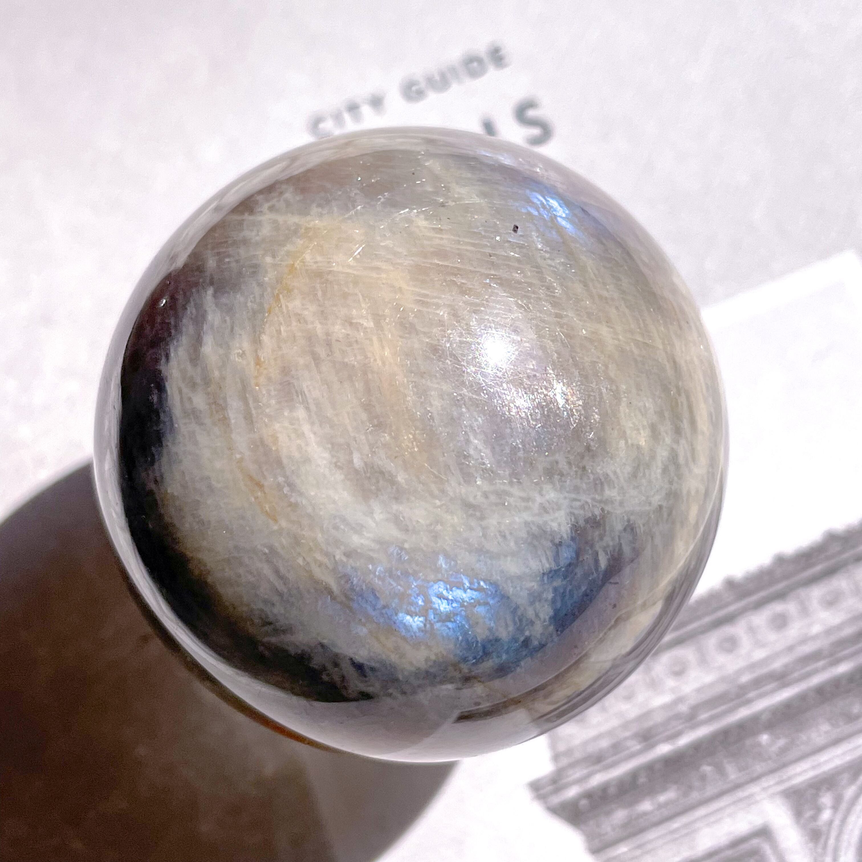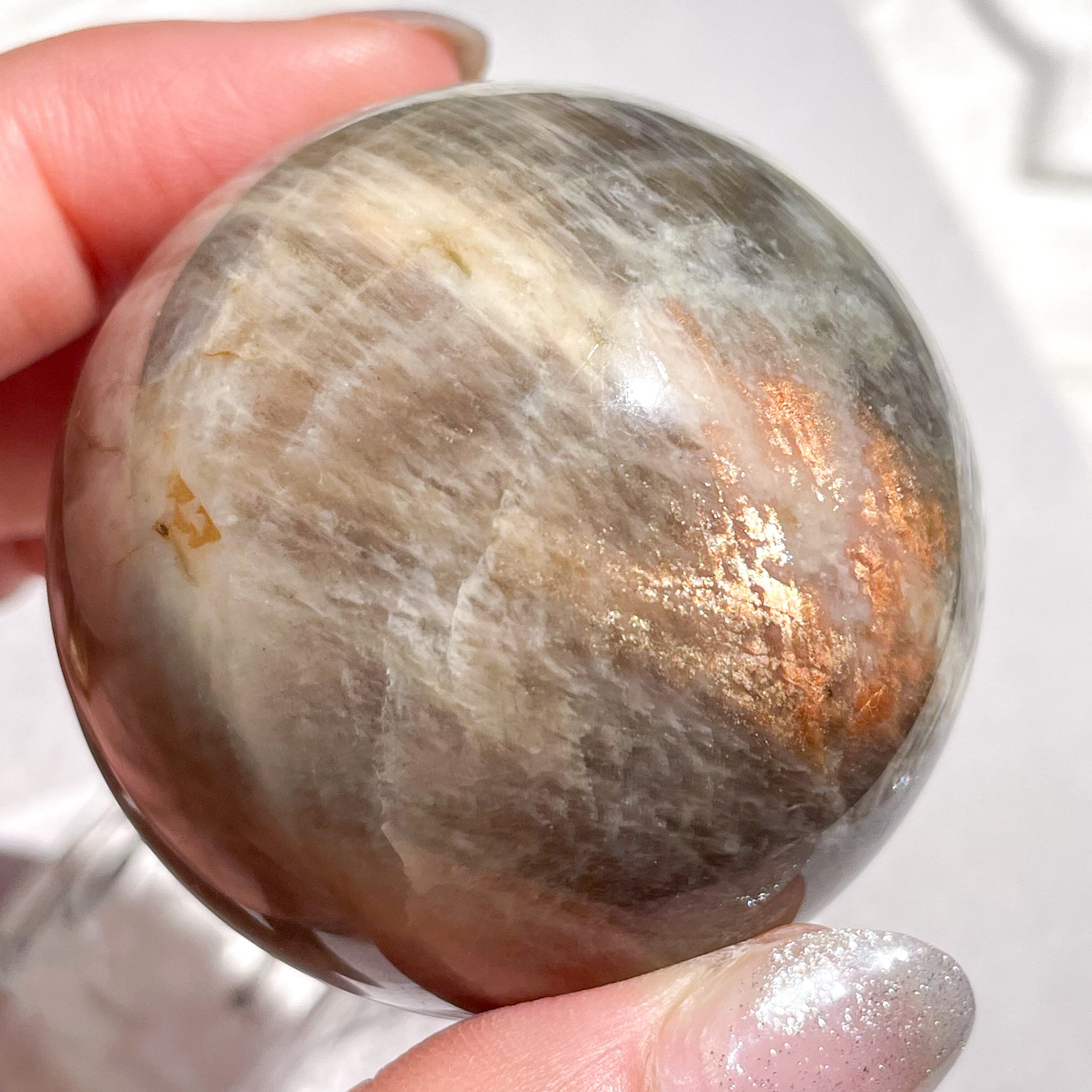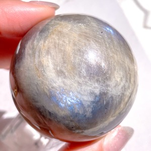 サンストーンの特徴である、シャンパンゴールド色に煌めくアベンチュレッセンス効果と、ムーンストーンに特徴的な、静かな光・青色のアデュラレッセンス効果、このふたつを併せ持つ、神秘的なストーンです♡