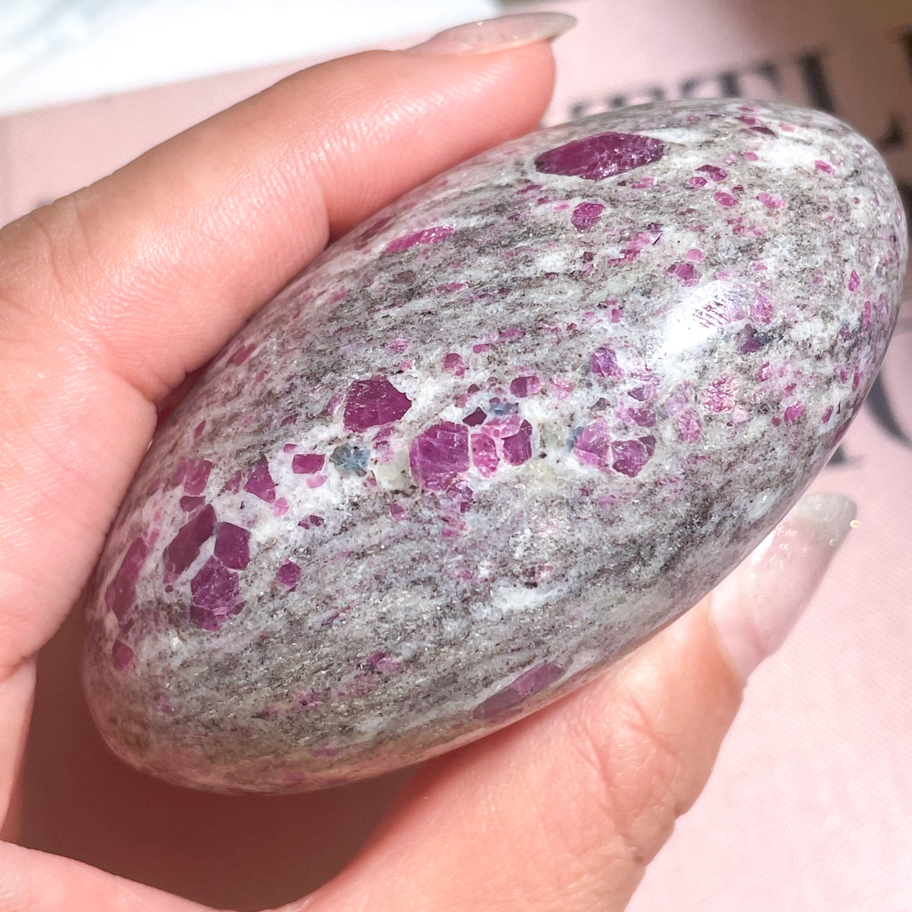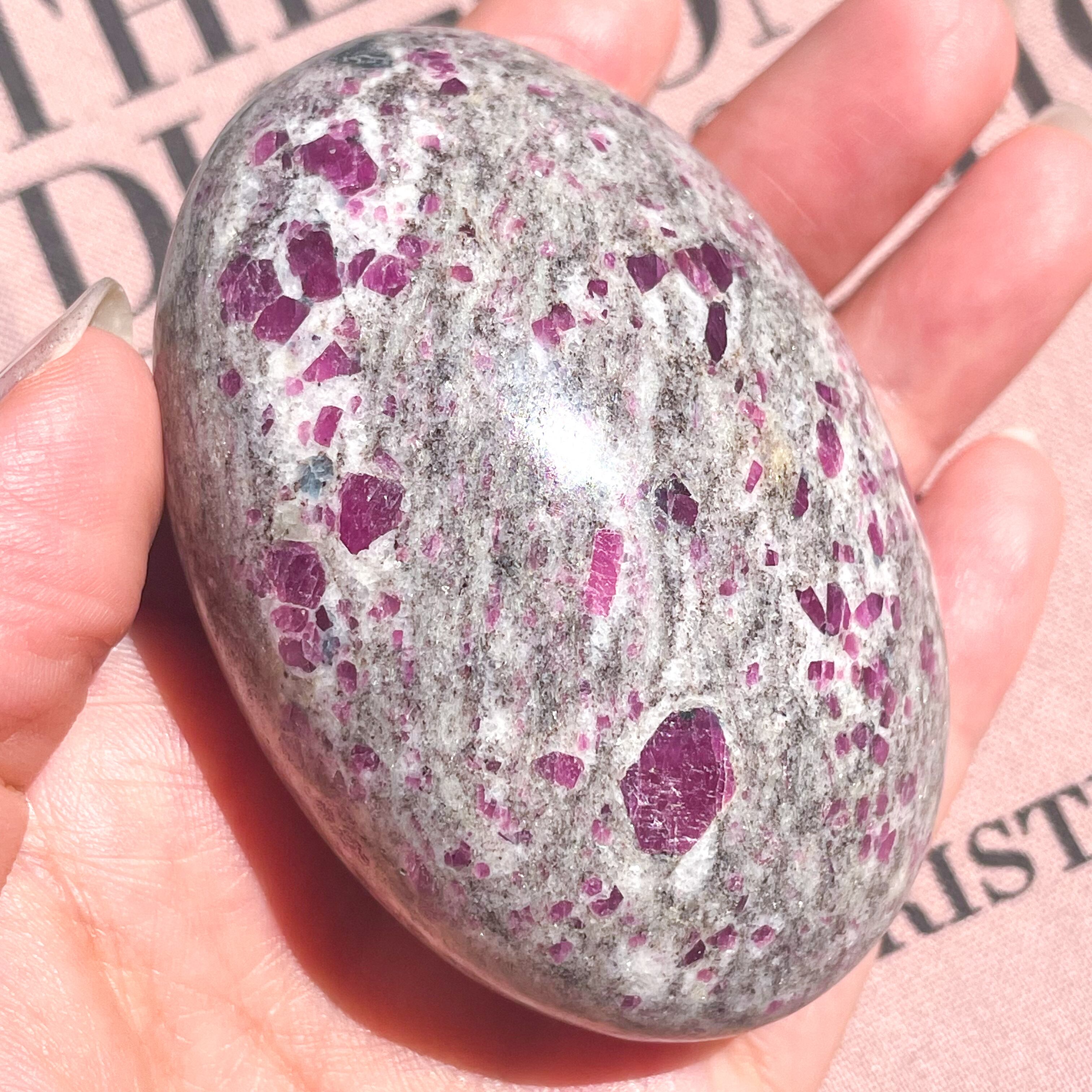 キャンディみたいなルビーが散りばめられた、ルビーinマトリックスのパームストーン。