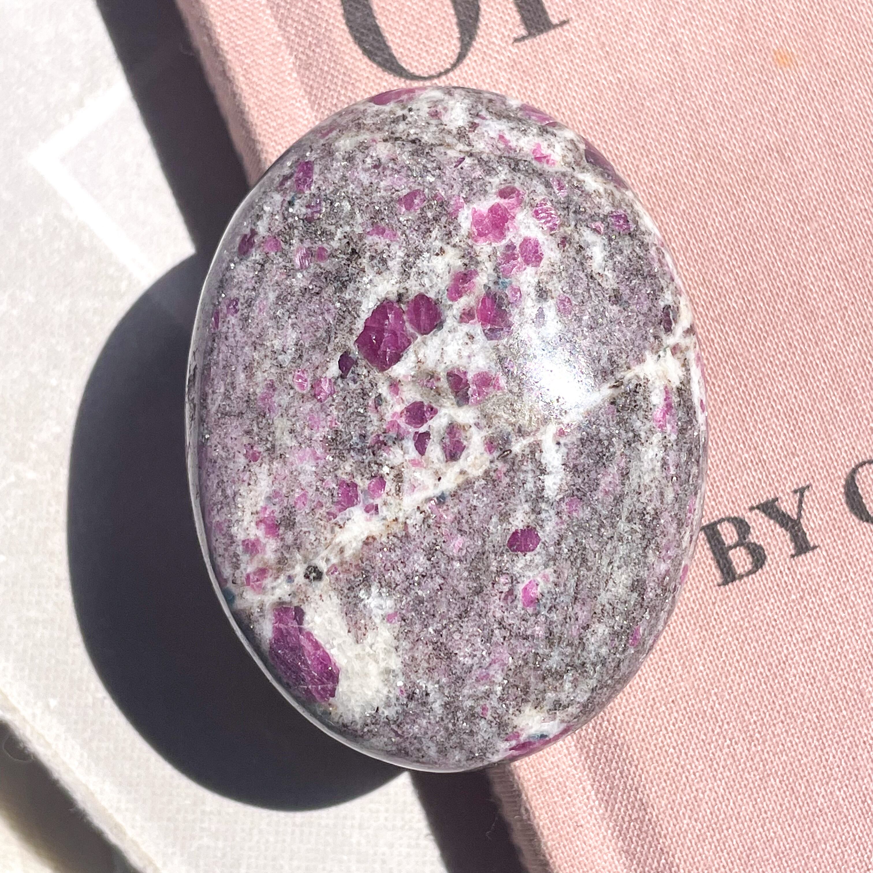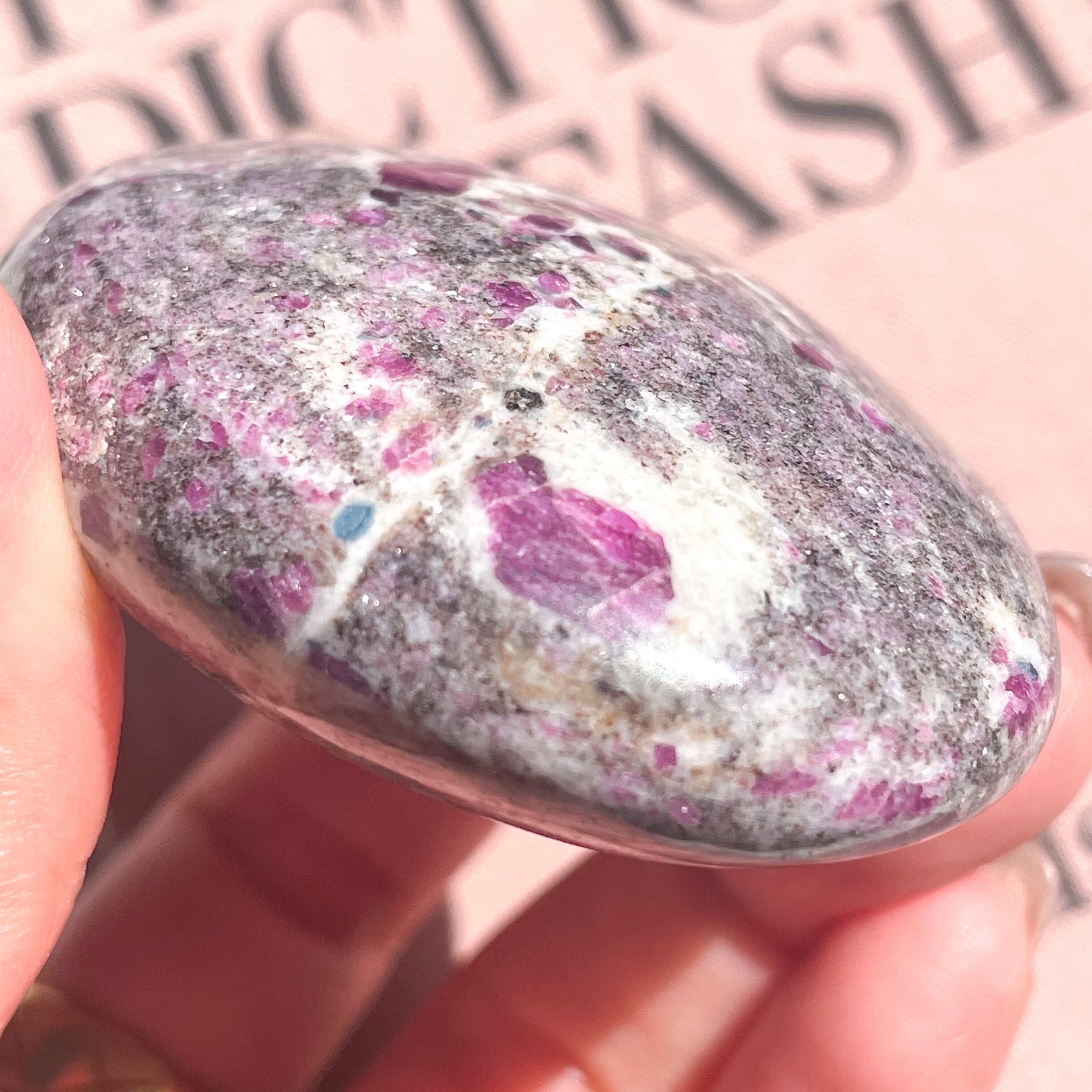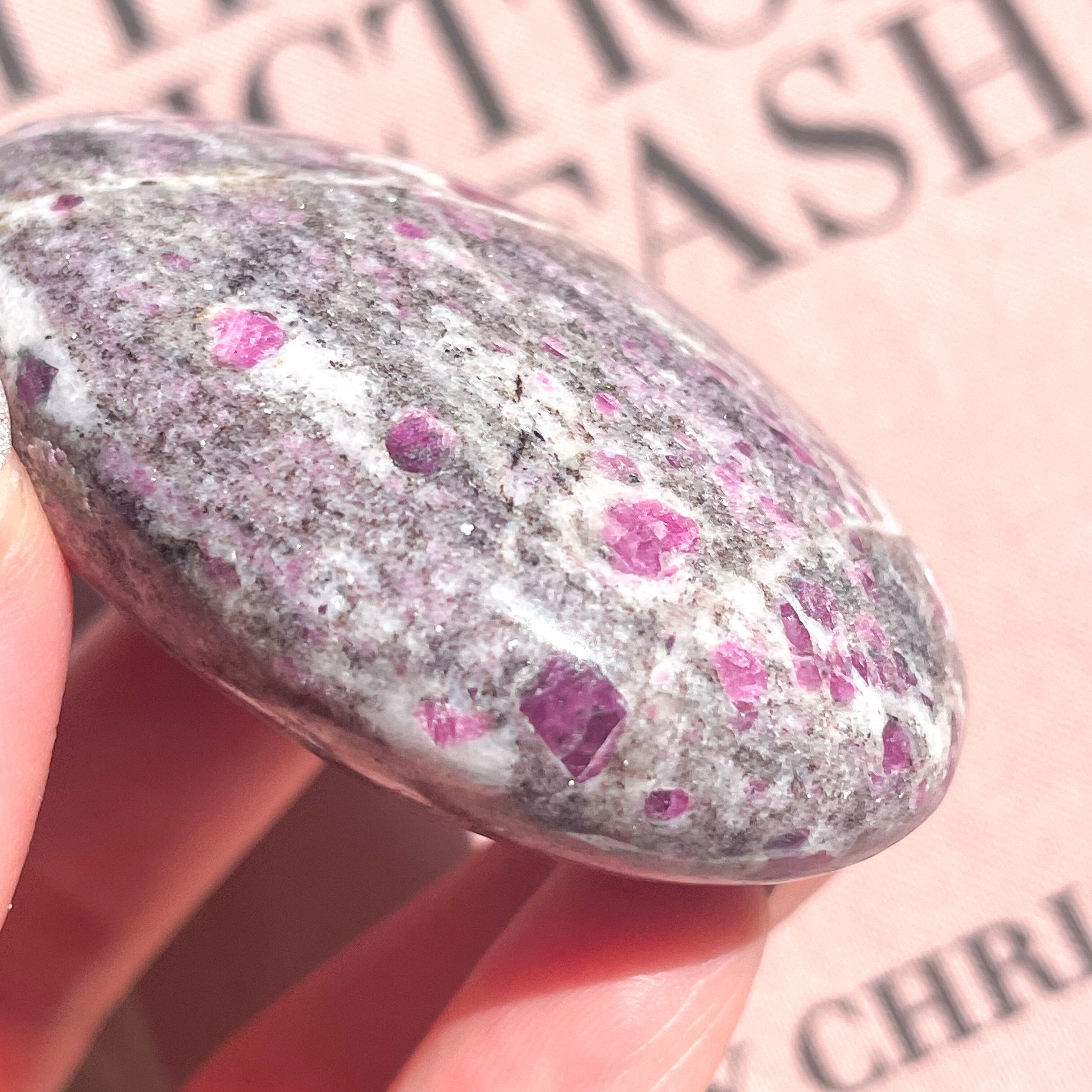 キャンディみたいなルビーが散りばめられた、ルビーinマトリックスのパームストーン。