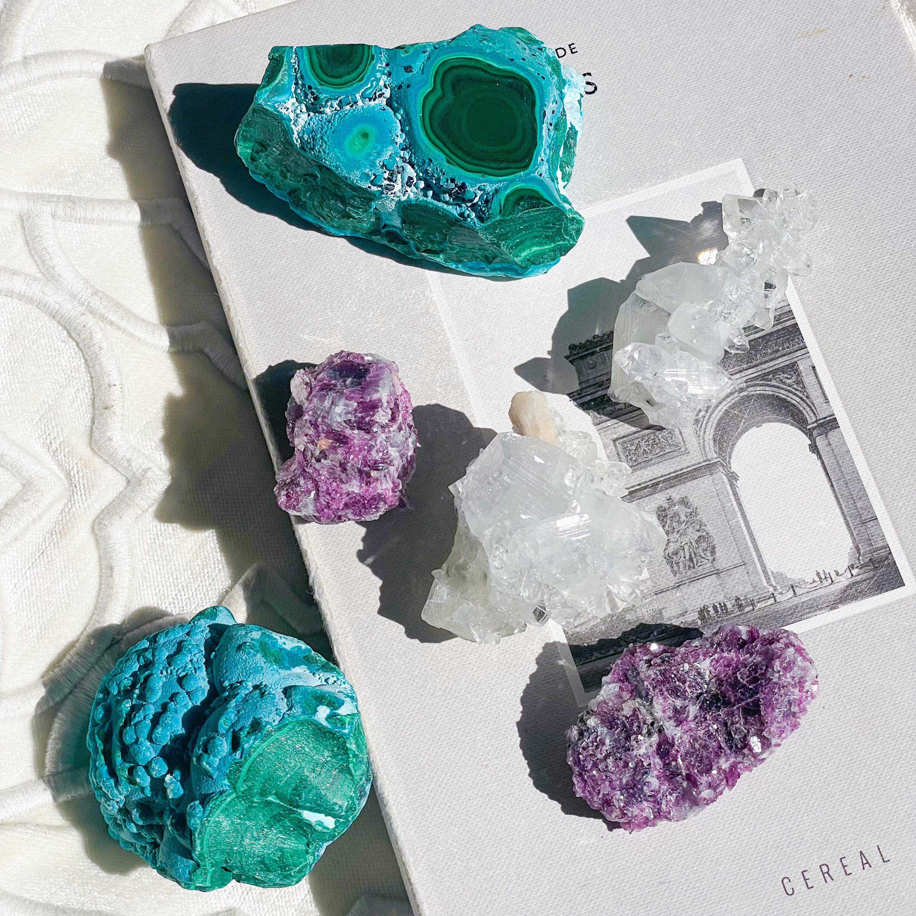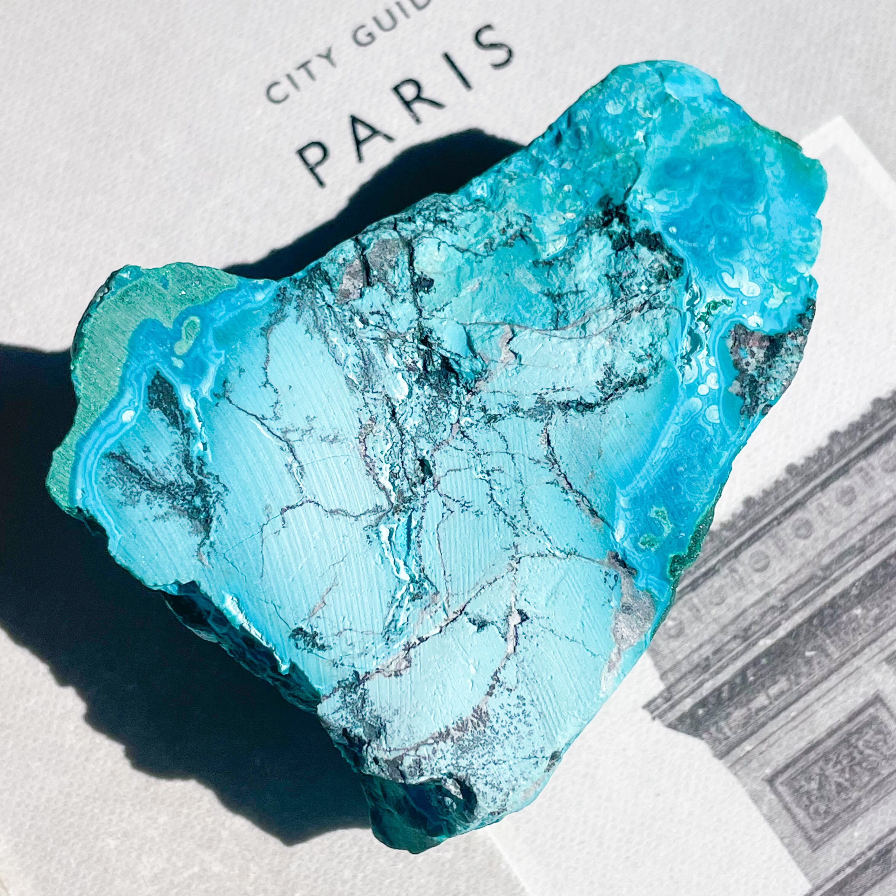 ビビッドなクリソコラのスカイブルー、マラカイトの明るいグリーンのコントラスト。