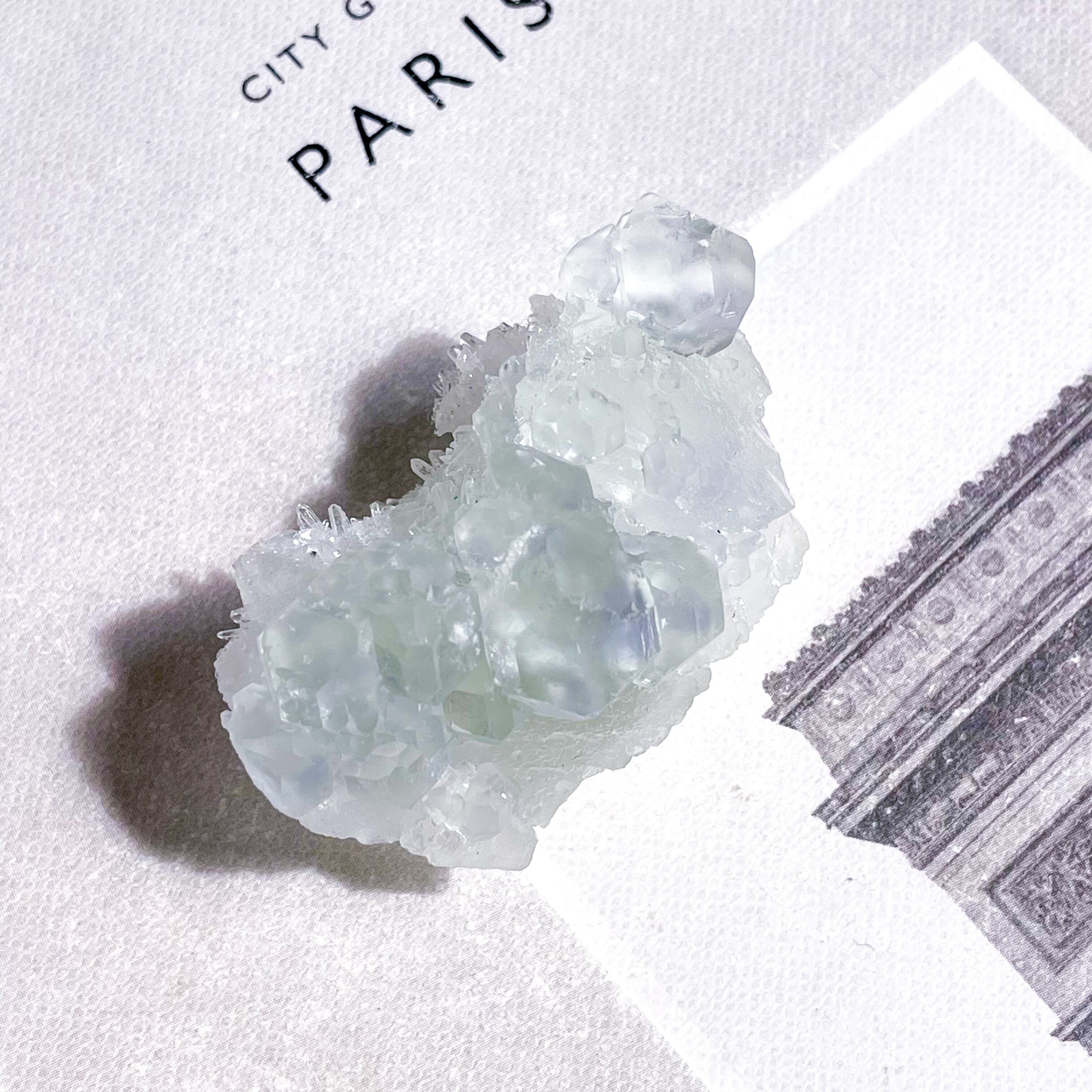 瑞々しいグリーンと、淡いブルーのバイカラーが印象的なフローライト原石です。