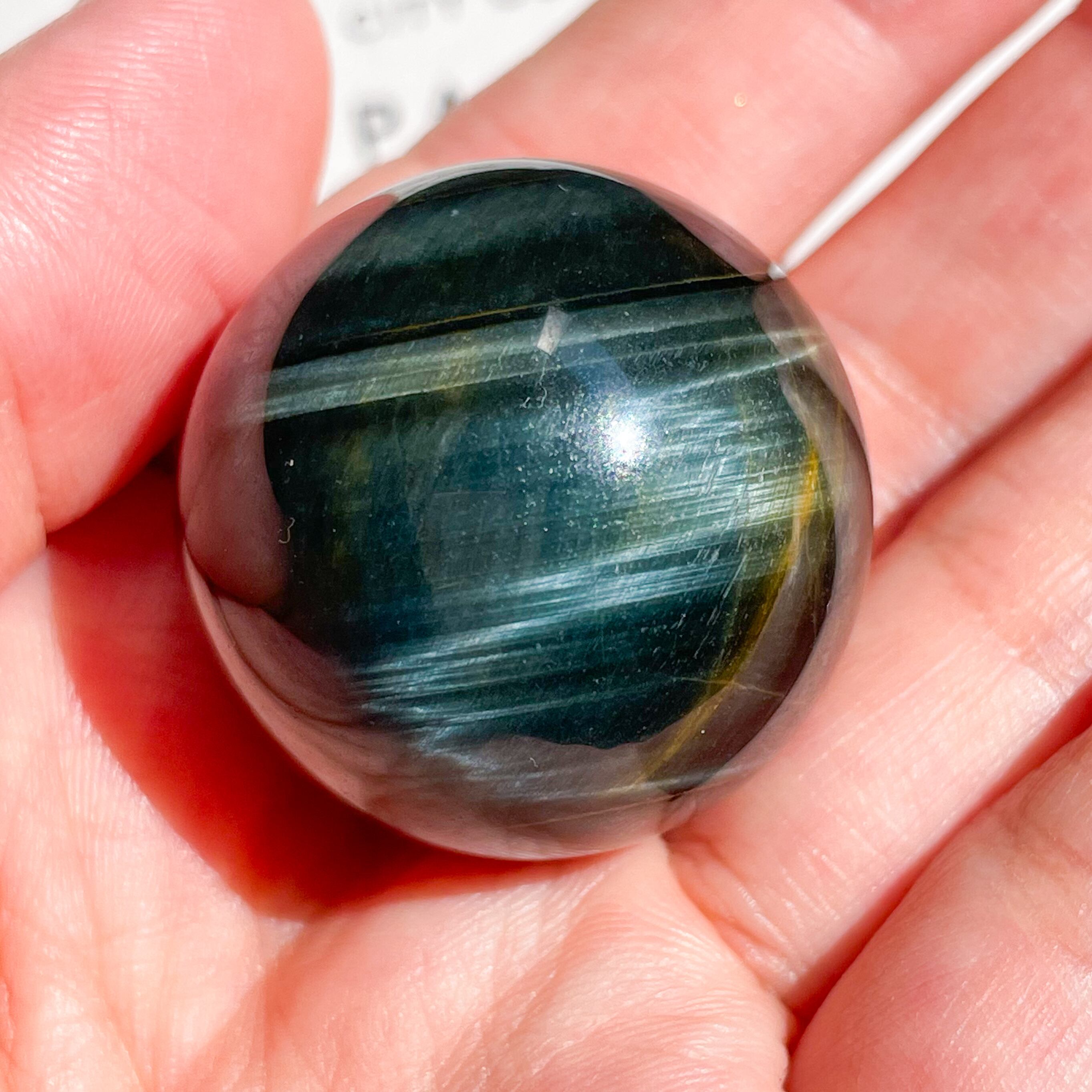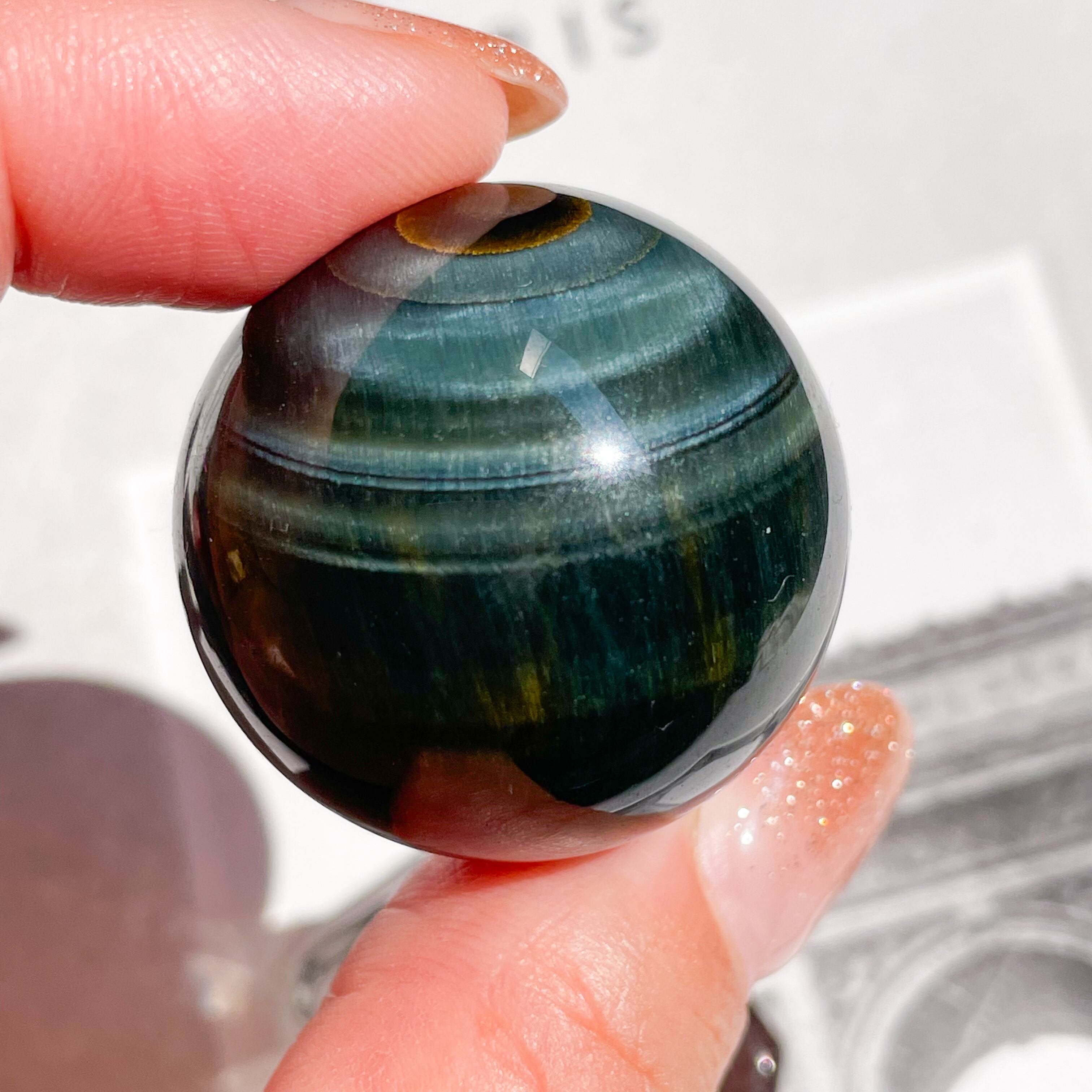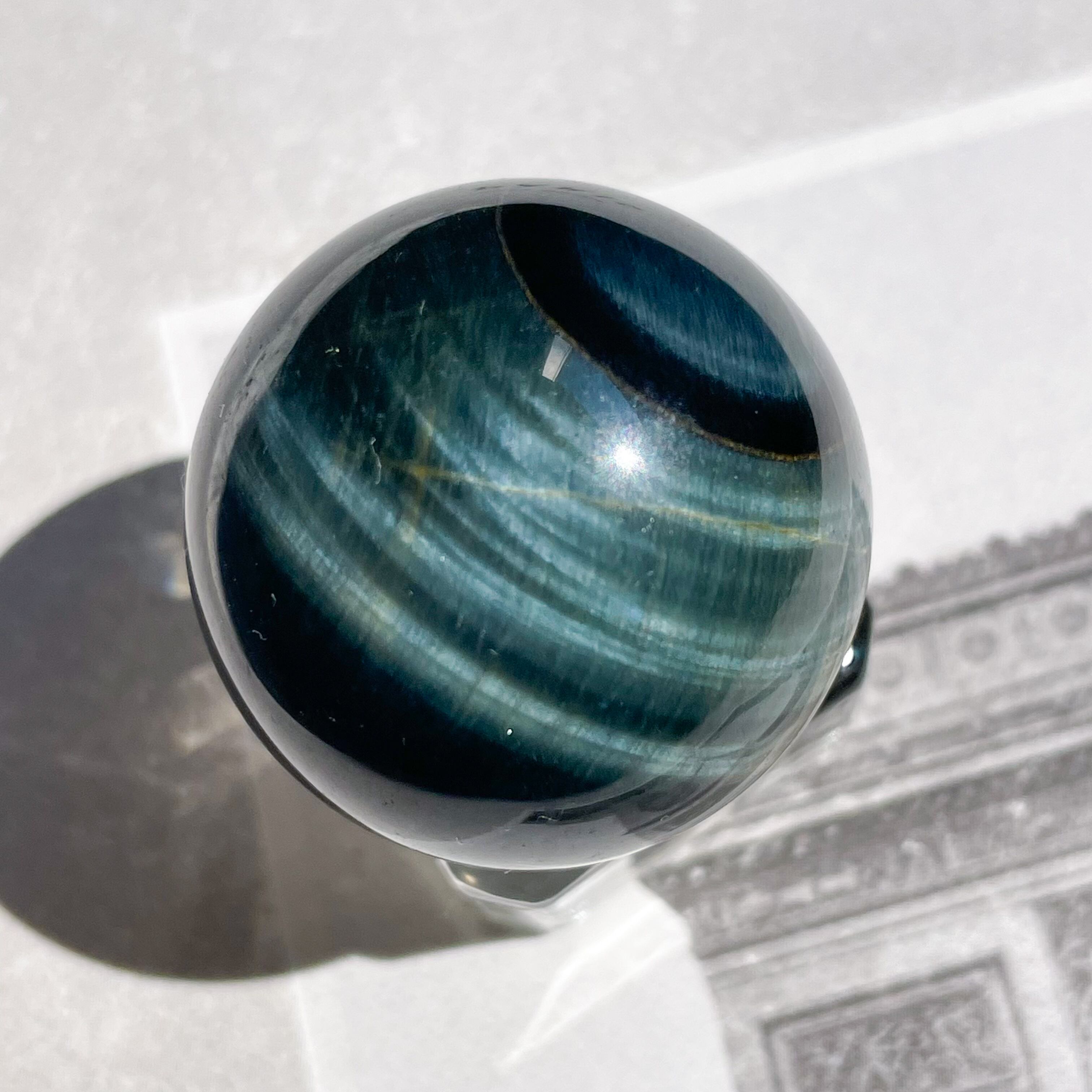 一見するとブラックのスフィアにも見えますが、角度によって現れる、美しいブルーの煌めきに息を呑んで見惚れてしまいます。
