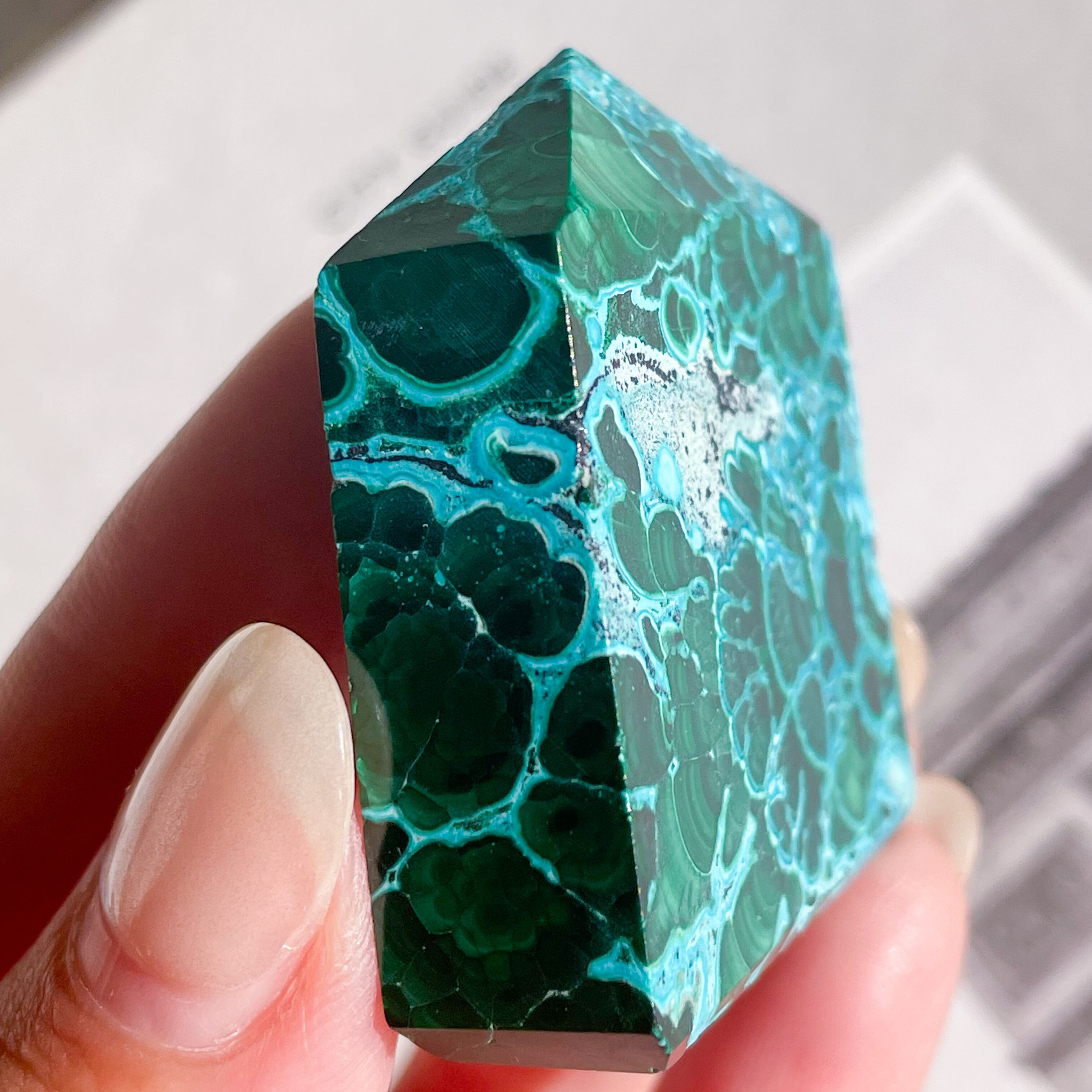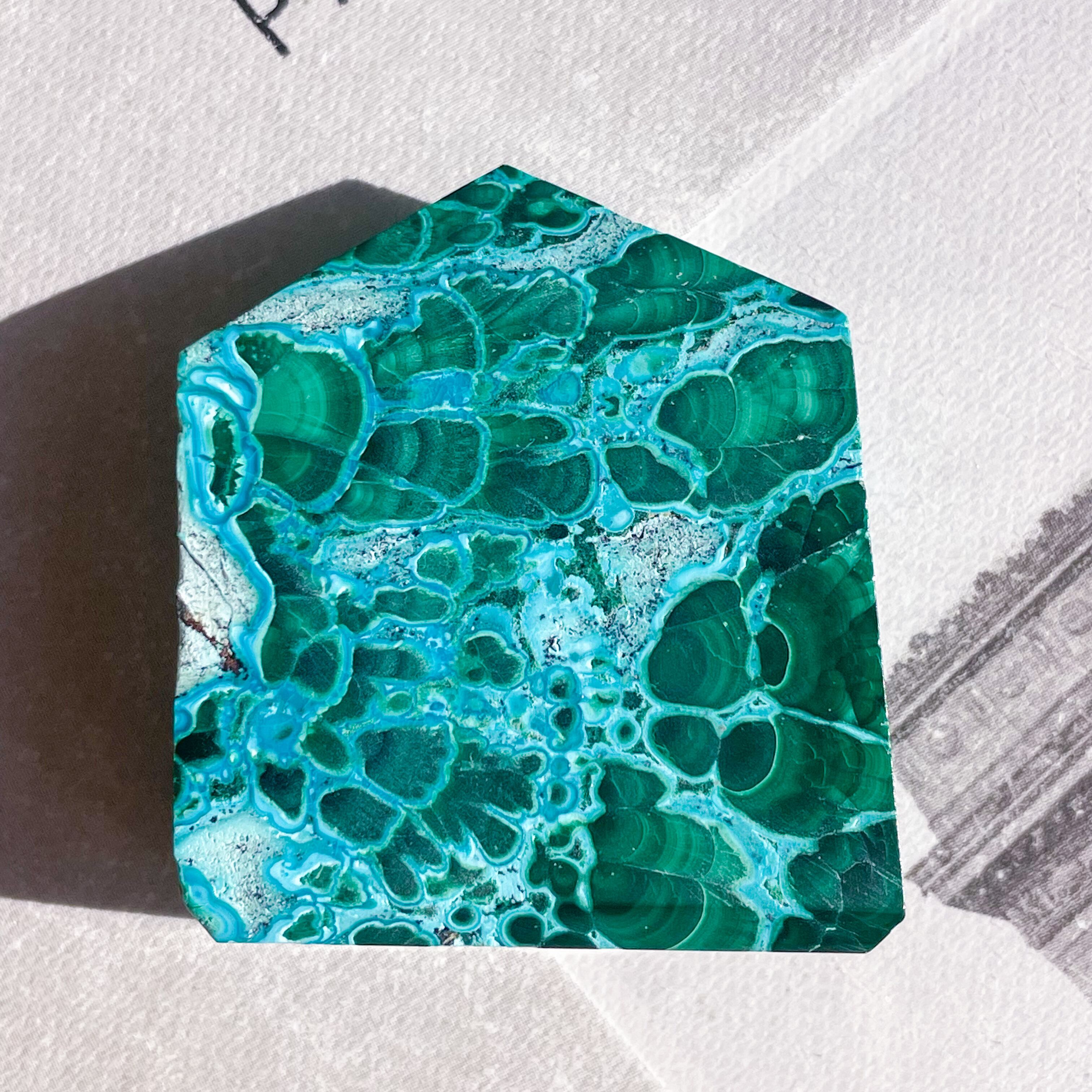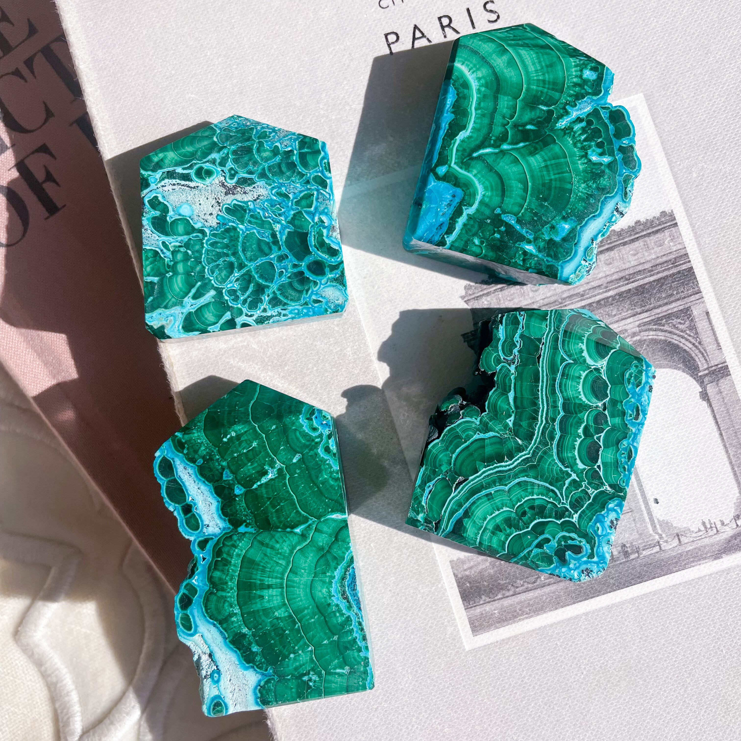 マラカイトの深いグリーン、クリソコラのターコイズブルーのビビッドなコントラスト。
