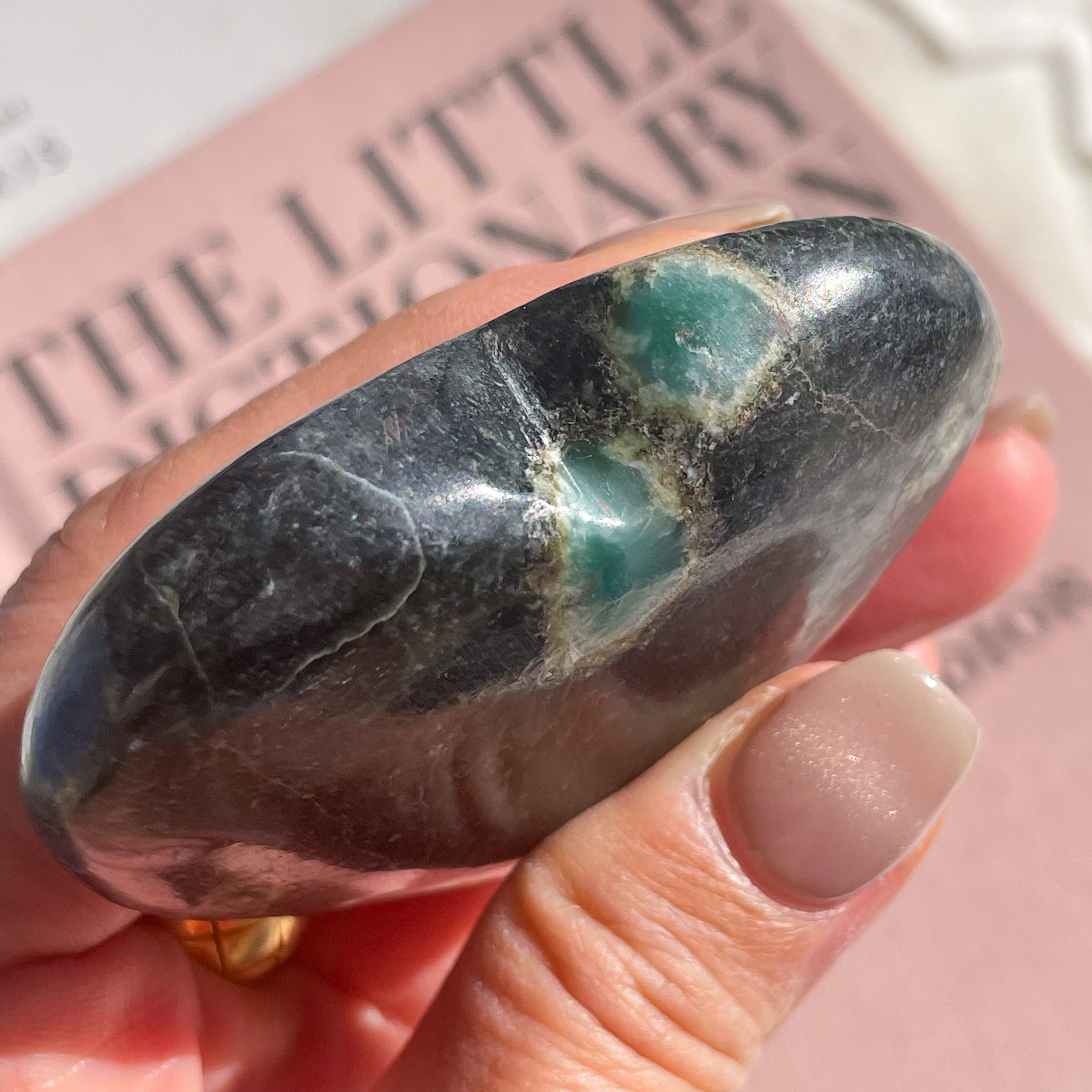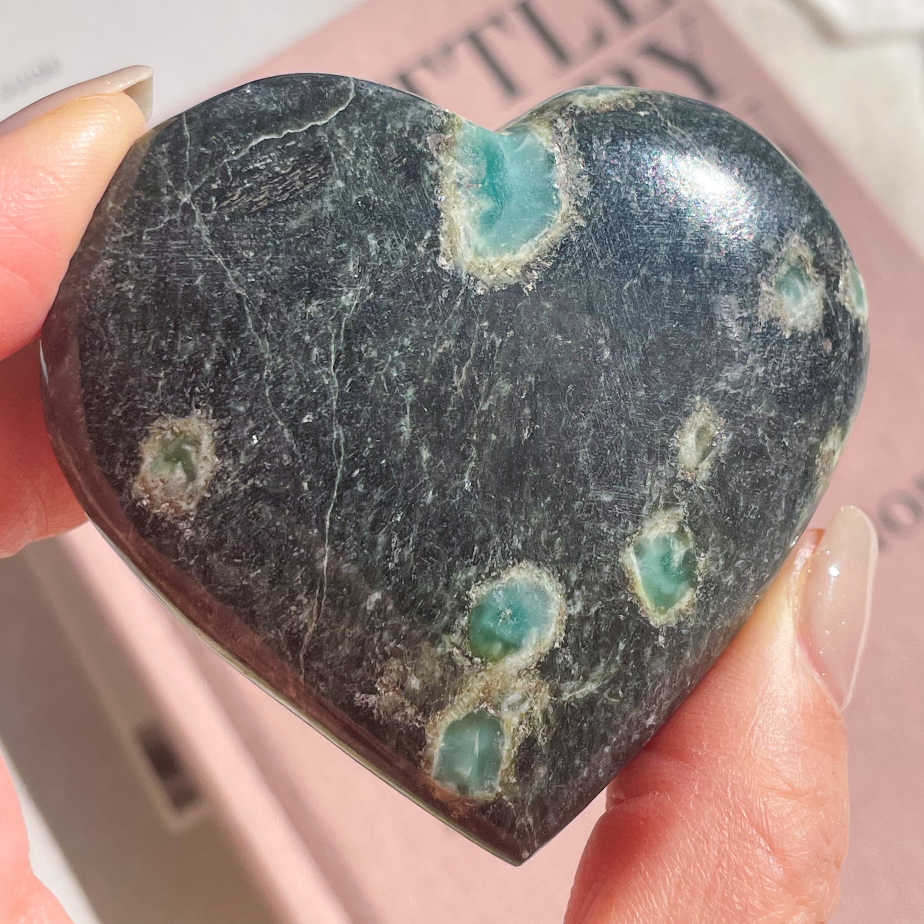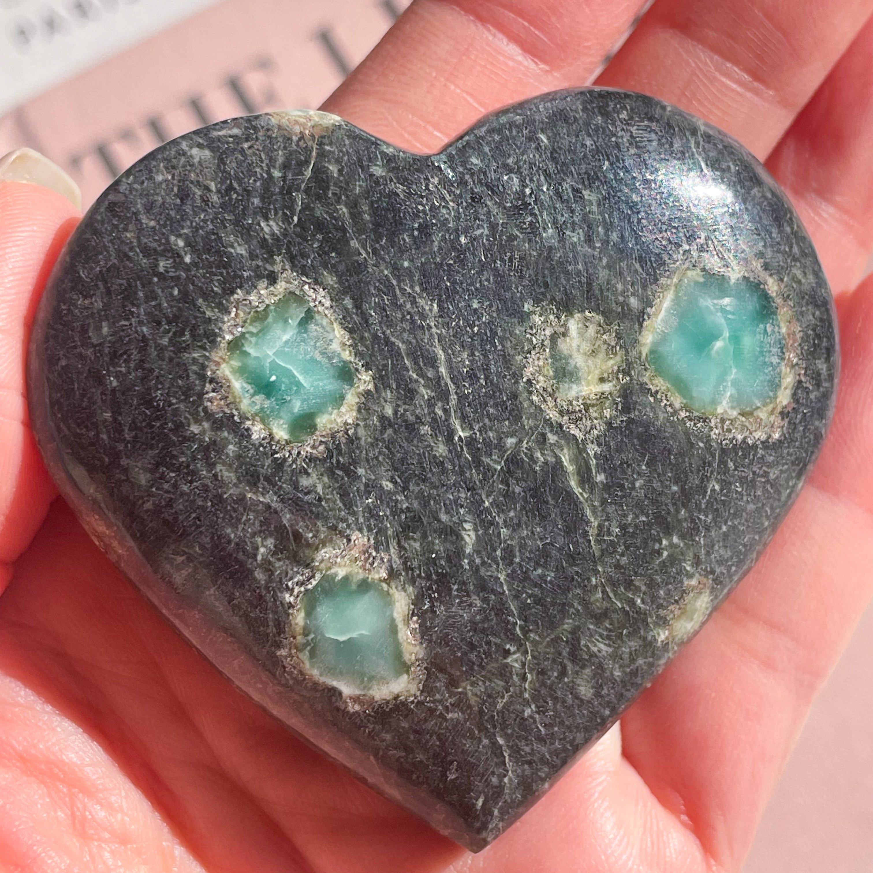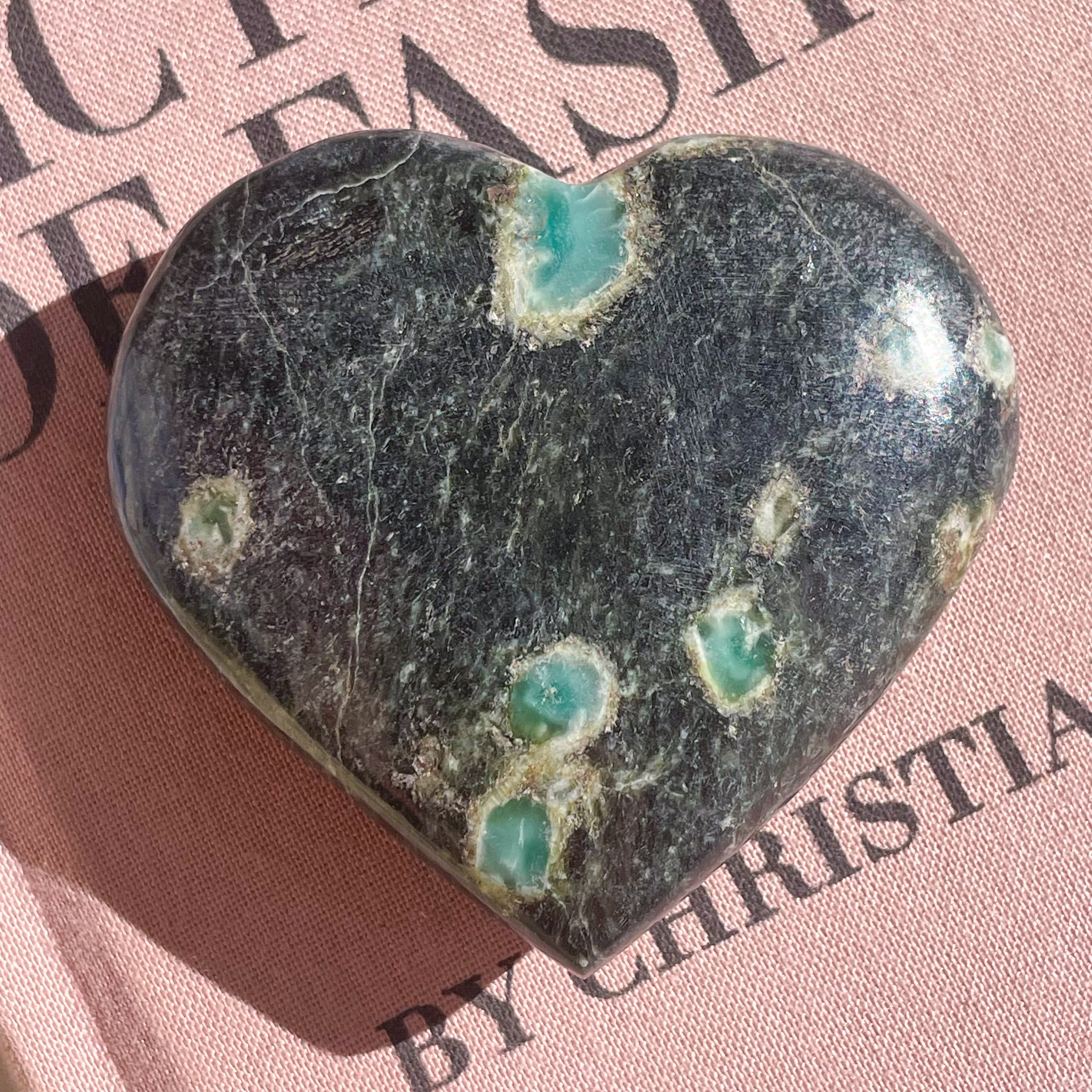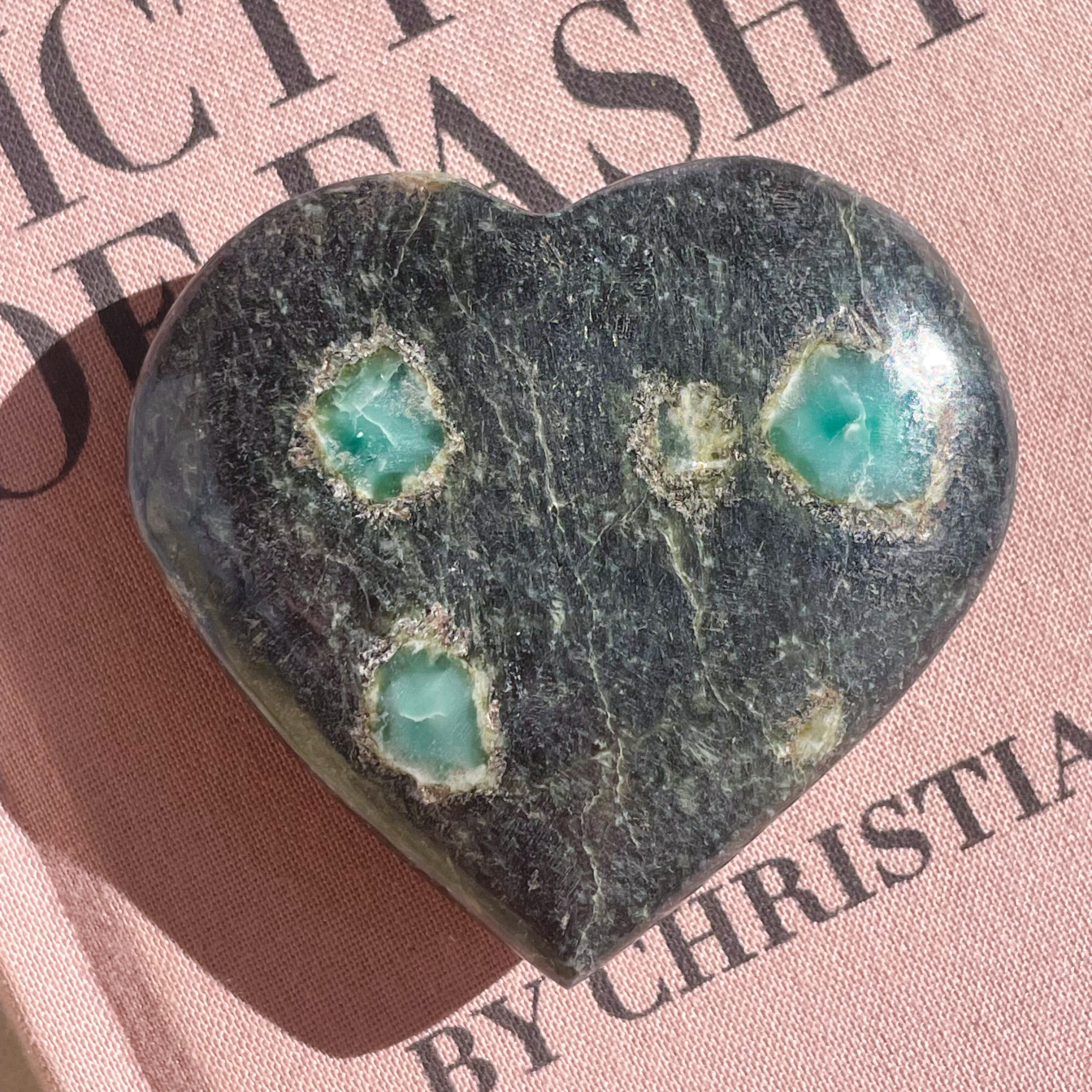 埋め込まれたエメラルド色の宝石♡コランダムのハートです。